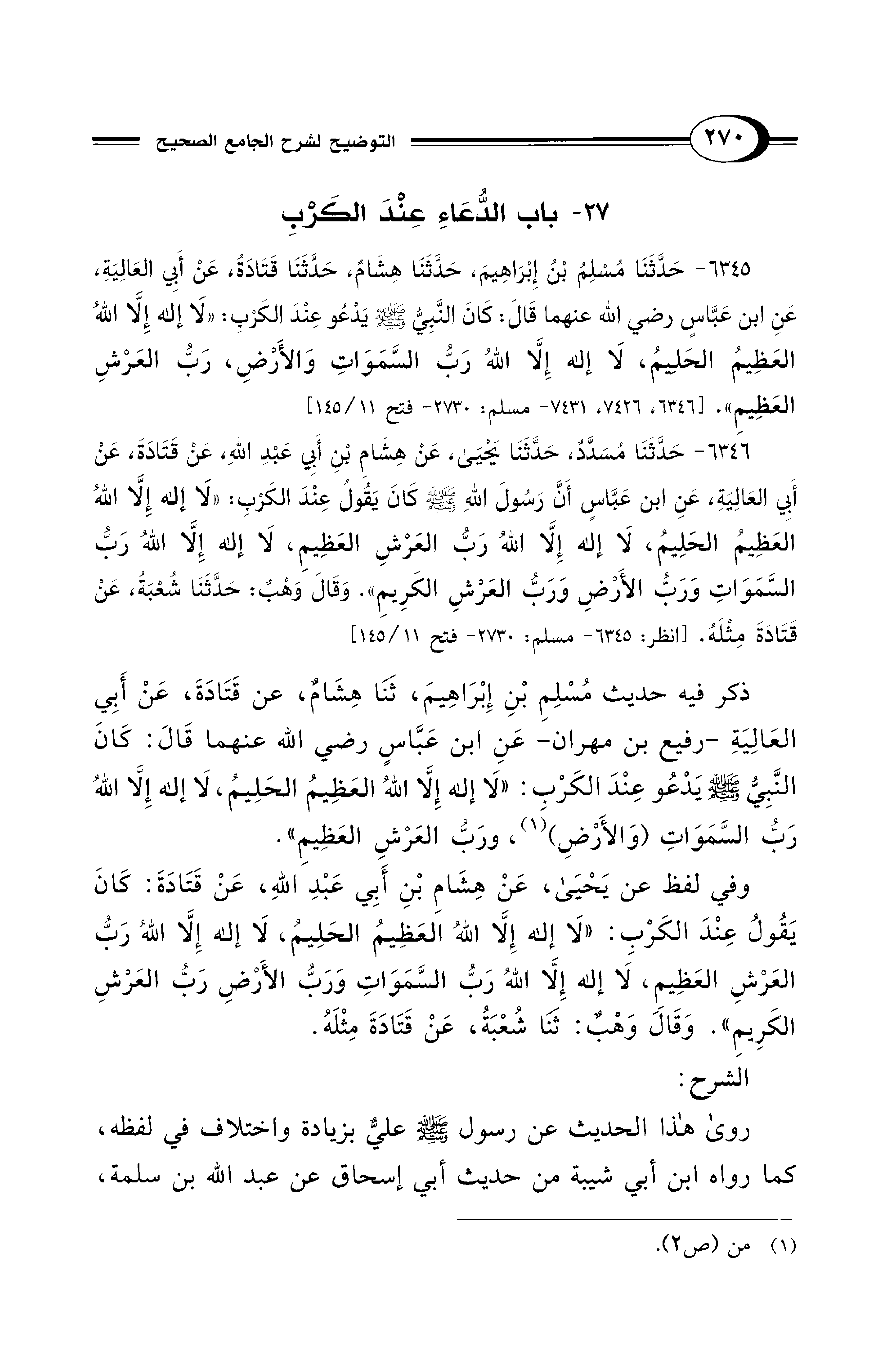 6345 - حَدَّثَنَا مُسْلِمُ بْنُ إِبْرَاهِيمَ، حَدَّثَنَا هِشَامٌ، حَدَّثَنَا قَتَادَةُ، عَنْ أَبِي العَالِيَةِ، عَنِ ابْنِ عَبَّاسٍ - رضي الله عنهما - قَالَ: كَانَ النَّبِيُّ - صلى الله عليه وسلم - يَدْعُو عِنْدَ الْكَرْبِ: «لاَ إِلَهَ إِلاَّ اللهُ الْعَظِيمُ الْحَلِيمُ، لاَ إِلَهَ إِلاَّ اللهُ رَبُّ السَّمَوَاتِ وَالأَرْضِ، رَبُّ الْعَرْشِ الْعَظِيمِ». [6346، 7426، 7431 - مسلم: 2730 - فتح 11/ 145]