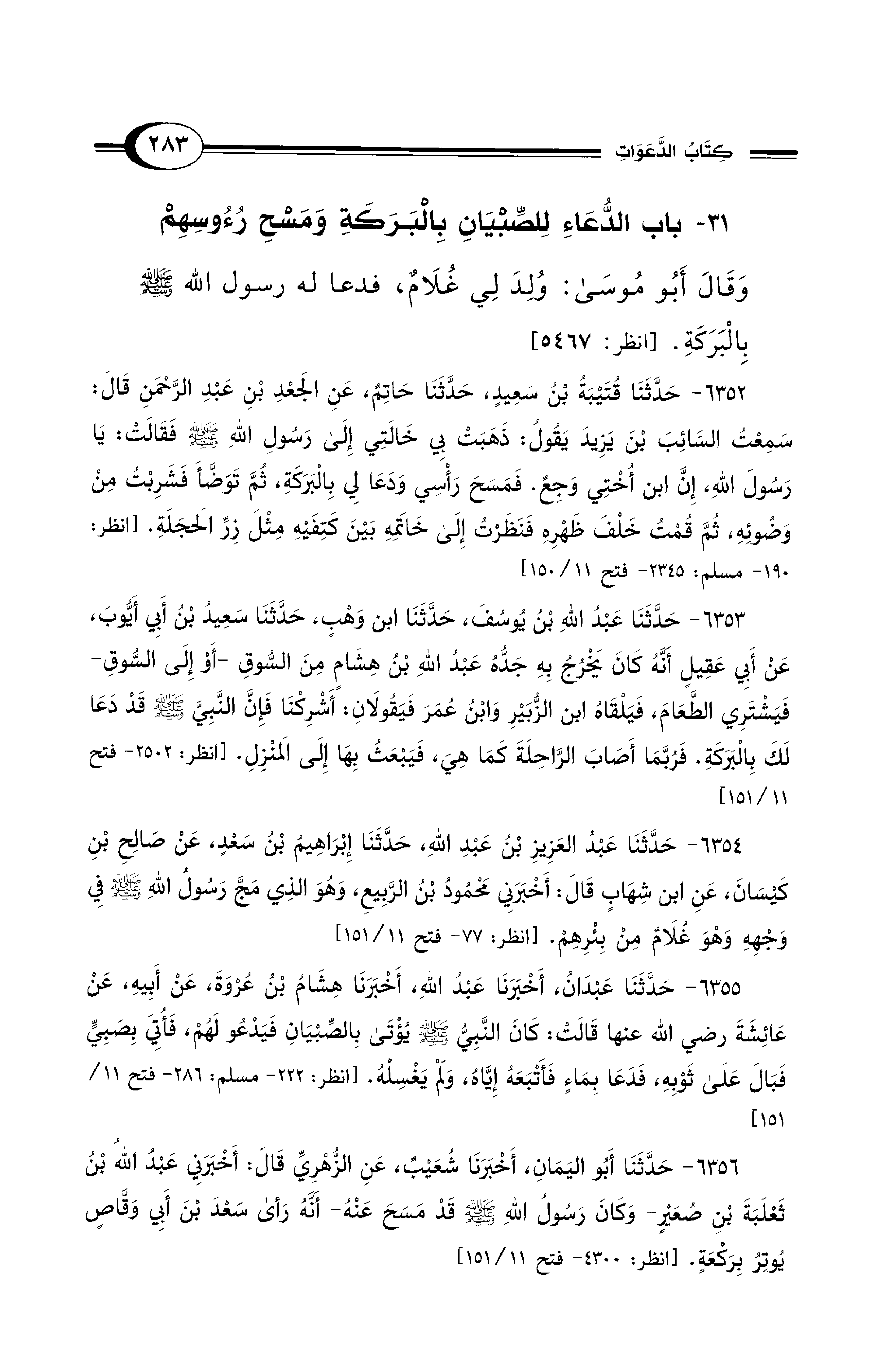 31 - باب الدُّعَاءِ لِلصِّبْيَانِ بِالْبَرَكَةِ وَمَسْحِ رُءُوسِهِمْ