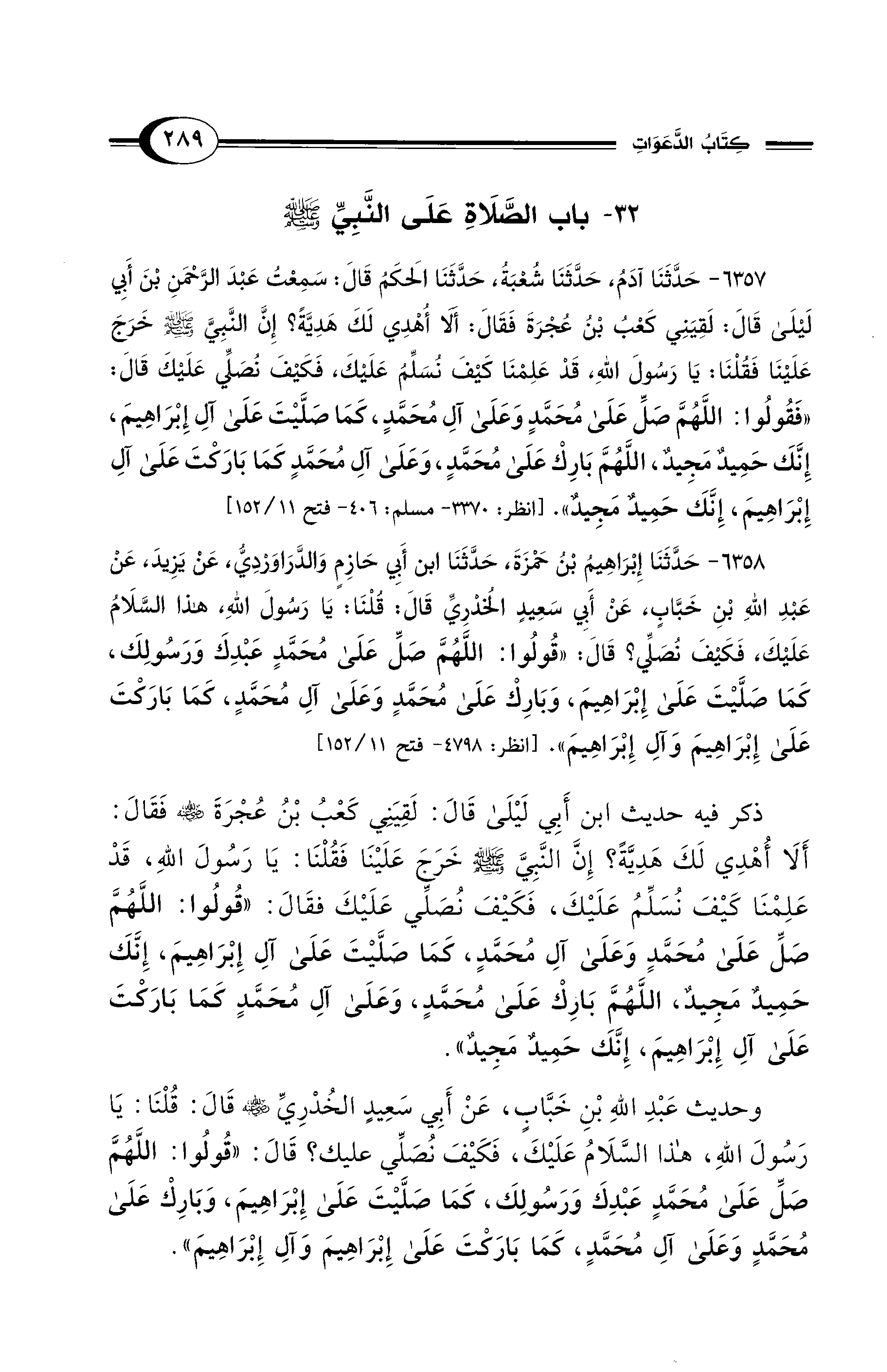 6357 - حَدَّثَنَا آدَمُ، حَدَّثَنَا شُعْبَةُ، حَدَّثَنَا الحَكَمُ قَالَ: سَمِعْتُ عَبْدَ الرَّحْمَنِ بْنَ أَبِي لَيْلَى قَالَ: لَقِيَنِي كَعْبُ بْنُ عُجْرَةَ فَقَالَ: أَلاَ أُهْدِي لَكَ هَدِيَّةً؟ إِنَّ النَّبِيَّ - صلى الله عليه وسلم - خَرَجَ عَلَيْنَا فَقُلْنَا: يَا رَسُولَ اللهِ، قَدْ عَلِمْنَا كَيْفَ نُسَلِّمُ عَلَيْكَ، فَكَيْفَ نُصَلِّي عَلَيْكَ قَالَ: «فَقُولُوا: اللَّهُمَّ صَلِّ عَلَى مُحَمَّدٍ وَعَلَى آلِ مُحَمَّدٍ، كَمَا صَلَّيْتَ عَلَى آلِ إِبْرَاهِيمَ، إِنَّكَ حَمِيدٌ مَجِيدٌ، اللَّهُمَّ بَارِكْ عَلَى مُحَمَّدٍ، وَعَلَى آلِ مُحَمَّدٍ كَمَا بَارَكْتَ عَلَى آلِ إِبْرَاهِيمَ، إِنَّكَ حَمِيدٌ مَجِيدٌ». [انظر: 3370 - مسلم: 406 - فتح 11/ 152]