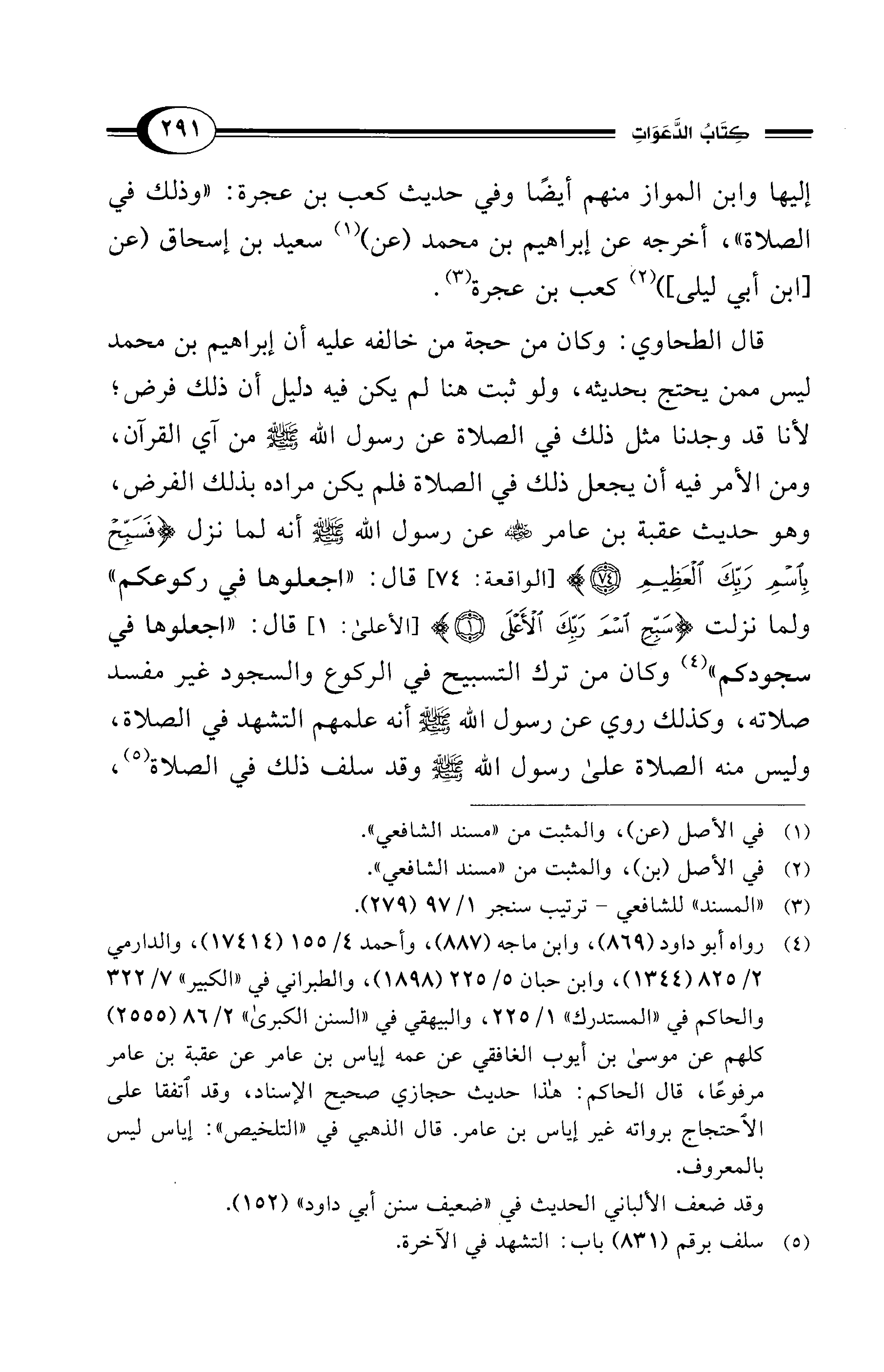 قال الطحاوي: وكان من حجة من خالفه عليه أن إبراهيم بن محمد ليس ممن يحتج بحديثه، ولو ثبت هنا لم يكن فيه دليل أن ذلك فرض؛ لأنا قد وجدنا مثل ذلك في الصلاة عن رسول الله - صلى الله عليه وسلم - من آي القرآن، ومن الأمر فيه أن يجعل ذلك في الصلاة فلم يكن مراده بذلك الفرض، وهو حديث عقبة بن عامر - رضي الله عنه - عن رسول الله - صلى الله عليه وسلم - أنه لما نزل {فَسَبِّحْ بِاسْمِ رَبِّكَ الْعَظِيمِ (74)} [الواقعة: 74] قال: "اجعلوها في ركوعكم" ولما نزلت {سَبِّحِ اسْمَ رَبِّكَ الْأَعْلَى (1)} [الأعلى: 1] قال: "اجعلوها في سجودكم" (¬4) وكان من ترك التسبيح في الركوع والسجود غير مفسد صلاته، وكذلك روي عن رسول الله - صلى الله عليه وسلم - أنه علمهم التشهد في الصلاة، وليس منه الصلاة على رسول الله - صلى الله عليه وسلم - وقد سلف ذلك في الصلاة (¬5)،