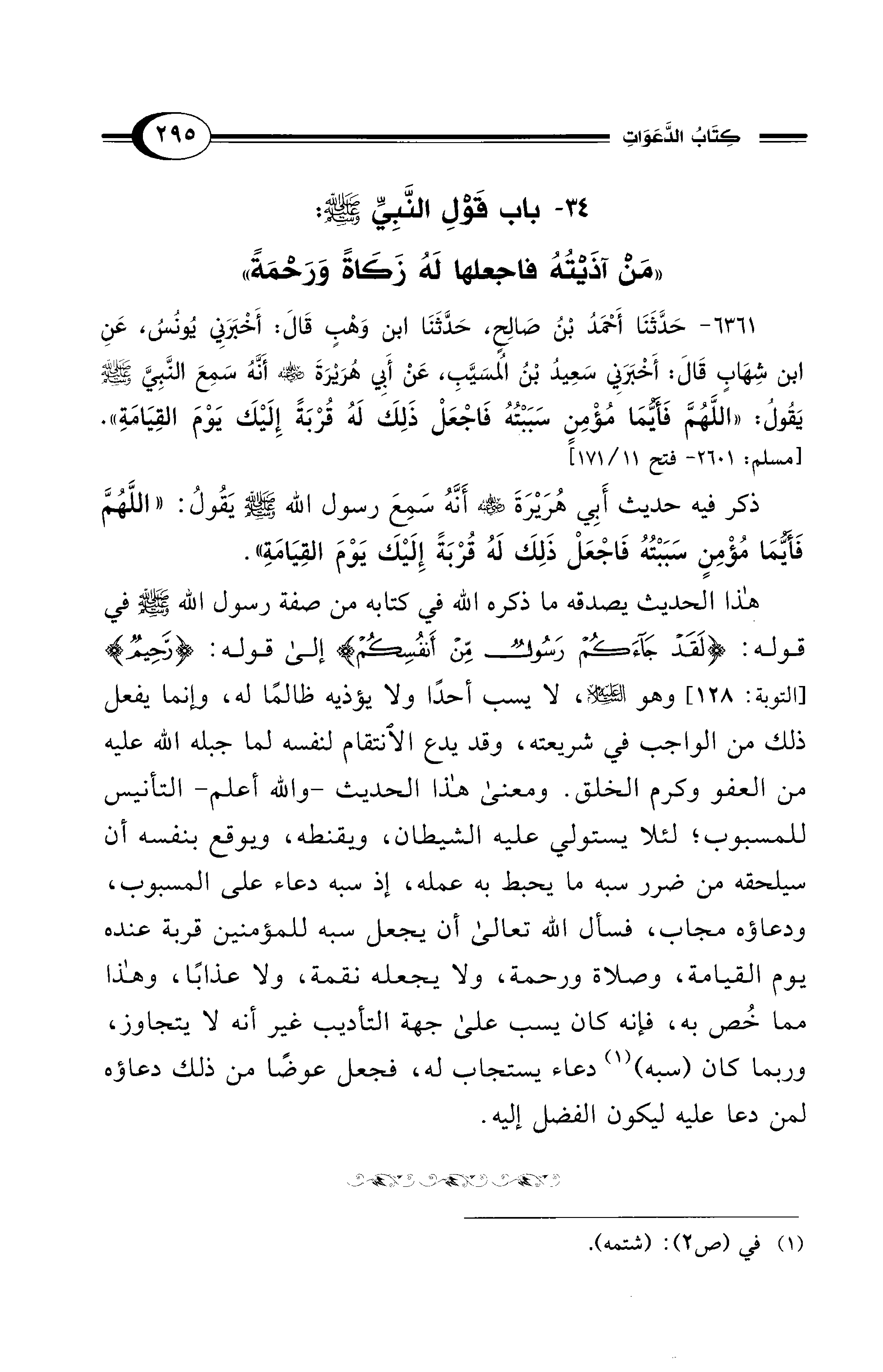 6361 - حَدَّثَنَا أَحْمَدُ بْنُ صَالِحٍ، حَدَّثَنَا ابْنُ وَهْبٍ قَالَ: أَخْبَرَنِي يُونُسُ، عَنِ ابْنِ شِهَابٍ قَالَ: أَخْبَرَنِي سَعِيدُ بْنُ الْمُسَيَّبِ، عَنْ أَبِي هُرَيْرَةَ - رضي الله عنه - أَنَّهُ سَمِعَ النَّبِيَّ - صلى الله عليه وسلم - يَقُولُ: «اللَّهُمَّ فَأَيُّمَا مُؤْمِنٍ سَبَبْتُهُ فَاجْعَلْ ذَلِكَ لَهُ قُرْبَةً إِلَيْكَ يَوْمَ الْقِيَامَةِ». [مسلم: 2601 - فتح 11/ 171]