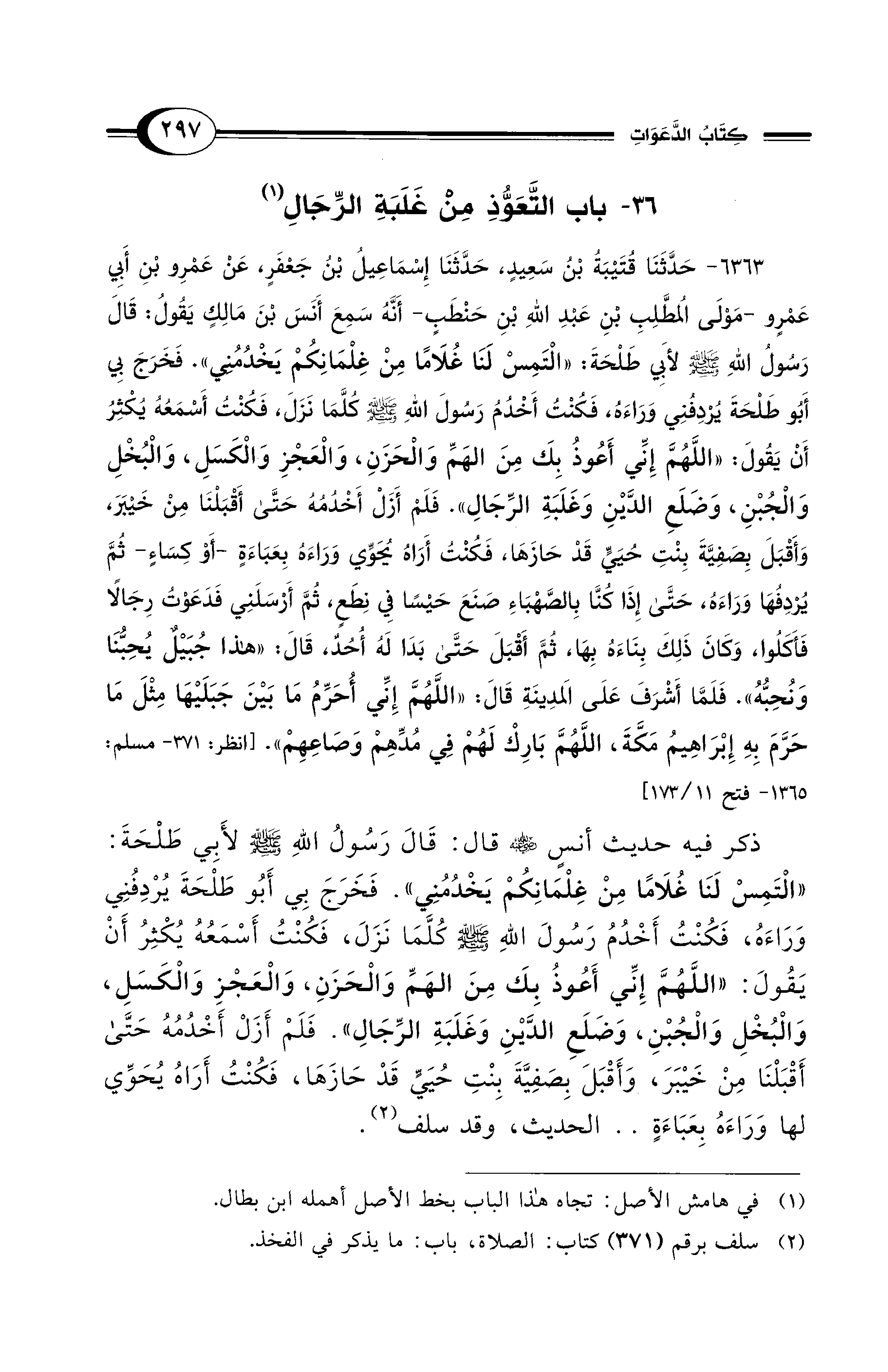6363 - حَدَّثَنَا قُتَيْبَةُ بْنُ سَعِيدٍ، حَدَّثَنَا إِسْمَاعِيلُ بْنُ جَعْفَرٍ، عَنْ عَمْرِو بْنِ أَبِي عَمْرٍو -مَوْلَى الْمُطَّلِبِ بْنِ عَبْدِ اللهِ بْنِ حَنْطَبٍ- أَنَّهُ سَمِعَ أَنَسَ بْنَ مَالِكٍ يَقُولُ: قَالَ رَسُولُ اللهِ - صلى الله عليه وسلم - لأَبِي طَلْحَةَ: «الْتَمِسْ لَنَا غُلاَمًا مِنْ غِلْمَانِكُمْ يَخْدُمُنِي». فَخَرَجَ بِي أَبُو طَلْحَةَ يُرْدِفُنِي وَرَاءَهُ، فَكُنْتُ أَخْدُمُ رَسُولَ اللهِ - صلى الله عليه وسلم - كُلَّمَا نَزَلَ، فَكُنْتُ أَسْمَعُهُ يُكْثِرُ أَنْ يَقُولَ: «اللَّهُمَّ إِنِّي أَعُوذُ بِكَ مِنَ الْهَمِّ وَالْحَزَنِ، وَالْعَجْزِ وَالْكَسَلِ، وَالْبُخْلِ وَالْجُبْنِ، وَضَلَعِ الدَّيْنِ وَغَلَبَةِ الرِّجَالِ». فَلَمْ أَزَلْ أَخْدُمُهُ حَتَّى أَقْبَلْنَا مِنْ خَيْبَرَ، وَأَقْبَلَ بِصَفِيَّةَ بِنْتِ حُيَيٍّ قَدْ حَازَهَا، فَكُنْتُ أَرَاهُ يُحَوِّى وَرَاءَهُ بِعَبَاءَةٍ -أَوْ كِسَاءٍ- ثُمَّ يُرْدِفُهَا وَرَاءَهُ، حَتَّى إِذَا كُنَّا بِالصَّهْبَاءِ صَنَعَ حَيْسًا فِي نِطَعٍ، ثُمَّ أَرْسَلَنِي فَدَعَوْتُ رِجَالاً فَأَكَلُوا، وَكَانَ ذَلِكَ بِنَاءَهُ بِهَا، ثُمَّ أَقْبَلَ حَتَّى بَدَا لَهُ أُحُدٌ، قَالَ: «هَذَا جُبَيْلٌ يُحِبُّنَا وَنُحِبُّهُ». فَلَمَّا أَشْرَفَ عَلَى الْمَدِينَةِ قَالَ: «اللَّهُمَّ إِنِّي أُحَرِّمُ مَا بَيْنَ جَبَلَيْهَا مِثْلَ مَا حَرَّمَ بِهِ إِبْرَاهِيمُ مَكَّةَ، اللَّهُمَّ بَارِكْ لَهُمْ فِي مُدِّهِمْ وَصَاعِهِمْ». [انظر: 371 - مسلم: 1365 - فتح 11/ 173]