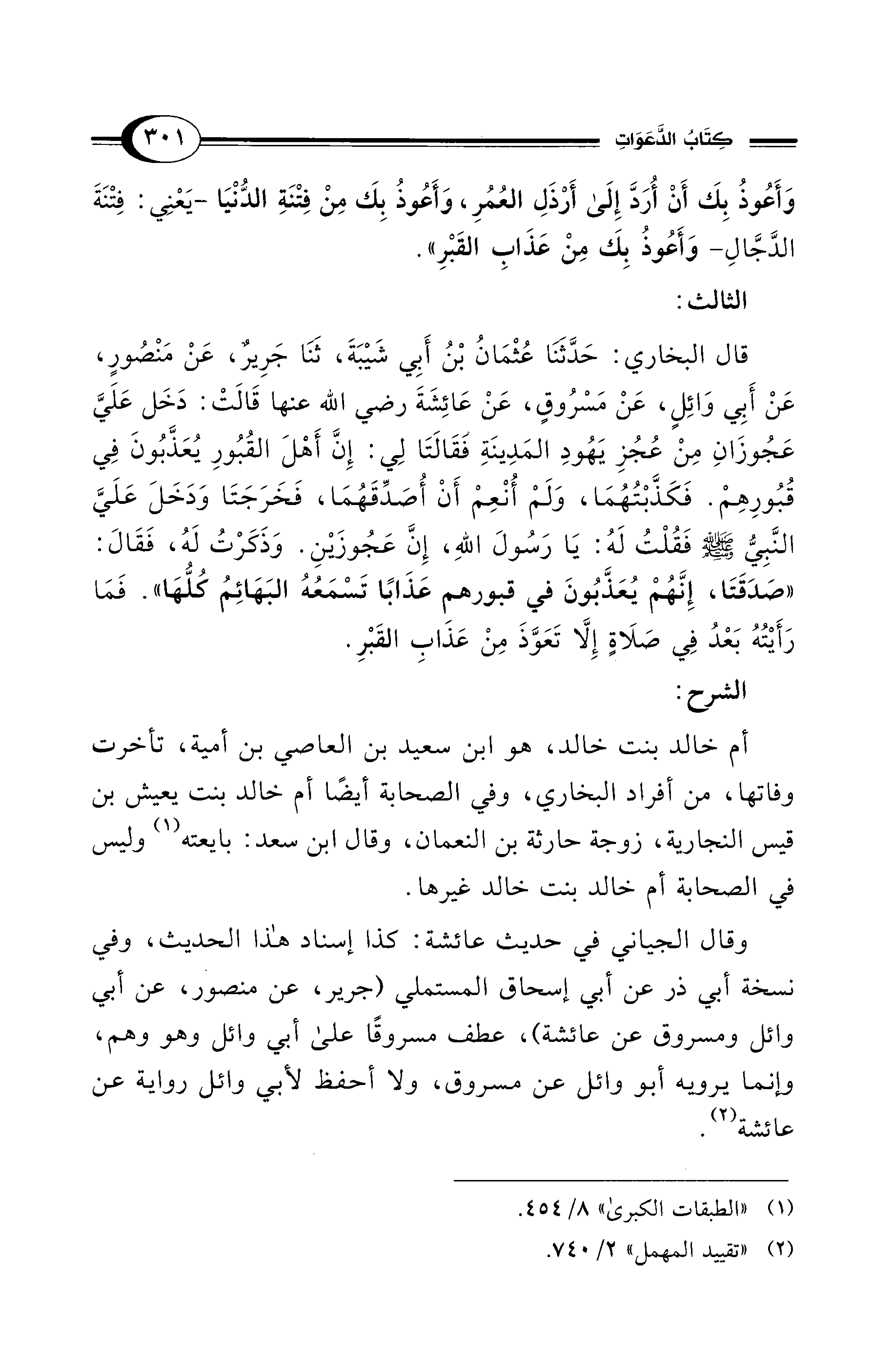 قال البخاري: حَدَّثَنَا عُثْمَانُ بْنُ أَبِي شَيْبَةَ، ثَنَا جَرِيرٌ، عَنْ مَنْصُورٍ، عَنْ أَبِي وَائِلٍ، عَنْ مَسْرُوقٍ، عَنْ عَائِشَةَ - رضي الله عنها - قَالَتْ: دَخَل عَلَيَّ عَجُوزَانِ مِنْ عُجُزِ يَهُودِ المَدِينَةِ فَقَالَتَا لِي: إِنَّ أَهْلَ القُبُورِ يُعَذَّبُونَ فِي قُبُورِهِمْ. فَكَذَّبْتُهُمَا، وَلَمْ أُنْعِمْ أَنْ أُصَدِّقَهُمَا، فَخَرَجَتَا وَدَخَلَ عَلَيَّ النَّبِيُّ - صلى الله عليه وسلم - فَقُلْتُ لَهُ: يَا رَسُولَ اللهِ، إِنَّ عَجُوزينِ. وَذَكَرْتُ لَهُ، فَقَالَ: "صَدَقَتَا، إِنَّهُمْ يُعَذَّبُونَ في قبورهم عَذَابًا تَسْمَعُهُ البَهَائِمُ كُلُّهَا". فَمَا رَأَيْتُهُ بَعْدُ فِي صَلَاةٍ إِلَّا تَعَوَّذَ مِنْ عَذَابِ القَبْرِ.