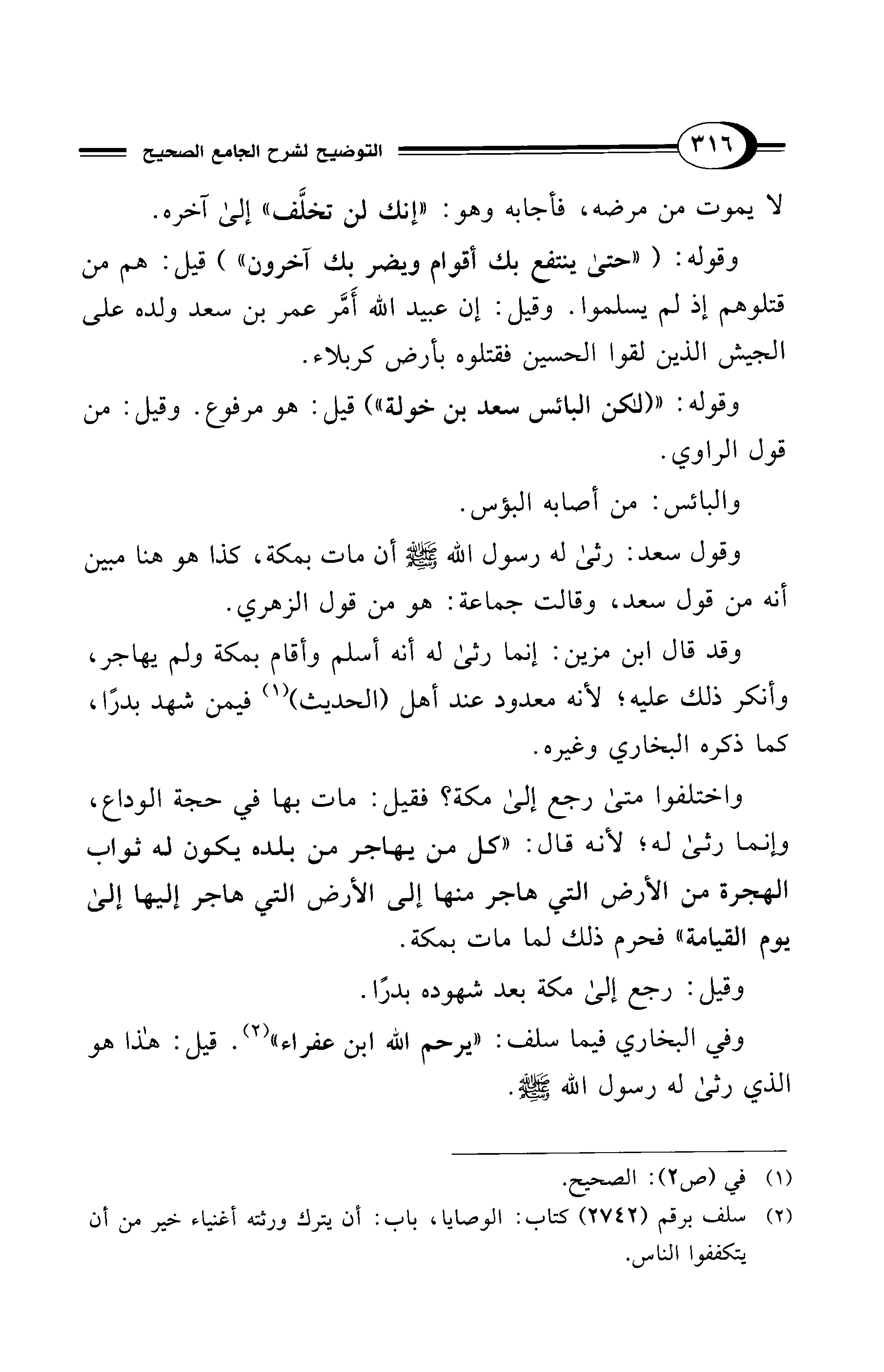 (¬2) سلف برقم (2742) كتاب: الوصايا، باب: أن يترك ورثته أغنياء خير من أن يتكففوا الناس.