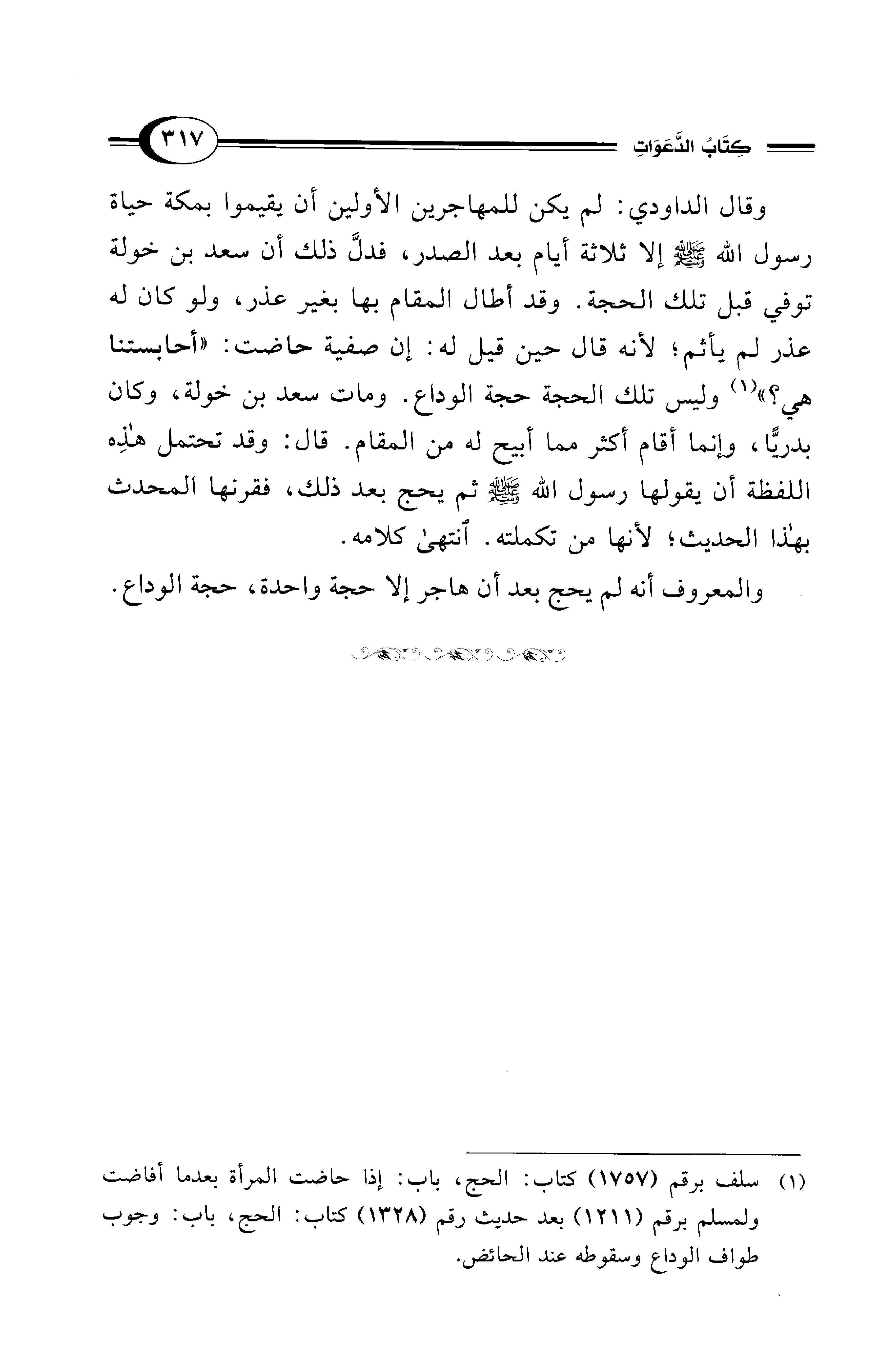 وقال الداودي: لم يكن للمهاجرين الأولين أن يقيموا بمكة حياة رسول الله - صلى الله عليه وسلم - إلا ثلاثة أيام بعد الصدر، فدلَّ ذلك أن سعد بن خولة توفي قبل تلك الحجة. وقد أطال المقام بها بغير عذر، ولو كان له عذر لم يأثم؛ لأنه قال حين قيل له: إن صفية حاضت: "أحابستنا هي؟ " (¬1) وليس تلك الحجة حجة الوداع. ومات سعد بن خولة، وكان بدريًّا، وإنما أقام أكثر مما أبيح له من المقام. قال: وقد تحتمل هذِه اللفظة أن يقولها رسول الله - صلى الله عليه وسلم - ثم يحج بعد ذلك، فقرنها المحدث بهذا الحديث؛ لأنها من تكملته. انتهى كلامه.