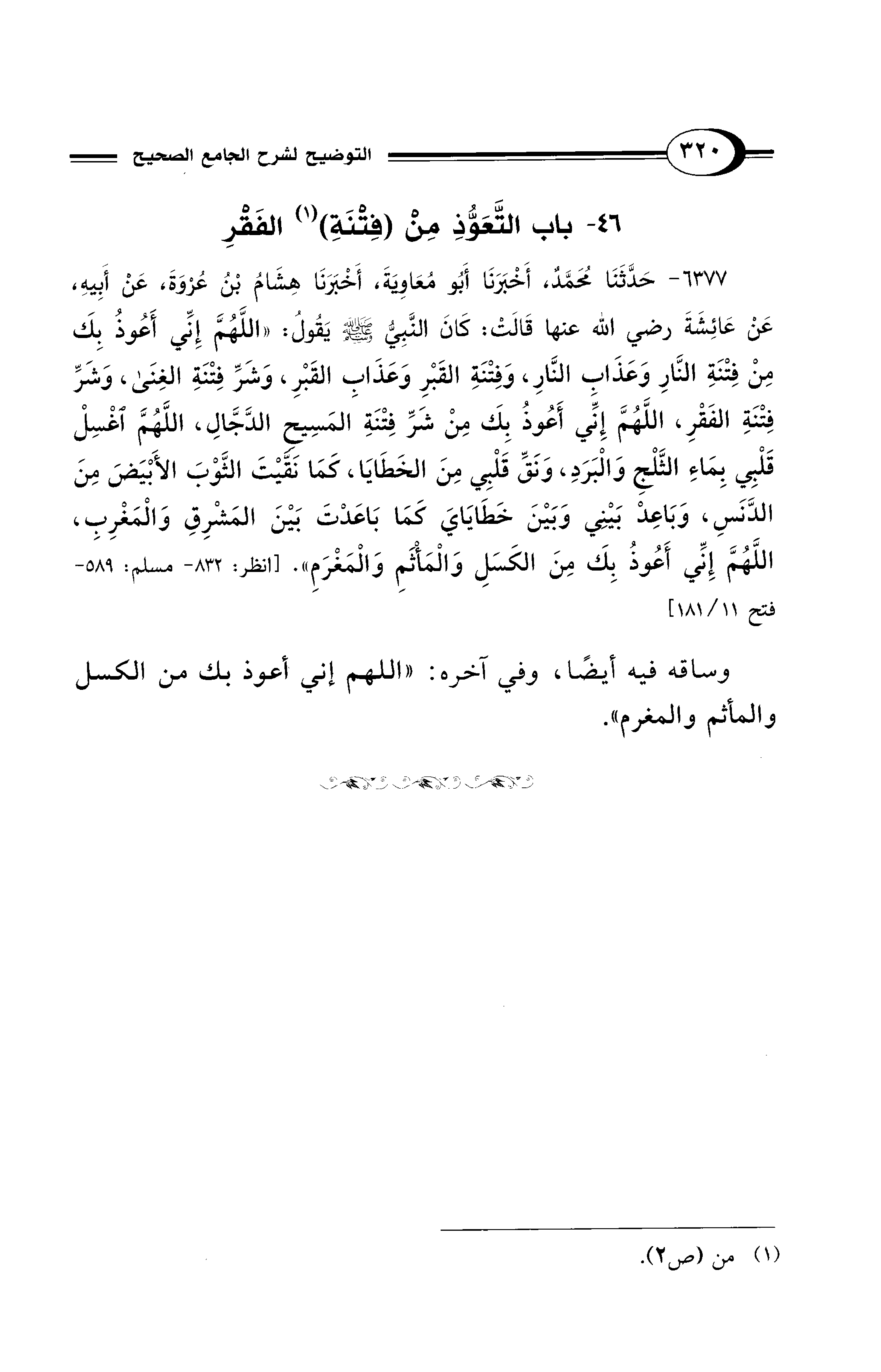 6377 - حَدَّثَنَا مُحَمَّدٌ، أَخْبَرَنَا أَبُو مُعَاوِيَةَ، أَخْبَرَنَا هِشَامُ بْنُ عُرْوَةَ، عَنْ أَبِيهِ، عَنْ عَائِشَةَ - رضي الله عنها - قَالَتْ: كَانَ النَّبِيُّ - صلى الله عليه وسلم - يَقُولُ: «اللَّهُمَّ إِنِّي أَعُوذُ بِكَ مِنْ فِتْنَةِ النَّارِ وَعَذَابِ النَّارِ، وَفِتْنَةِ القَبْرِ وَعَذَابِ القَبْرِ، وَشَرِّ فِتْنَةِ الغِنَى، وَشَرِّ فِتْنَةِ الفَقْرِ، اللَّهُمَّ إِنِّي أَعُوذُ بِكَ مِنْ شَرِّ فِتْنَةِ المَسِيحِ الدَّجَّالِ، اللَّهُمَّ اغْسِلْ قَلْبِي بِمَاءِ الثَّلْجِ وَالْبَرَدِ، وَنَقِّ قَلْبِي مِنَ الخَطَايَا، كَمَا نَقَّيْتَ الثَّوْبَ الأَبْيَضَ مِنَ الدَّنَسِ، وَبَاعِدْ بَيْنِي وَبَيْنَ خَطَايَايَ كَمَا بَاعَدْتَ بَيْنَ المَشْرِقِ وَالْمَغْرِبِ، اللَّهُمَّ إِنِّي أَعُوذُ بِكَ مِنَ الْكَسَلِ وَالْمَأْثَمِ وَالْمَغْرَمِ». [انظر: 832 - مسلم: 589 - فتح 11/ 181]