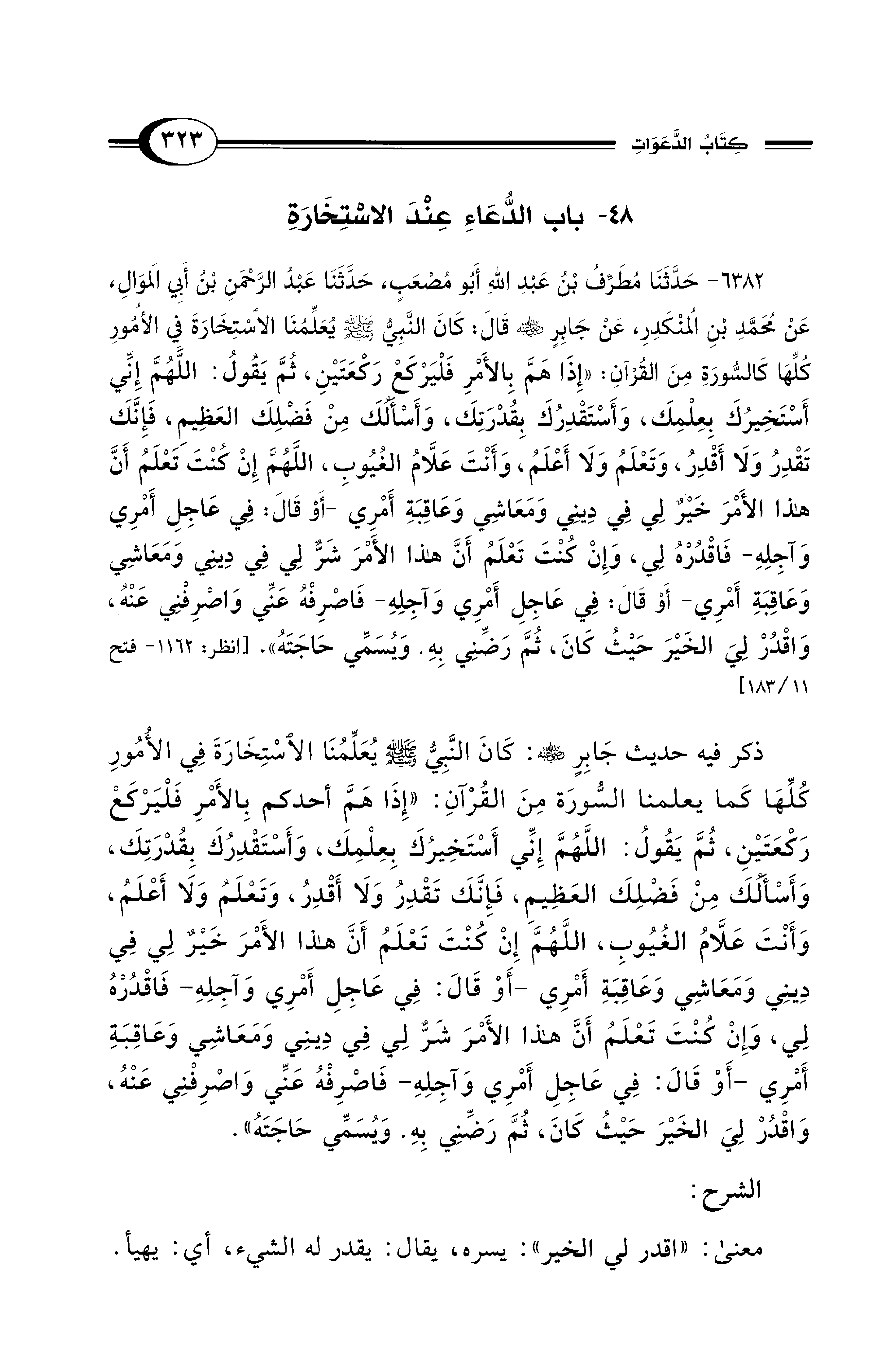 ذكر فيه حديث جَابِرٍ - رضي الله عنه -: كَانَ النَّبِيُّ - صلى الله عليه وسلم - يُعَلِّمُنَا الاسْتِخَارَةَ فِي الأُمُورِ كُلِّهَا كَما يعلمنا السُّورَة مِنَ القُرْآنِ: "إِذَا هَمَّ أحدكم بِالأَمْرِ فَلْيَرْكَعْ رَكْعَتَيْنِ، ثُمَّ يَقُولُ: اللَّهُمَّ إِنِّي أَسْتَخِيرُكَ بِعِلْمِكَ، وَأَسْتَقْدِرُكَ بِقُدْرَتِكَ، وَأَسْأَلُكَ مِنْ فَضْلِكَ العَظِيمِ، فَإِنَّكَ تَقْدِرُ وَلَا أَقْدِرُ، وَتَعْلَمُ وَلَا أَعْلَمُ، وَأَنْتَ عَلَّامُ الغُيُوبِ، اللَّهُمَّ إِنْ كُنْتَ تَعْلَمُ أَنَّ هذا الأَمْرَ خَيْرٌ لِي فِي دِينِي وَمَعَاشِي وَعَاقِبَةِ أَمْرِي -أَوْ قَالَ: فِي عَاجِلِ أَمْرِي وَآجِلِهِ- فَاقْدُرْهُ لِي، وَإِنْ كُنْتَ تَعْلَمُ أَنَّ هذا الأَمْرَ شَرٌّ لِي فِي دِينِي وَمَعَاشِي وَعَاقِبَةِ أَمْرِي -أَوْ قَالَ: فِي عَاجِلِ أَمْرِي وَآجِلِهِ- فَاصْرِفْهُ عَنِّي وَاصْرِفْنِي عَنْهُ، وَاقْدُرْ لِيَ الخَيْرَ حَيْثُ كَانَ، ثُمَّ رَضِّنِي بِهِ. وَيُسَمِّي حَاجَتَهُ".
