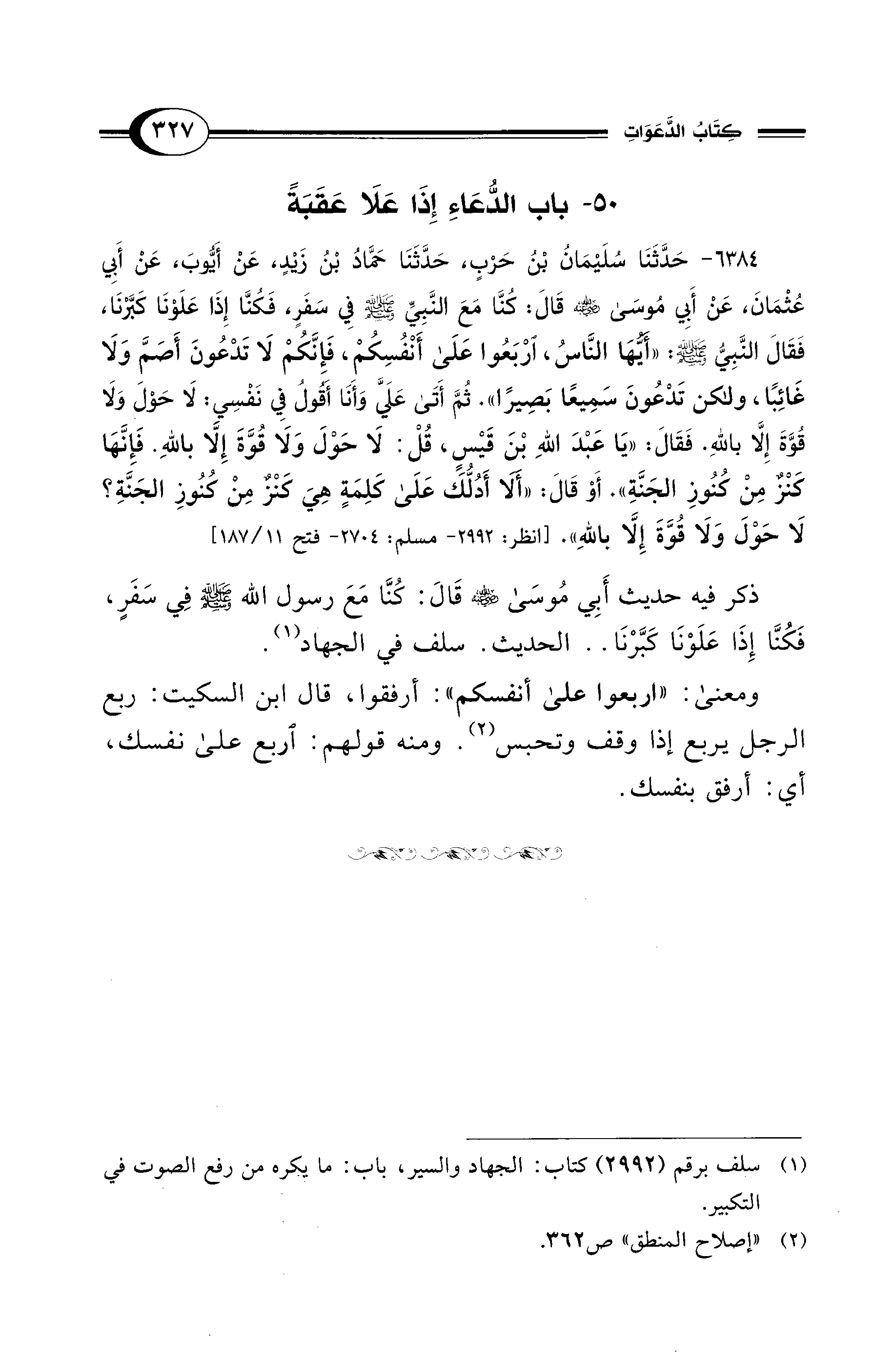 6384 - حَدَّثَنَا سُلَيْمَانُ بْنُ حَرْبٍ، حَدَّثَنَا حَمَّادُ بْنُ زَيْدٍ، عَنْ أَيُّوبَ، عَنْ أَبِي عُثْمَانَ، عَنْ أَبِي مُوسَى - رضي الله عنه - قَالَ: كُنَّا مَعَ النَّبِيِّ - صلى الله عليه وسلم - فِي سَفَرٍ، فَكُنَّا إِذَا عَلَوْنَا كَبَّرْنَا، فَقَالَ النَّبِيُّ - صلى الله عليه وسلم -: «أَيُّهَا النَّاسُ، ارْبَعُوا عَلَى أَنْفُسِكُمْ، فَإِنَّكُمْ لاَ تَدْعُونَ أَصَمَّ وَلاَ غَائِبًا، وَلَكِنْ تَدْعُونَ سَمِيعًا بَصِيرًا». ثُمَّ أَتَى عَلَيَّ وَأَنَا أَقُولُ فِي نَفْسِي: لاَ حَوْلَ وَلاَ قُوَّةَ إِلاَّ بِاللهِ. فَقَالَ: «يَا عَبْدَ اللهِ بْنَ قَيْسٍ، قُلْ: لاَ حَوْلَ وَلاَ قُوَّةَ إِلاَّ بِاللهِ. فَإِنَّهَا كَنْزٌ مِنْ كُنُوزِ الْجَنَّةِ». أَوْ قَالَ: «أَلاَ أَدُلُّكَ عَلَى كَلِمَةٍ هِيَ كَنْزٌ مِنْ كُنُوزِ الْجَنَّةِ؟ لاَ حَوْلَ وَلاَ قُوَّةَ إِلاَّ بِاللهِ». [انظر: 2992 - مسلم: 2704 - فتح 11/ 187]