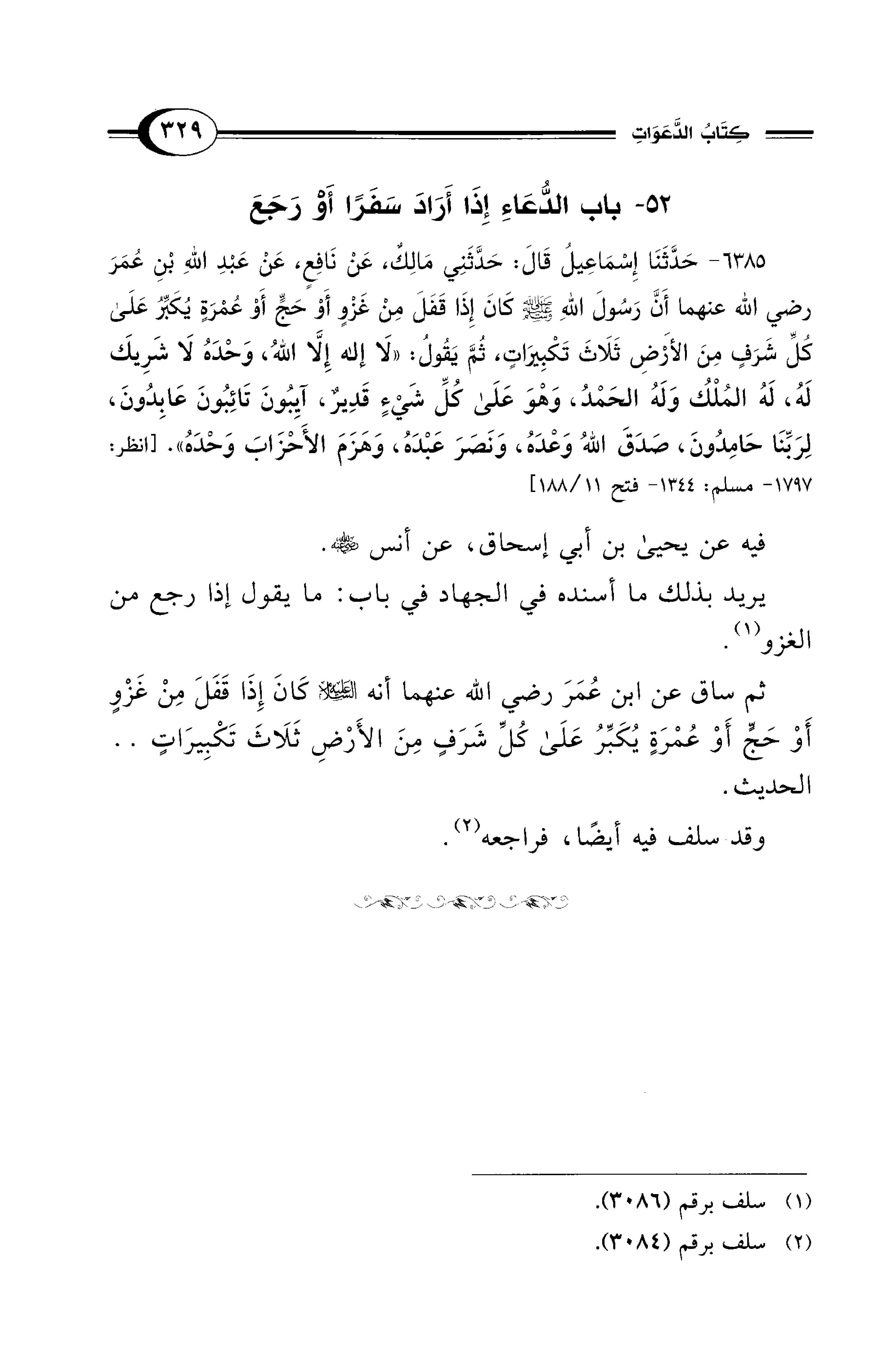 6385 - حَدَّثَنَا إِسْمَاعِيلُ قَالَ: حَدَّثَنِي مَالِكٌ، عَنْ نَافِعٍ، عَنْ عَبْدِ اللهِ بْنِ عُمَرَ - رضي الله عنهما - أَنَّ رَسُولَ اللهِ - صلى الله عليه وسلم - كَانَ إِذَا قَفَلَ مِنْ غَزْوٍ أَوْ حَجٍّ أَوْ عُمْرَةٍ يُكَبِّرُ عَلَى كُلِّ شَرَفٍ مِنَ الأَرْضِ ثَلاَثَ تَكْبِيرَاتٍ، ثُمَّ يَقُولُ: «لاَ إِلَهَ إِلاَّ اللهُ، وَحْدَهُ لاَ شَرِيكَ لَهُ، لَهُ الْمُلْكُ وَلَهُ الْحَمْدُ، وَهْوَ عَلَى كُلِّ شَيْءٍ قَدِيرٌ، آيِبُونَ تَائِبُونَ عَابِدُونَ، لِرَبِّنَا حَامِدُونَ، صَدَقَ اللهُ وَعْدَهُ، وَنَصَرَ عَبْدَهُ، وَهَزَمَ الأَحْزَابَ وَحْدَهُ». [انظر: 1797 - مسلم: 1344 - فتح 11/ 188]