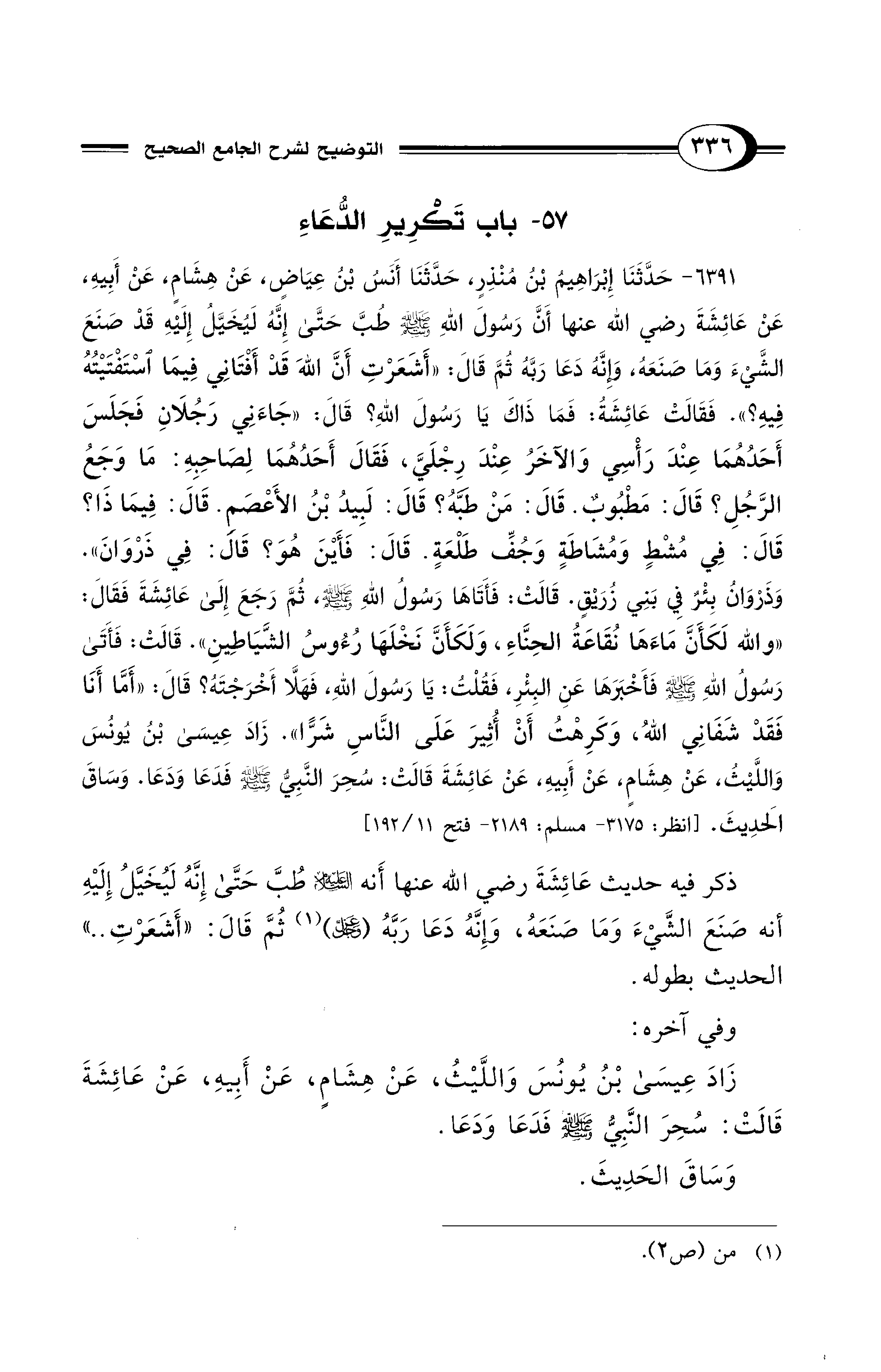 زَادَ عِيسَى بْنُ يُونُسَ وَاللَّيْثُ، عَنْ هِشَامٍ، عَنْ أَبِيهِ، عَنْ عَائِشَةَ قَالَتْ: سُحِرَ النَّبِيُّ - صلى الله عليه وسلم - فَدَعَا وَدَعَا.