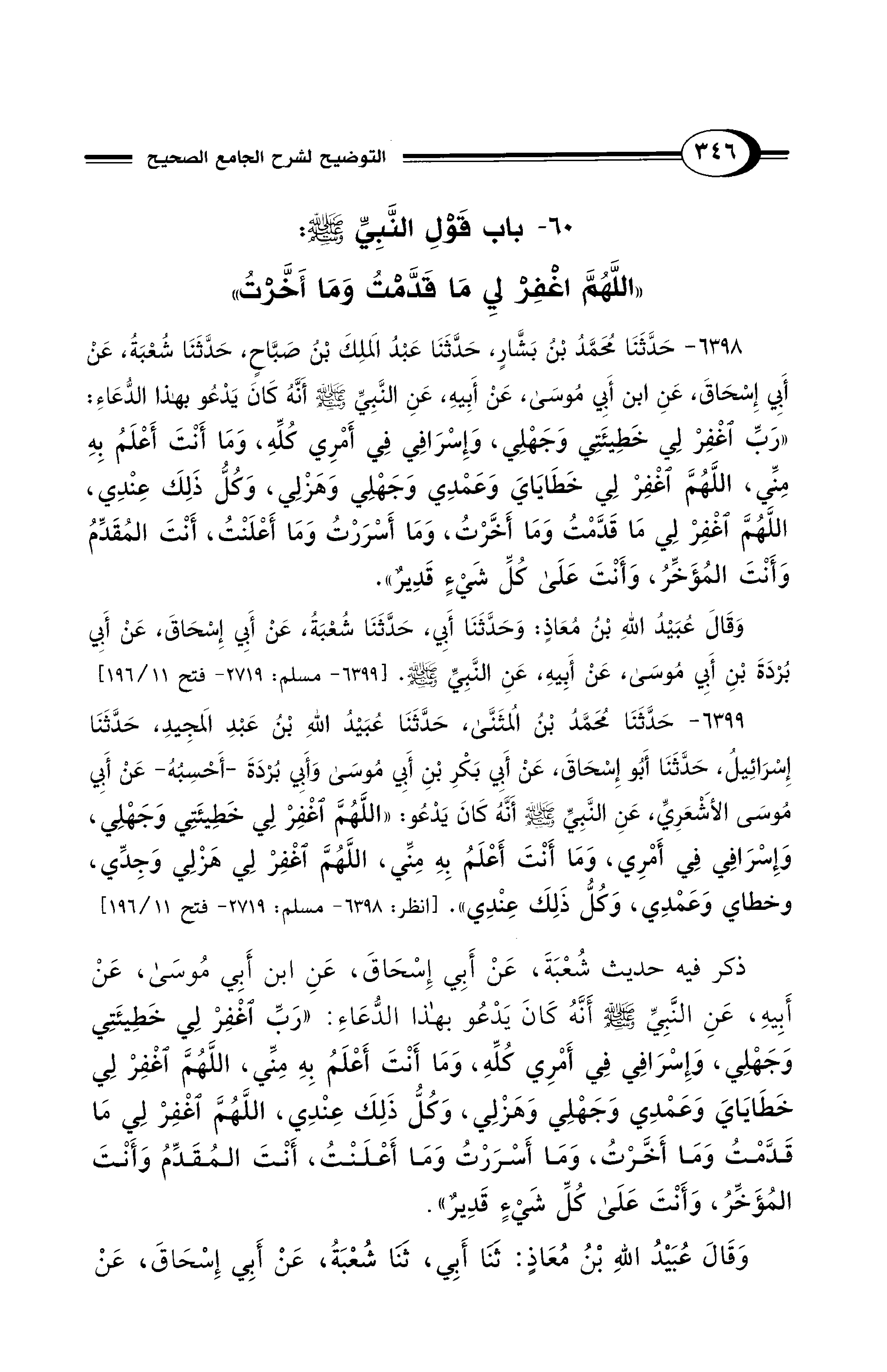 ذكر فيه حديث شُعْبَةَ، عَنْ أَبِي إِسْحَاقَ، عَنِ ابن أَبِي مُوسَى، عَنْ أَبِيهِ، عَنِ النَّبِيِّ - صلى الله عليه وسلم - أَنَّهُ كَانَ يَدْعُو بهذا الدُّعَاءِ: "رَبِّ اغْفِرْ لِي خَطِيئَتِي وَجَهْلِي، وَإِسْرَافِي فِي أَمْرِي كُلِّهِ، وَمَا أَنْتَ أَعْلَمُ بِهِ مِنِّي، اللَّهُمَّ اغْفِرْ لِي خَطَايَايَ وَعَمْدِي وَجَهْلِي وَهَزْلِي، وَكُلُّ ذَلِكَ عِنْدِي، اللَّهُمَّ اغْفِرْ لِي مَا قَدَّمْتُ وَمَا أَخَّرْتُ، وَمَا أَسْرَرْتُ وَمَا أَعْلَنْتُ، أَنْتَ المُقَدِّمُ وَأَنْتَ المُؤَخِّرُ، وَأَنْتَ عَلَى كُلِّ شَيْءٍ قَدِيرٌ".