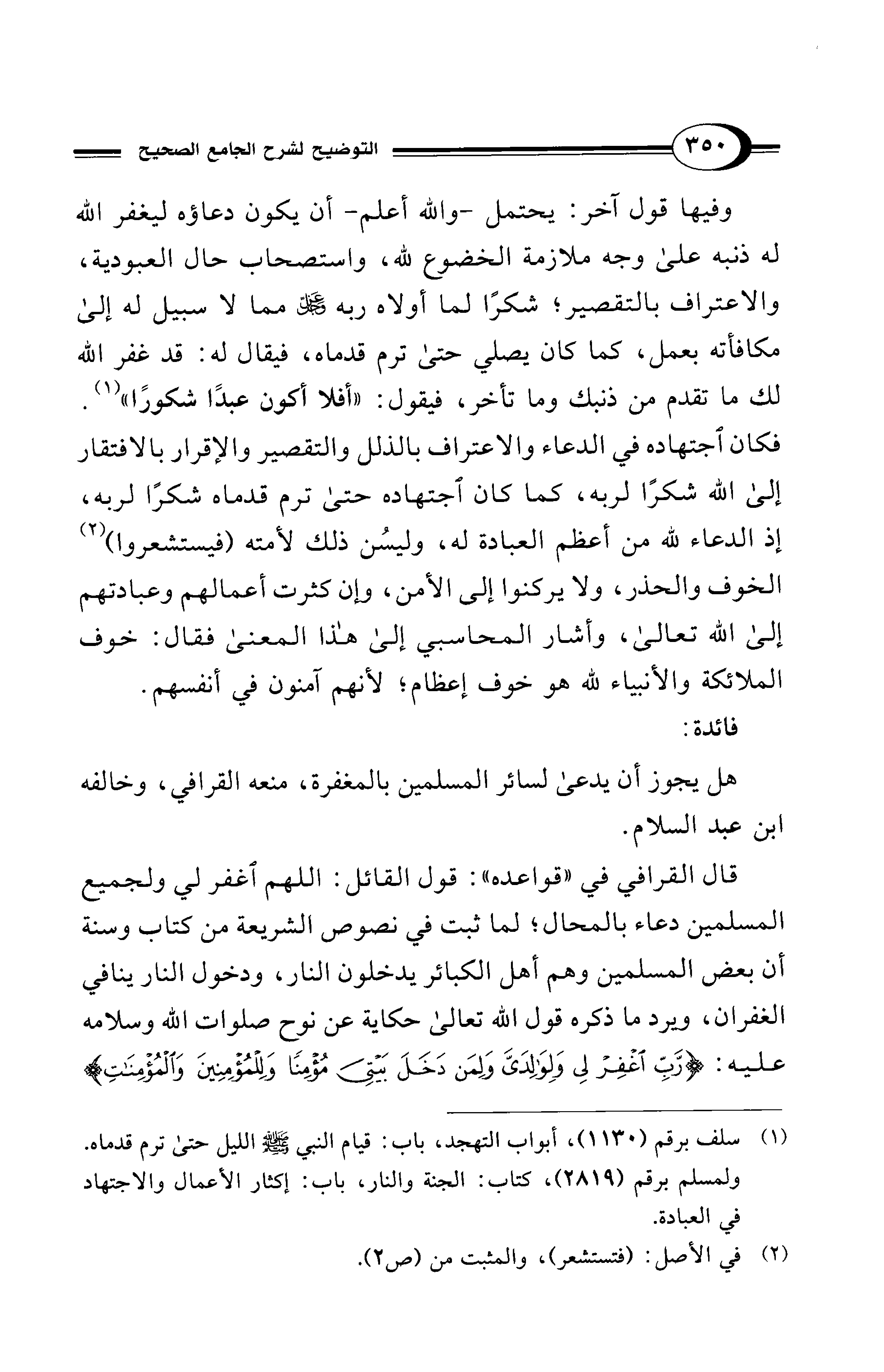 وفيها قول آخر: يحتمل -والله أعلم- أن يكون دعاؤه ليغفر الله له ذنبه على وجه ملازمة الخضوع لله، واستصحاب حال العبودية، والاعتراف بالتقصير؛ شكرًا لما أولاه ربه -عَزَّ وَجَلَّ- مما لا سبيل له إلى مكافأته بعمل، كما كان يصلي حتى ترم قدماه، فيقال له: قد غفر الله لك ما تقدم من ذنبك وما تأخر، فيقول: "أفلا أكون عبدًا شكورًا" (¬1). فكان اجتهاده في الدعاء والاعتراف بالذلل والتقصير والإقرار بالافتقار إلى الله شكرًا لربه، كما كان اجتهاده حتى ترم قدماه شكرًا لربه، إذ الدعاء لله من أعظم العبادة له، وليسُن ذلك لأمته (فيستشعروا) (¬2) الخوف والحذر، ولا يركنوا إلى الأمن، وإن كثرت أعمالهم وعبادتهم إلى الله تعالى، وأشار المحاسبي إلى هذا المعنى فقال: خوف الملائكة والأنبياء لله هو خوف إعظام؛ لأنهم آمنون في أنفسهم.