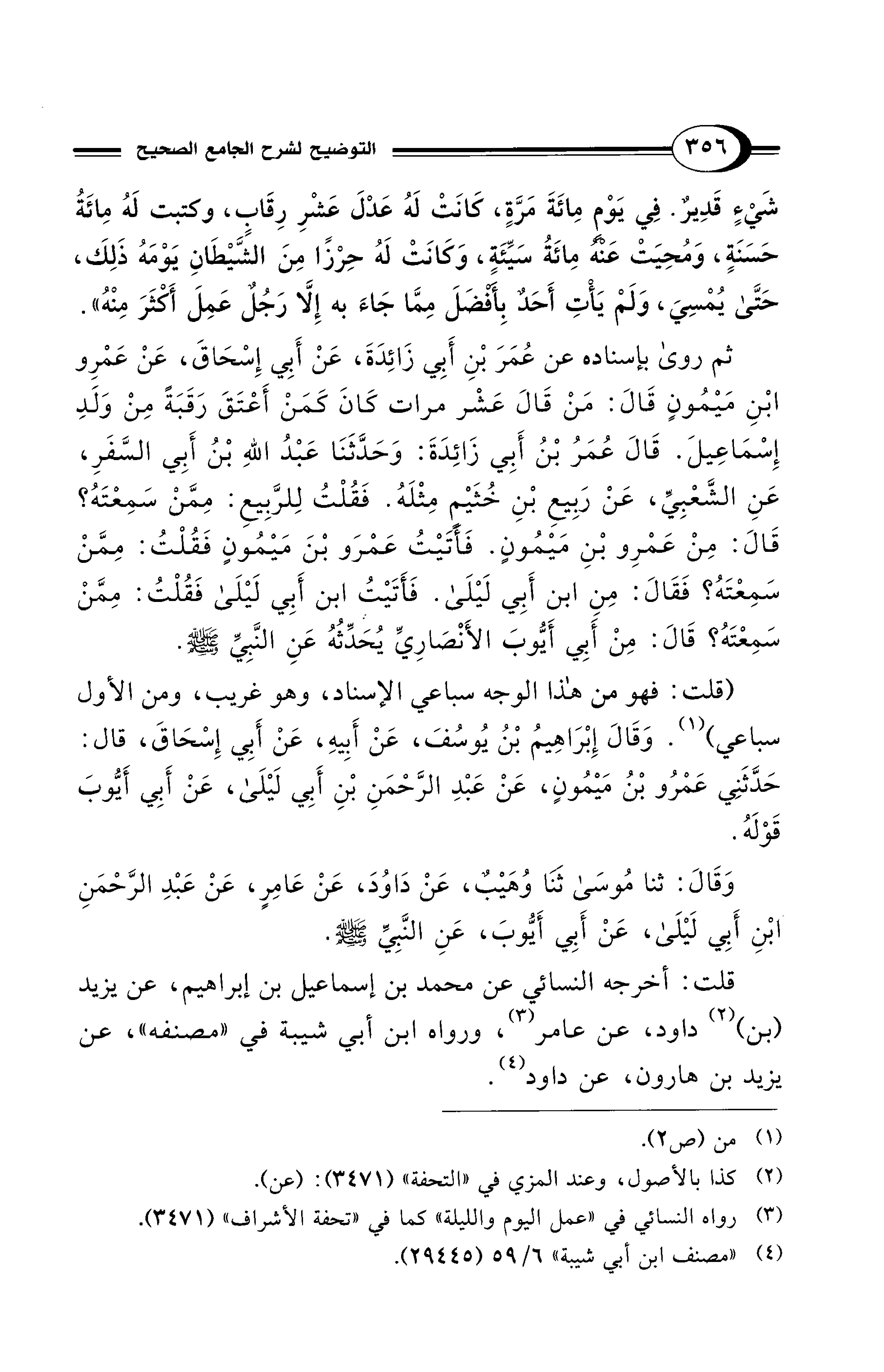 ثم روى بإسناده عن عُمَرَ بْنِ أَبِي زَائِدَةَ، عَنْ أَبِي إِسْحَاقَ، عَنْ عَمْرِو ابْنِ مَيْمُونٍ قَالَ: مَنْ قَالَ عَشْر مرات كَانَ كَمَنْ أَعْتَقَ رَقَبَةً مِنْ وَلَدِ إِسْمَاعِيلَ. قَالَ عُمَرُ بْنُ أَبِي زَائِدَةَ: وَحَدَّثَنَا عَبْدُ اللهِ بْنُ أَبِي السَّفَرِ، عَنِ الشَّعْبِيِّ، عَنْ رَبِيعِ بْنِ خُثَيْمٍ مِثْلَهُ. فَقُلْتُ لِلرَّبِيعِ: مِمَّنْ سَمِعْتَهُ؟ قَالَ: مِنْ عَمْرِو بْنِ مَيْمُونٍ. فَأَتَيْتُ عَمْرَو بْنَ مَيْمُونٍ فَقُلْتُ: مِمَّنْ سَمِعْتَهُ؟ فَقَالَ: مِنِ ابن أَبِي لَيْلَى. فَأَتَيْتُ ابن أَبِي لَيْلَى فَقُلْتُ: مِمَّنْ سَمِعْتَهُ؟ قَالَ: مِنْ أَبِي أَيُّوبَ الأَنْصَارِيِّ يُحَدِّثُهُ عَنِ النَّبِيِّ - صلى الله عليه وسلم -.