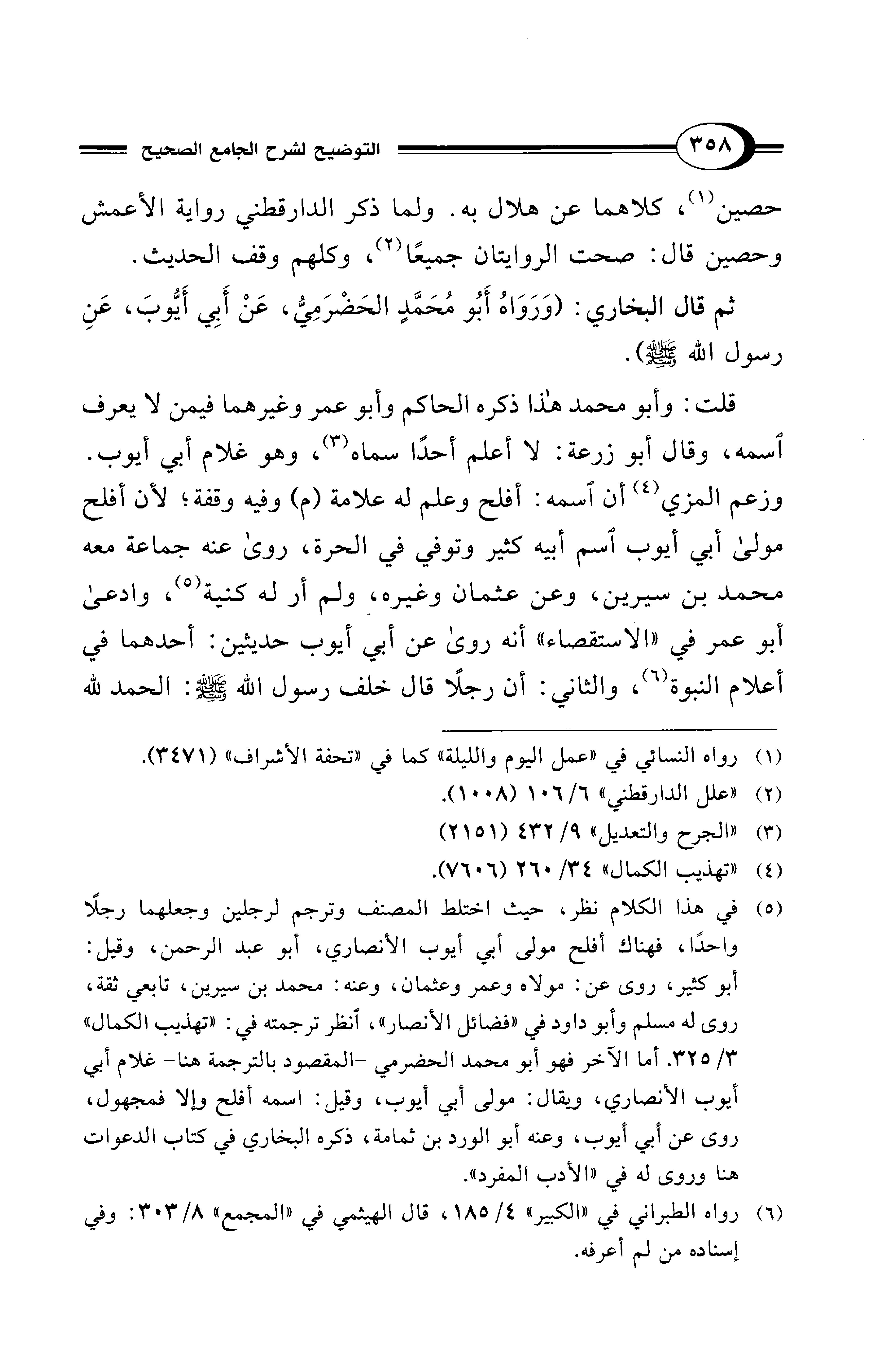 (¬5) في هذا الكلام نظر، حيث اختلط المصنف وترجم لرجلين وجعلهما رجلاً واحداً، فهناك أفلح مولى أبي أيوب الأنصاري، أبو عبد الرحمن، وقيل: أبو كثير، روى عن: مولاه وعمر وعثمان، وعنه: محمد بن سيرين، تابعي ثقة، روى له مسلم وأبو داود في "فضائل الأنصار"، انظر ترجمته في: "تهذيب الكمال" 3/ 325. أما الآخر فهو أبو محمد الحضرمي -المقصود بالترجمة هنا- غلام أبي أيوب الأنصاري، ويقال: مولى أبي أيوب، وقيل: اسمه أفلح وإلا فمجهول، روى عن أبي أيوب، وعنه أبو الورد بن ثمامة، ذكره البخاري في كتاب الدعوات هنا وروى له في "الأدب المفرد".