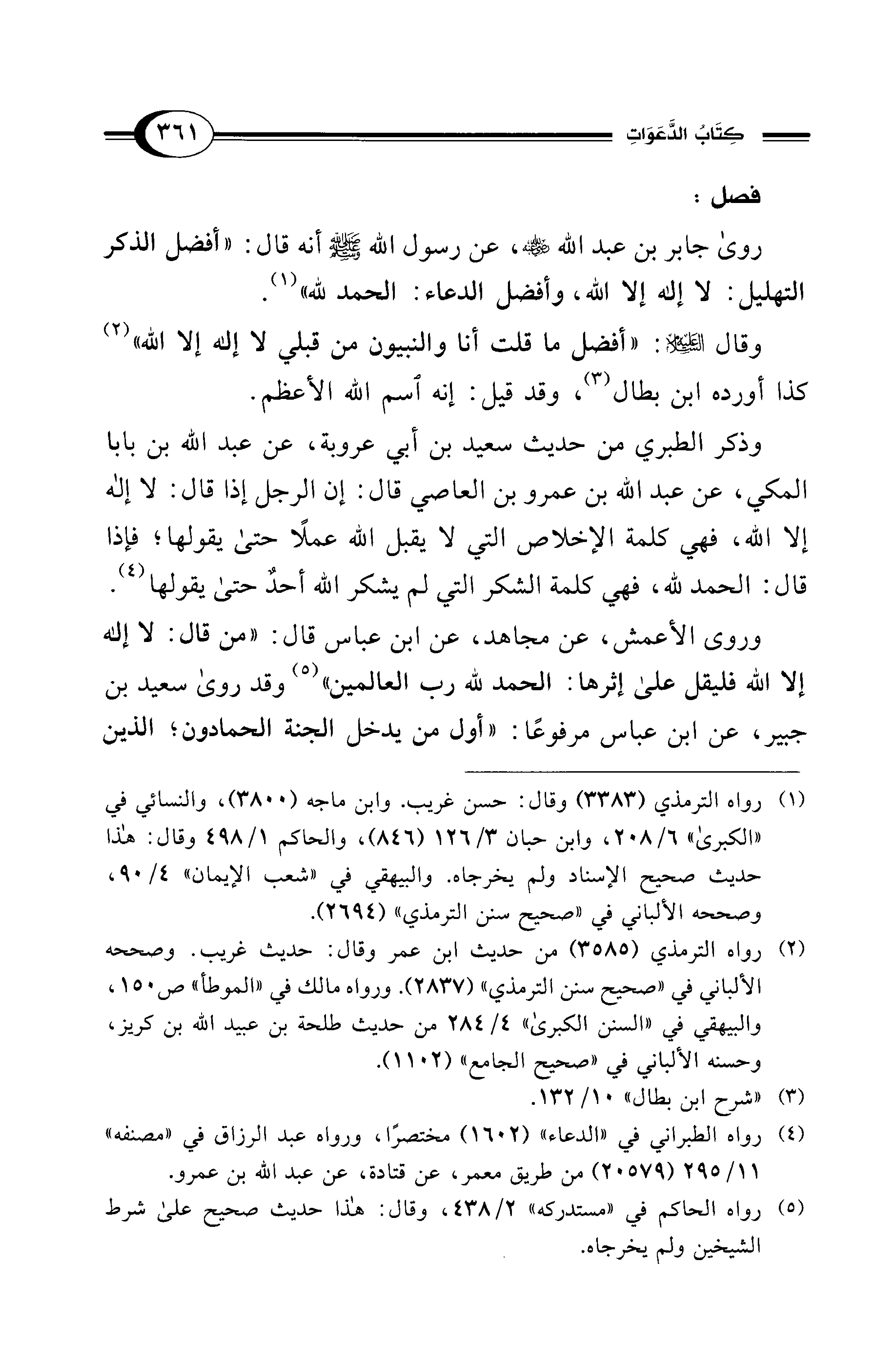 روى جابر بن عبد الله - رضي الله عنه -، عن رسول الله - صلى الله عليه وسلم - أنه قال: "أفضل الذكر التهليل: لا إله إلا الله، وأفضل الدعاء: الحمد لله" (¬1).