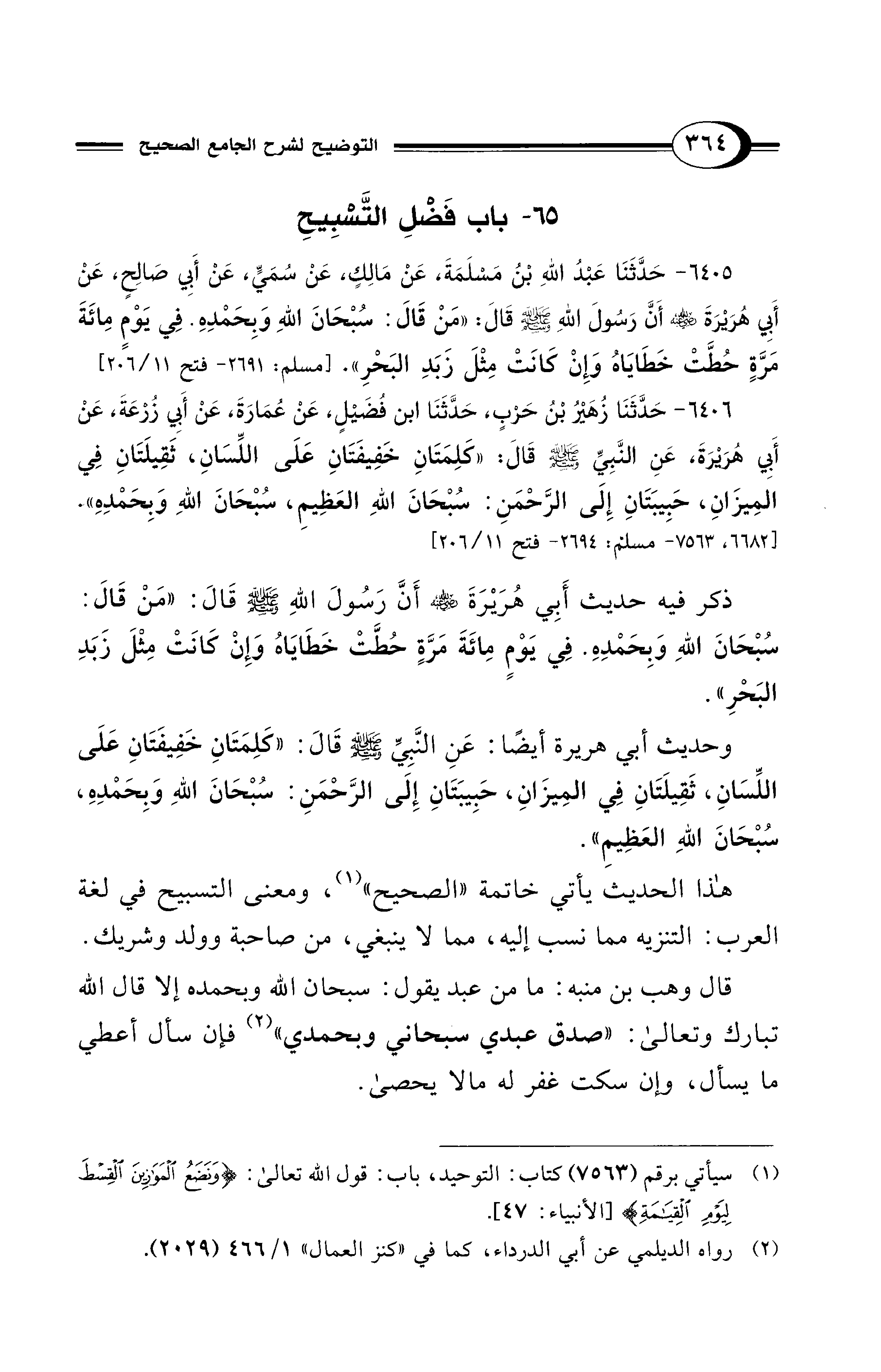 ذكر فيه حديث أَبِي هُرَيْرَةَ - رضي الله عنه - أَنَّ رَسُولَ اللهِ - صلى الله عليه وسلم - قَالَ: "مَنْ قَالَ: سُبْحَانَ اللهِ وَبِحَمْدِهِ. فِي يَوْمٍ مِائَةَ مَرَّةٍ حُطَّتْ خَطَايَاهُ وَإِنْ كَانَتْ مِثْلَ زَبَدِ البَحْرِ".