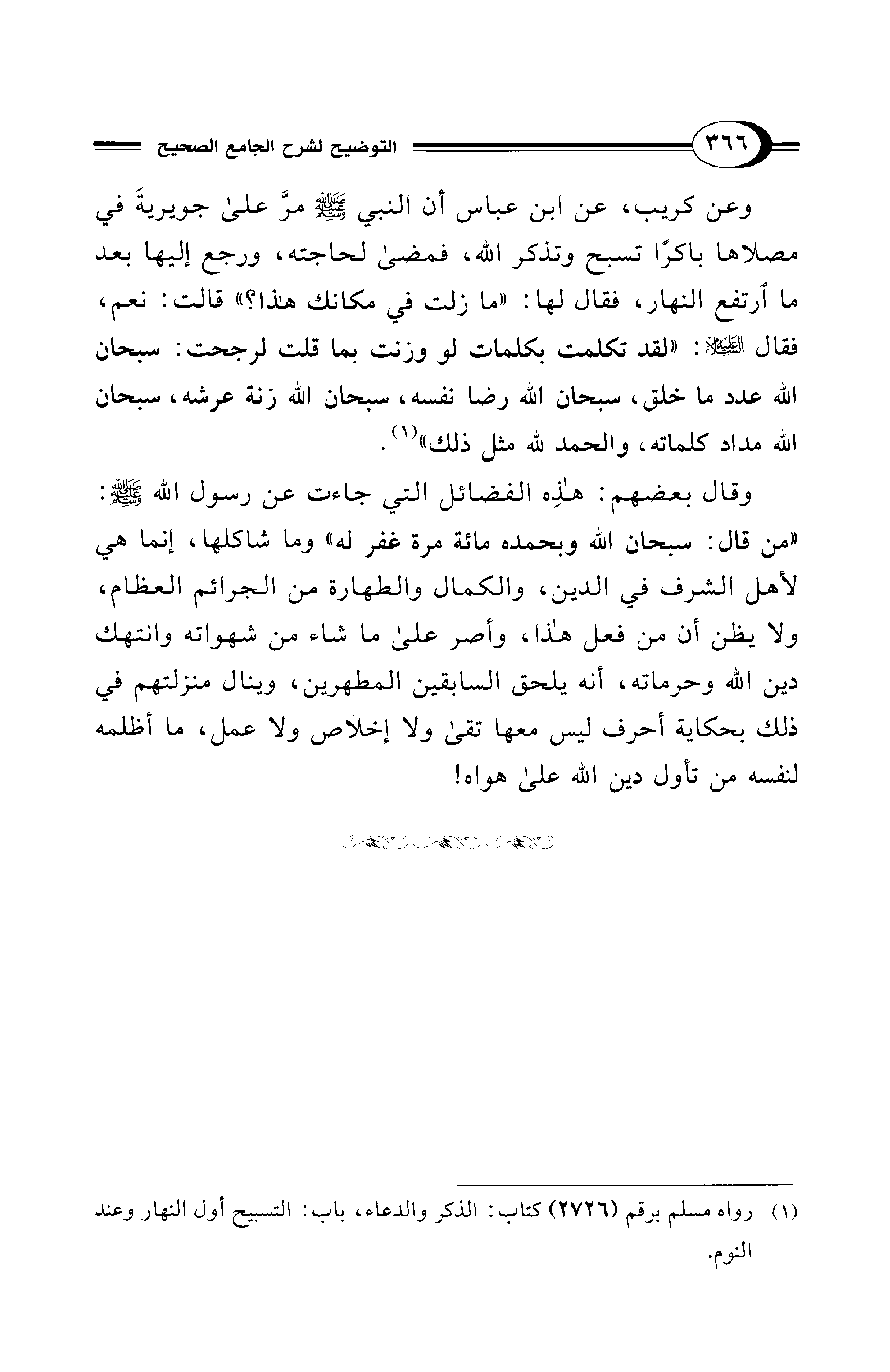 وعن كريب، عن ابن عباس أن النبي - صلى الله عليه وسلم - مرَّ على جويريةَ في مصلاها باكرًا تسبح وتذكر الله، فمضى لحاجته، ورجع إليها بعد ما ارتفع النهار، فقال لها: "ما زلت في مكانك هذا؟ " قالت: نعم، فقال - عليه السلام -: (لقد تكلمت بكلمات لو وزنت بما قلت لرجحت: سبحان الله عدد ما خلق، سبحان الله رضا نفسه، سبحان الله زنة عرشه، سبحان الله مداد كلماته، والحمد لله مثل ذلك" (¬1).