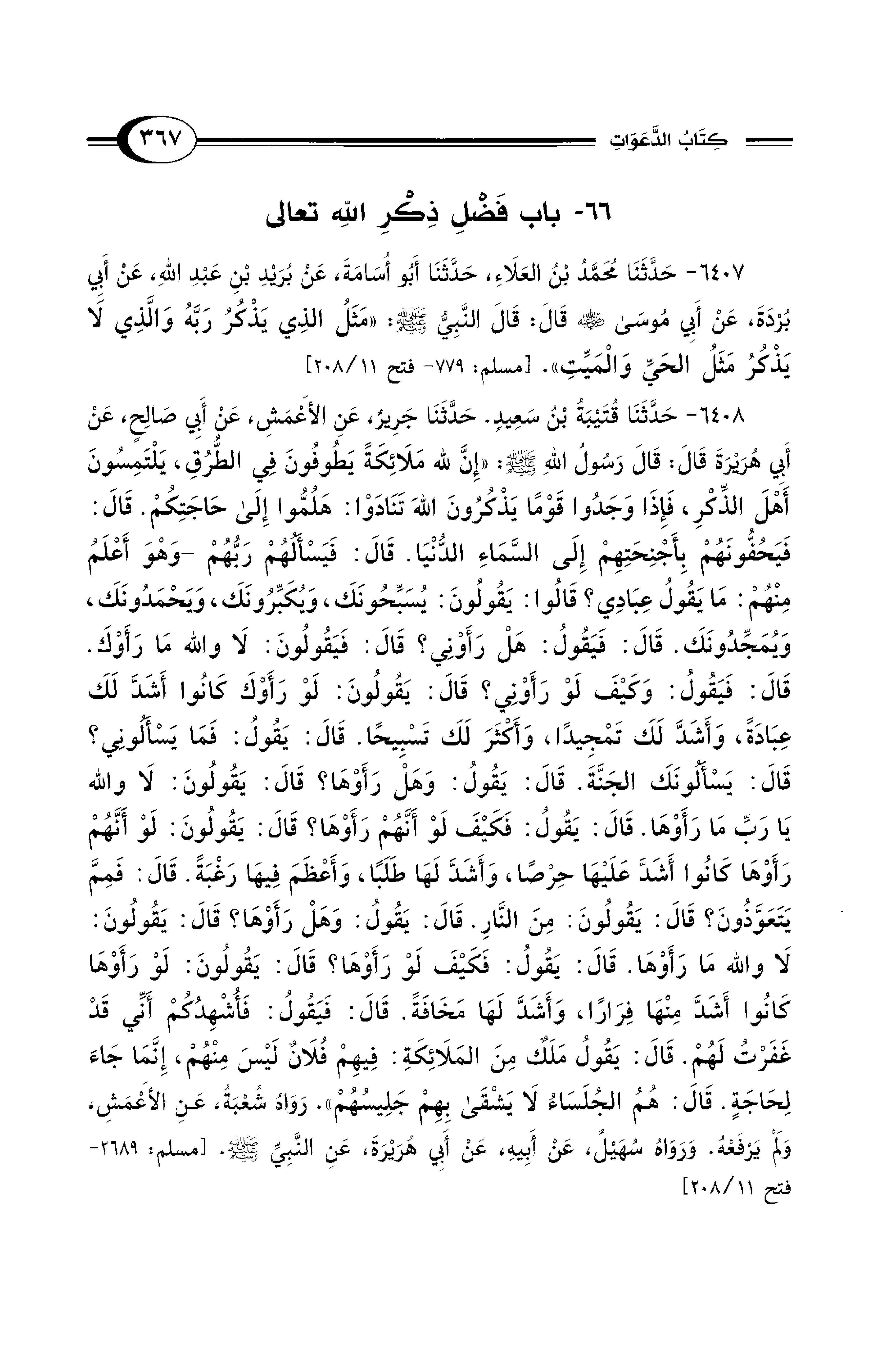 6408 - حَدَّثَنَا قُتَيْبَةُ بْنُ سَعِيدٍ. حَدَّثَنَا جَرِيرٌ، عَنِ الأَعْمَشِ، عَنْ أَبِي صَالِحٍ، عَنْ أَبِي هُرَيْرَةَ قَالَ: قَالَ رَسُولُ اللهِ - صلى الله عليه وسلم -: «إِنَّ لِلَّهِ مَلاَئِكَةً يَطُوفُونَ فِي الطُّرُقِ، يَلْتَمِسُونَ أَهْلَ الذِّكْرِ، فَإِذَا وَجَدُوا قَوْمًا يَذْكُرُونَ اللهَ تَنَادَوْا: هَلُمُّوا إِلَى حَاجَتِكُمْ. قَالَ: فَيَحُفُّونَهُمْ بِأَجْنِحَتِهِمْ إِلَى السَّمَاءِ الدُّنْيَا. قَالَ: فَيَسْأَلُهُمْ رَبُّهُمْ -وَهْوَ أَعْلَمُ مِنْهُمْ: مَا يَقُولُ عِبَادِي؟ قَالُوا: يَقُولُونَ: يُسَبِّحُونَكَ، وَيُكَبِّرُونَكَ، وَيَحْمَدُونَكَ، وَيُمَجِّدُونَكَ. قَالَ: فَيَقُولُ: هَلْ رَأَوْنِي؟ قَالَ: فَيَقُولُونَ: لاَ وَاللهِ مَا رَأَوْكَ. قَالَ: فَيَقُولُ: وَكَيْفَ لَوْ رَأَوْنِي؟ قَالَ: يَقُولُونَ: لَوْ رَأَوْكَ كَانُوا أَشَدَّ لَكَ عِبَادَةً، وَأَشَدَّ لَكَ تَمْجِيدًا، وَأَكْثَرَ لَكَ تَسْبِيحًا. قَالَ: يَقُولُ: فَمَا يَسْأَلُونِي؟ قَالَ: يَسْأَلُونَكَ الْجَنَّةَ. قَالَ: يَقُولُ: وَهَلْ رَأَوْهَا؟ قَالَ: يَقُولُونَ: لاَ وَاللهِ يَا رَبِّ مَا رَأَوْهَا. قَالَ: يَقُولُ: فَكَيْفَ لَوْ أَنَّهُمْ رَأَوْهَا؟ قَالَ: يَقُولُونَ: لَوْ أَنَّهُمْ رَأَوْهَا كَانُوا أَشَدَّ عَلَيْهَا حِرْصًا، وَأَشَدَّ لَهَا طَلَبًا، وَأَعْظَمَ فِيهَا رَغْبَةً. قَالَ: فَمِمَّ يَتَعَوَّذُونَ؟ قَالَ: يَقُولُونَ: مِنَ النَّارِ. قَالَ: يَقُولُ: وَهَلْ رَأَوْهَا؟ قَالَ: يَقُولُونَ: لاَ وَاللهِ مَا رَأَوْهَا. قَالَ: يَقُولُ: فَكَيْفَ لَوْ رَأَوْهَا؟ قَالَ: يَقُولُونَ: لَوْ رَأَوْهَا كَانُوا أَشَدَّ مِنْهَا فِرَارًا، وَأَشَدَّ لَهَا مَخَافَةً. قَالَ: فَيَقُولُ: فَأُشْهِدُكُمْ أَنِّي قَدْ غَفَرْتُ لَهُمْ. قَالَ: يَقُولُ مَلَكٌ مِنَ الْمَلاَئِكَةِ: فِيهِمْ فُلاَنٌ لَيْسَ مِنْهُمْ، إِنَّمَا جَاءَ لِحَاجَةٍ. قَالَ: هُمُ الْجُلَسَاءُ لاَ يَشْقَى بِهِمْ جَلِيسُهُمْ». رَوَاهُ شُعْبَةُ، عَنِ الأَعْمَشِ، وَلَمْ يَرْفَعْهُ. وَرَوَاهُ سُهَيْلٌ، عَنْ أَبِيهِ، عَنْ أَبِي هُرَيْرَةَ، عَنِ النَّبِيِّ - صلى الله عليه وسلم -. [مسلم: 2689 - فتح 11/ 208]