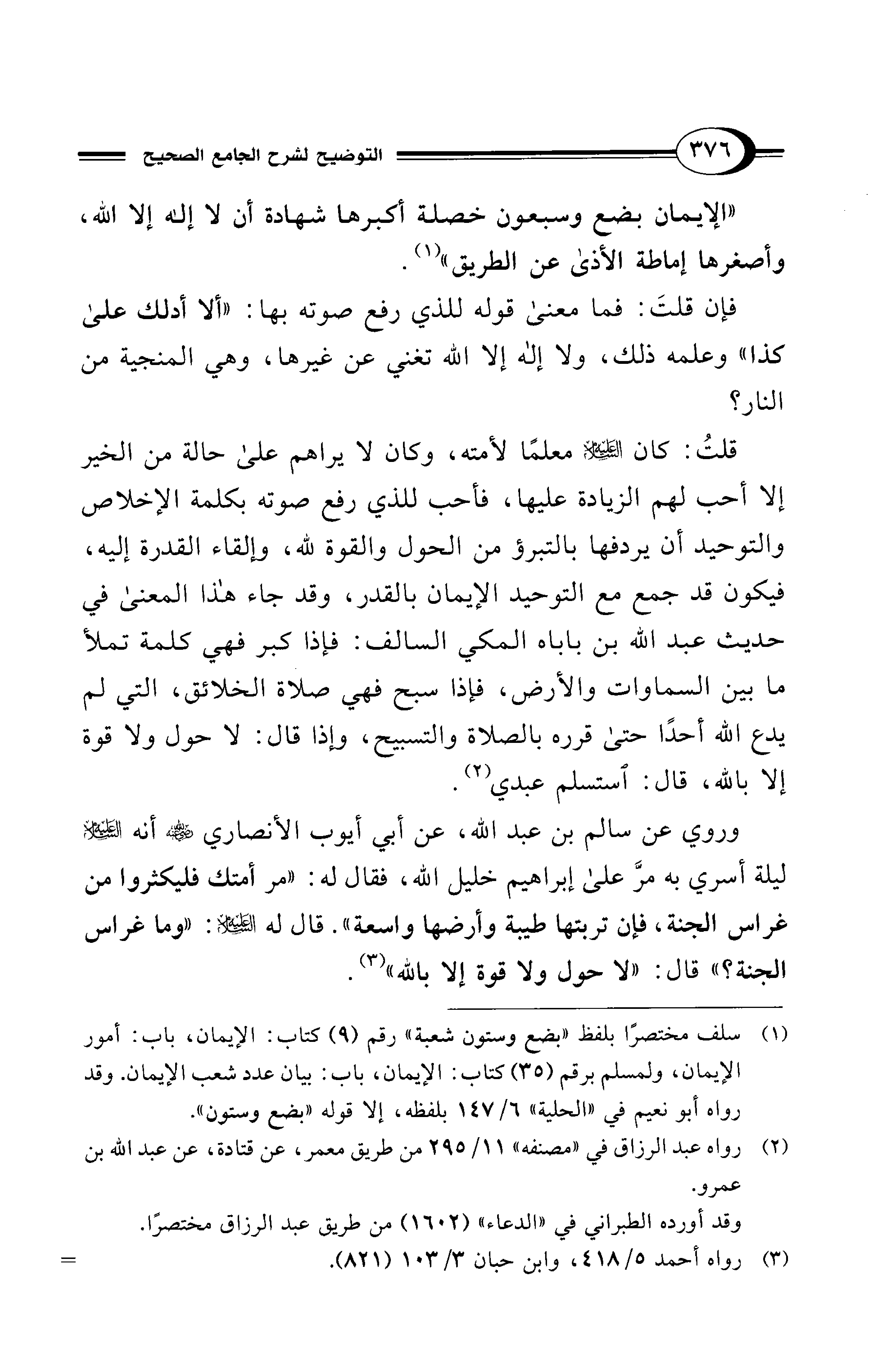 وروي عن سالم بن عبد الله، عن أبي أيوب الأنصاري - رضي الله عنه - أنه - عليه السلام - ليلة أسري به مرَّ على إبراهيم خليل الله، فقال له: "مر أمتك فليكثروا من غراس الجنة، فإن تربتها طيبة وأرضها واسعة". قال له - عليه السلام -: "وما غراس الجنة؟ " قال: "لا حول ولا قوة إلا بالله" (¬3).
