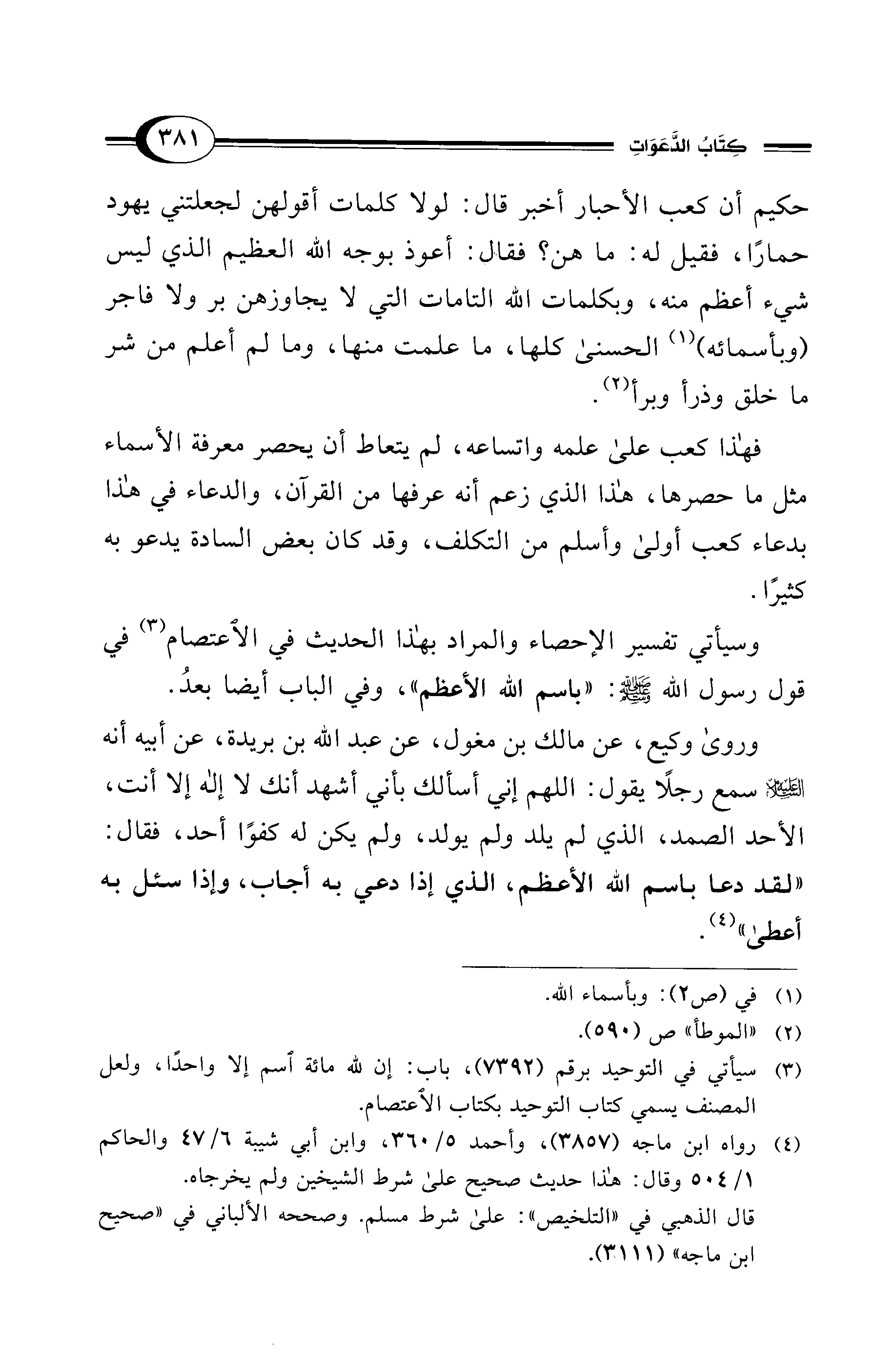 فهذا كعب على علمه واتساعه، لم يتعاط أن يحصر معرفة الأسماء مثل ما حصرها، هذا الذي زعم أنه عرفها من القرآن، والدعاء في هذا بدعاء كعب أولى وأسلم من التكلف، وقد كان بعض السادة يدعو به كثيرًا.