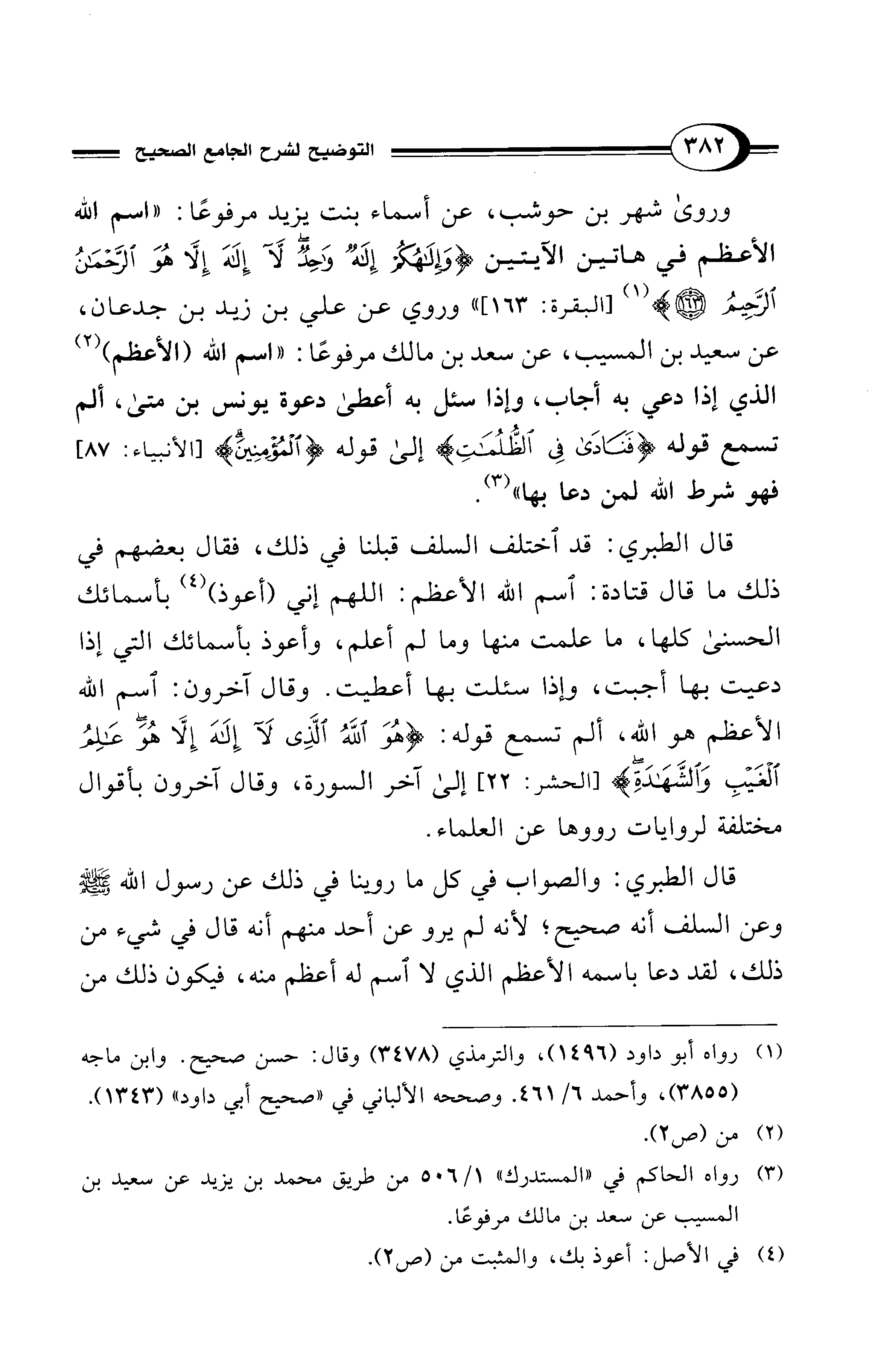 قال الطبري: والصواب في كل ما روينا في ذلك عن رسول الله - صلى الله عليه وسلم - وعن السلف أنه صحيح؛ لأنه لم يرو عن أحد منهم أنه قال في شيء من ذلك، لقد دعا باسمه الأعظم الذي لا اسم له أعظم منه، فيكون ذلك من