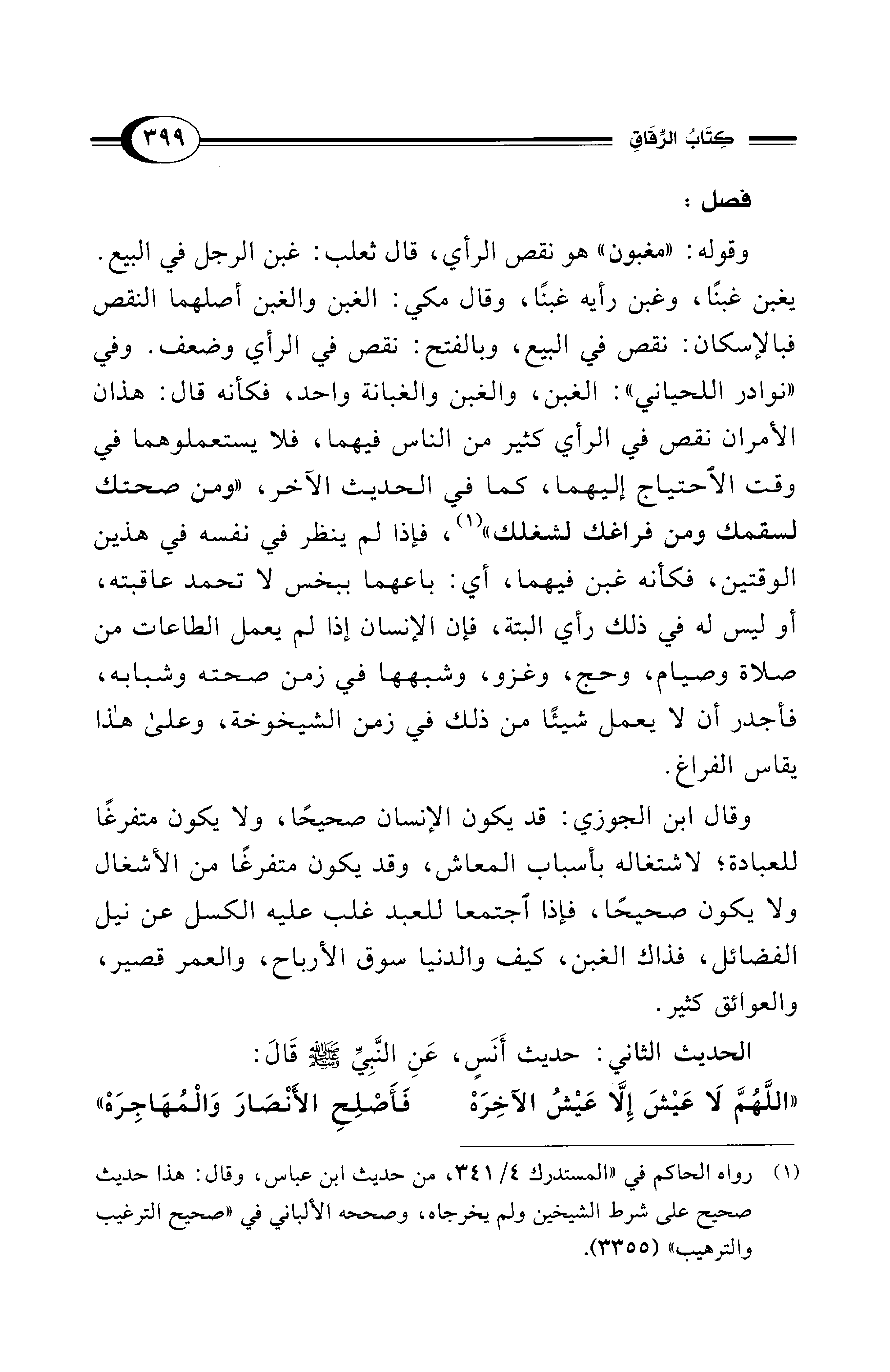 وقال ابن الجوزي: قد يكون الإنسان صحيحًا، ولا يكون متفرغًا للعبادة؛ لاشتغاله بأسباب المعاش، وقد يكون متفرغًا من الأشغال ولا يكون صحيحًا، فإذا اجتمعا للعبد غلب عليه الكسل عن نيل الفضائل، فذاك الغبن، كيف والدنيا سوق الأرباح، والعمر قصير، والعوائق كثير.