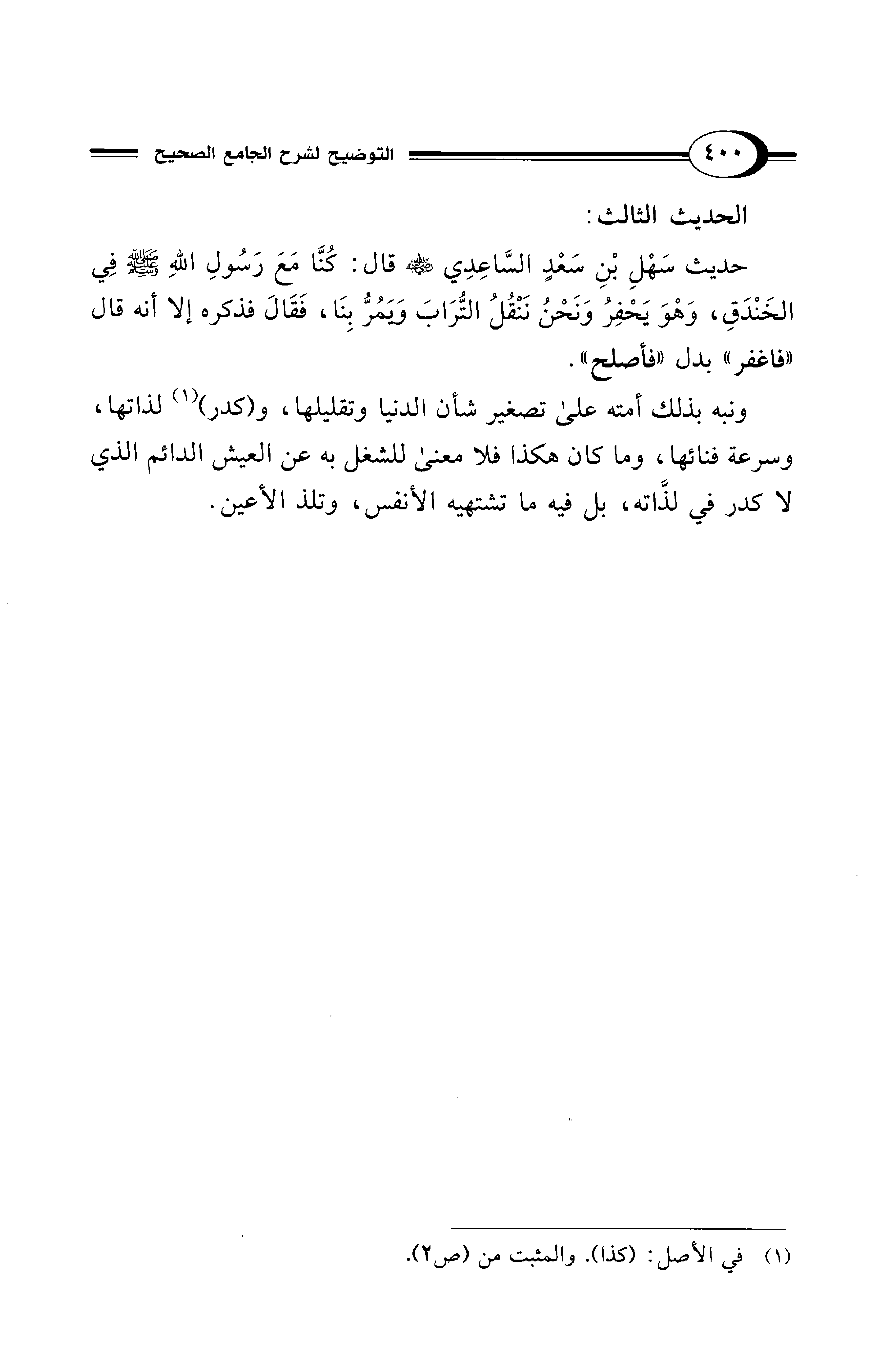 حديث سَهْلِ بْنِ سَعْدٍ السَّاعِدِي - رضي الله عنه - قال: كُنَّا مَعَ رَسُولِ اللهِ - صلى الله عليه وسلم - فِي الخَنْدَقِ، وَهْوَ يَحْفِرُ وَنَحْنُ نَنْقُلُ التُّرَابَ وَيمُرُّ بِنَا، فَقَالَ فذكره إلا أنه قال "فاغفر" بدل "فأصلح".