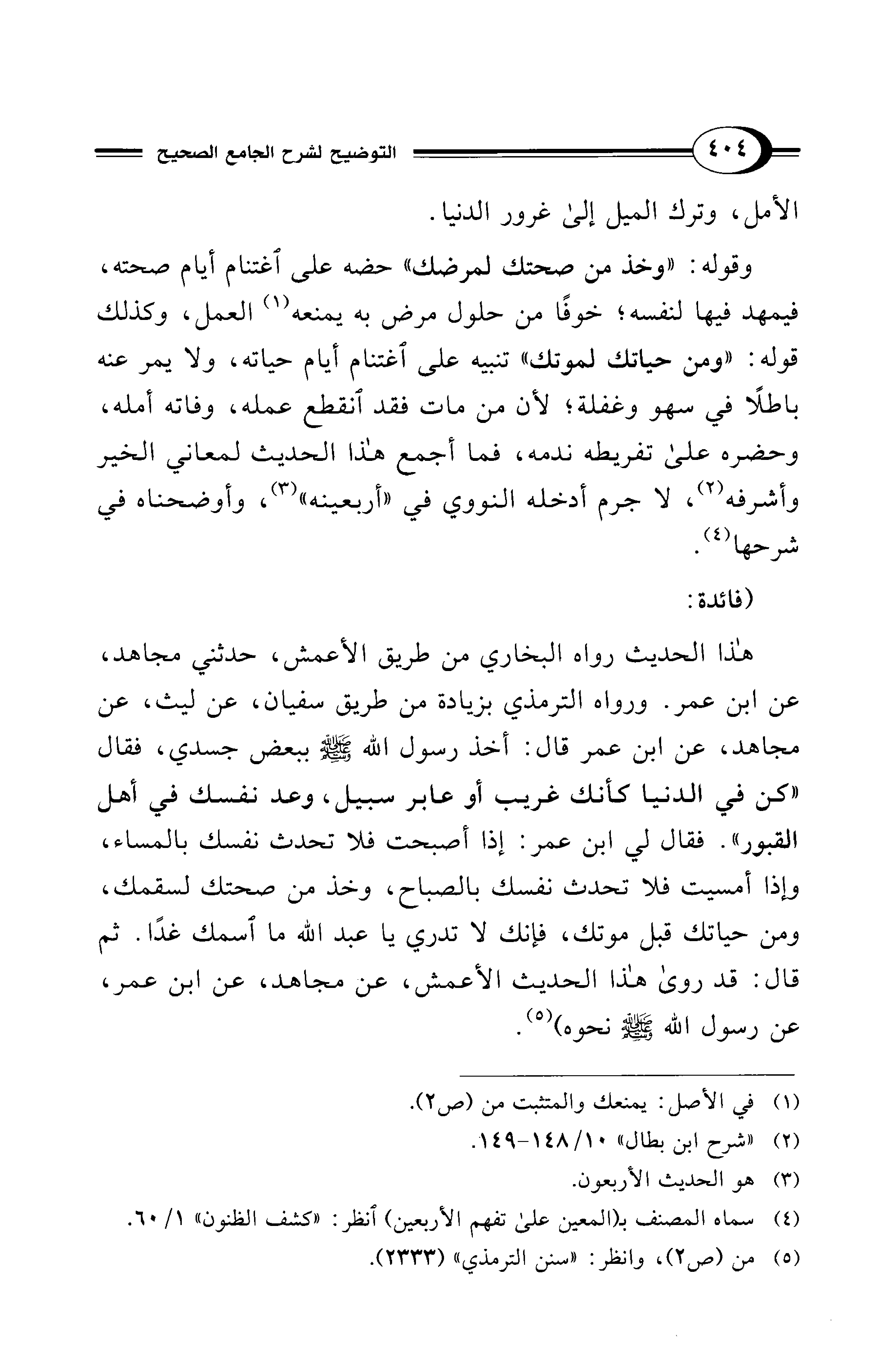 هذا الحديث رواه البخاري من طريق الأعمش، حدثني مجاهد، عن ابن عمر. ورواه الترمذي بزيادة من طريق سفيان، عن ليث، عن مجاهد، عن ابن عمر قال: أخذ رسول الله - صلى الله عليه وسلم - ببعض جسدي، فقال "كن في الدنيا كأنك غريب أو عابر سبيل، وعد نفسك في أهل القبور". فقال لي ابن عمر: إذا أصبحت فلا تحدث نفسك بالمساء، وإذا أمسيت فلا تحدث نفسك بالصباح، وخذ من صحتك لسقمك، ومن حياتك قبل موتك، فإنك لا تدري يا عبد الله ما اسمك غدًا. ثم قال: قد روى هذا الحديث الأعمش، عن مجاهد، عن ابن عمر، عن رسول الله - صلى الله عليه وسلم - نحوه) (¬5).