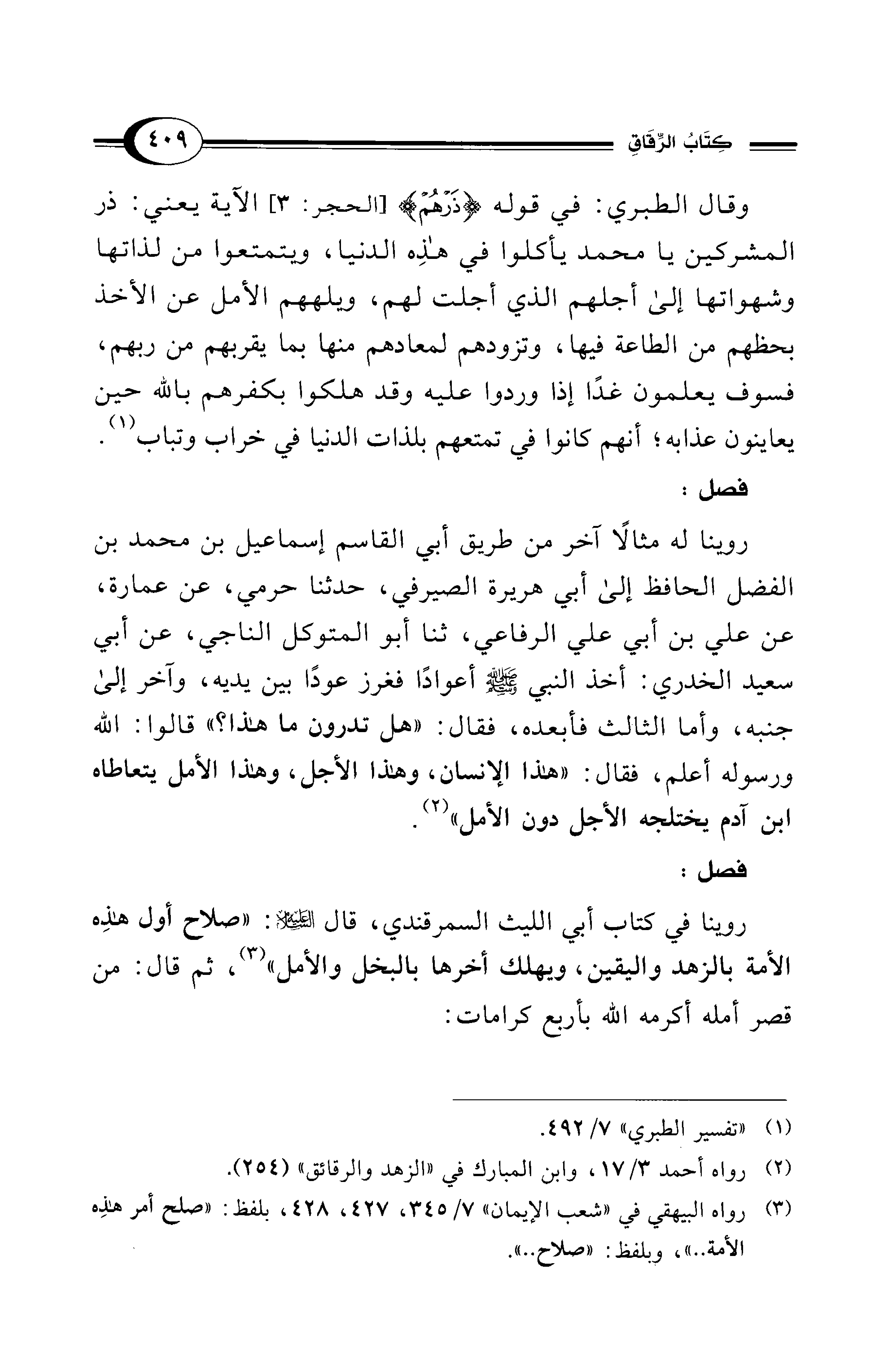 روينا في كتاب أبي الليث السمرقندي، قال - عليه السلام -: "صلاح أول هذِه الأمة بالزهد واليقين، ويهلك أخرها بالبخل والأمل" (¬3)، ثم قال: من قصر أمله أكرمه الله بأربع كرامات: