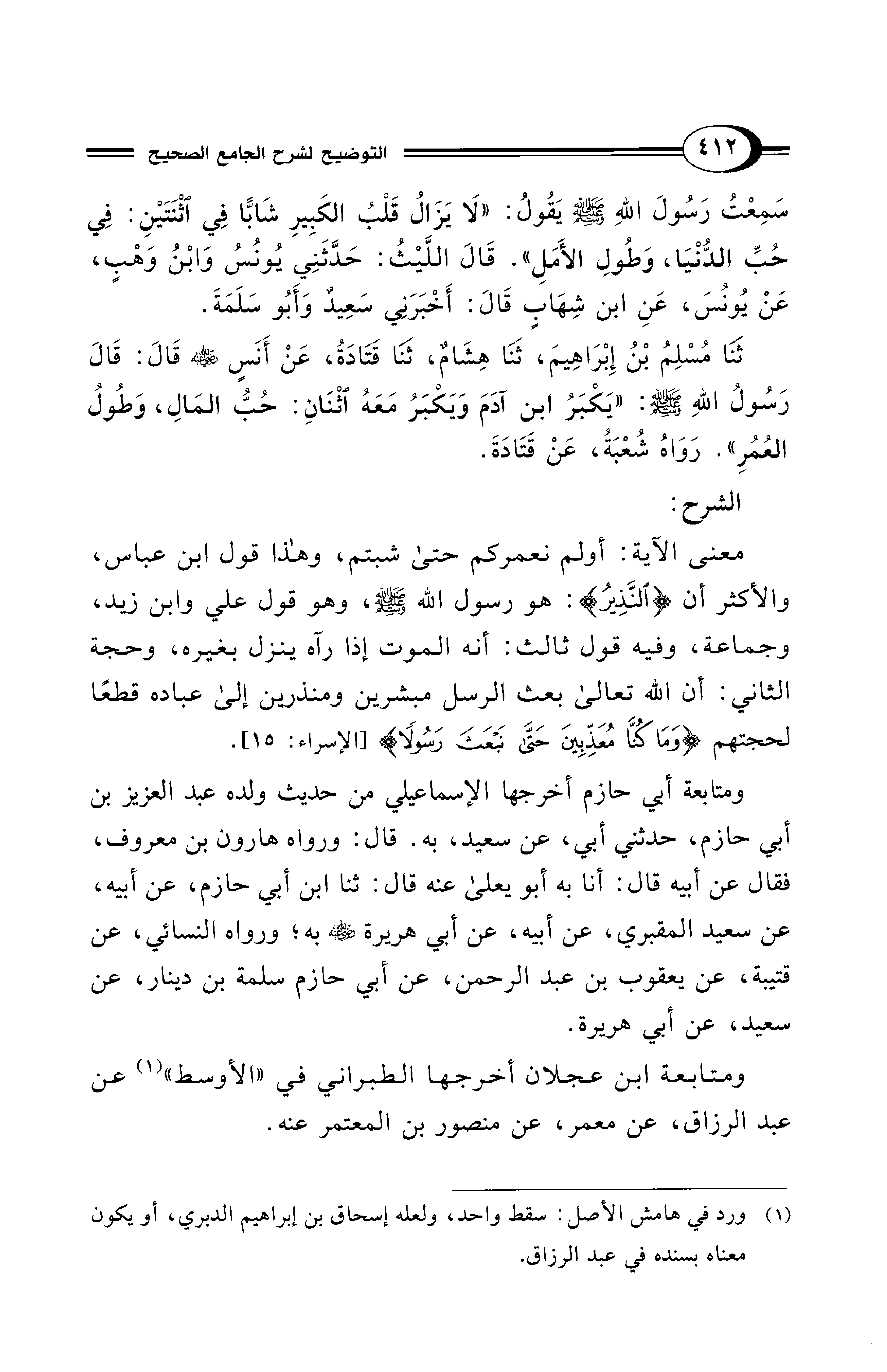 سَمِعْتُ رَسُولَ اللهِ - صلى الله عليه وسلم - يَقُولُ: "لَا يَزَالُ قَلْبُ الكَبِيرِ شَابًّا فِي اثْنَتَيْنِ: فِي حُبِّ الدُّنْيَا، وَطُولِ الأَمَلِ". قَالَ اللَّيْثُ: حَدَّثَنِي يُونُسُ وَابْنُ وَهْبٍ، عَنْ يُونُسَ، عَنِ ابن شِهَابٍ قَالَ: أَخْبَرَنِي سَعِيدٌ وَأَبُو سَلَمَةَ.