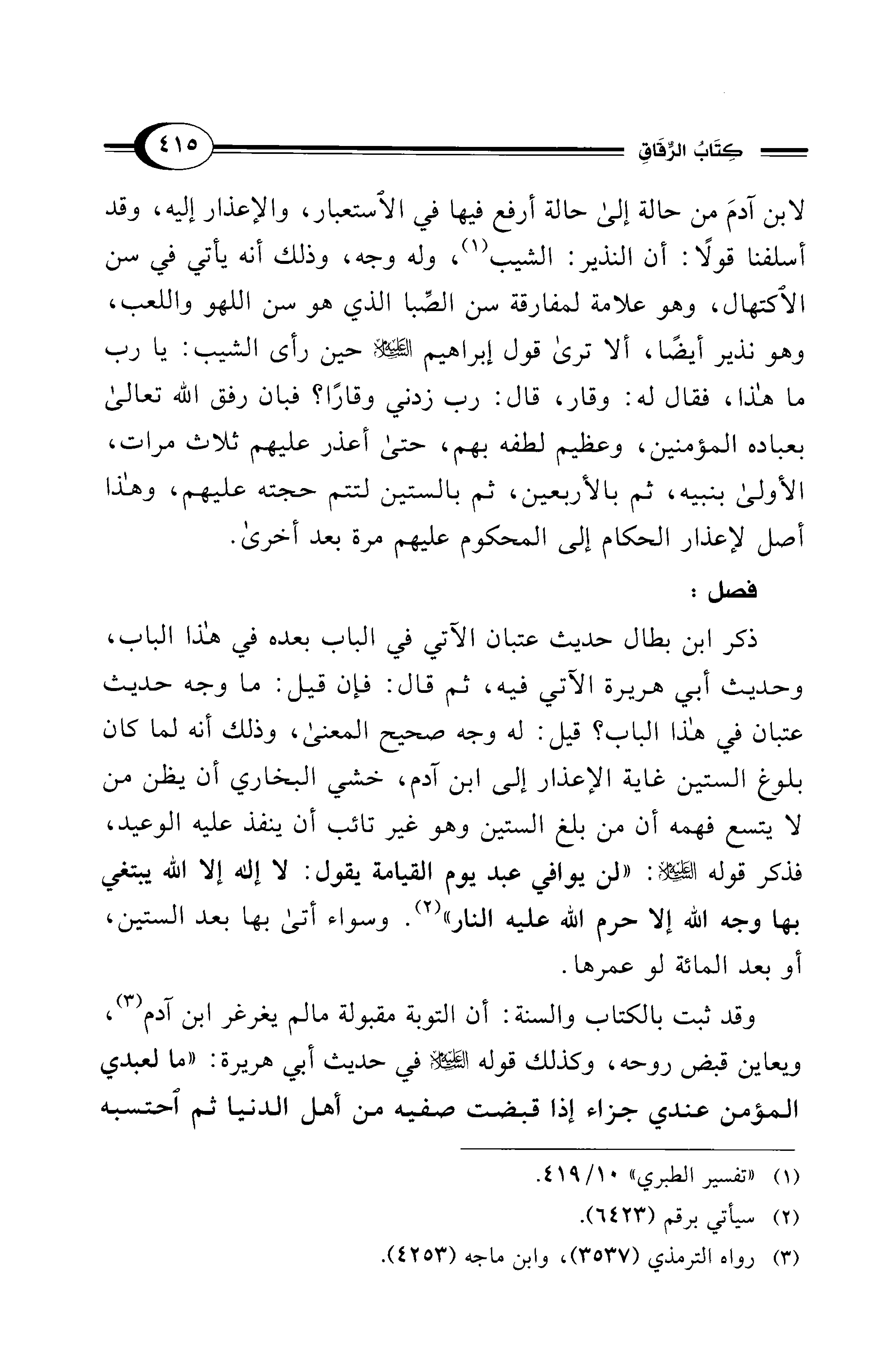 ذكر ابن بطال حديث عتبان الآتي في الباب بعده في هذا الباب، وحديث أبي هريرة الآتي فيه، ثم قال: فإن قيل: ما وجه حديث عتبان في هذا الباب؟ قيل: له وجه صحيح المعنى، وذلك أنه لما كان بلوغ الستين غاية الإعذار إلى ابن آدم، خشي البخاري أن يظن من لا يتسع فهمه أن من بلغ الستين وهو غير تائب أن ينفذ عليه الوعيد، فذكر قوله - عليه السلام -: "لن يوافي عبد يوم القيامة يقول: لا إله إلا الله يبتغي بها وجه الله إلا حرم الله عليه النار" (¬2). وسواء أتى بها بعد الستين، أو بعد المائة لو عمرها.