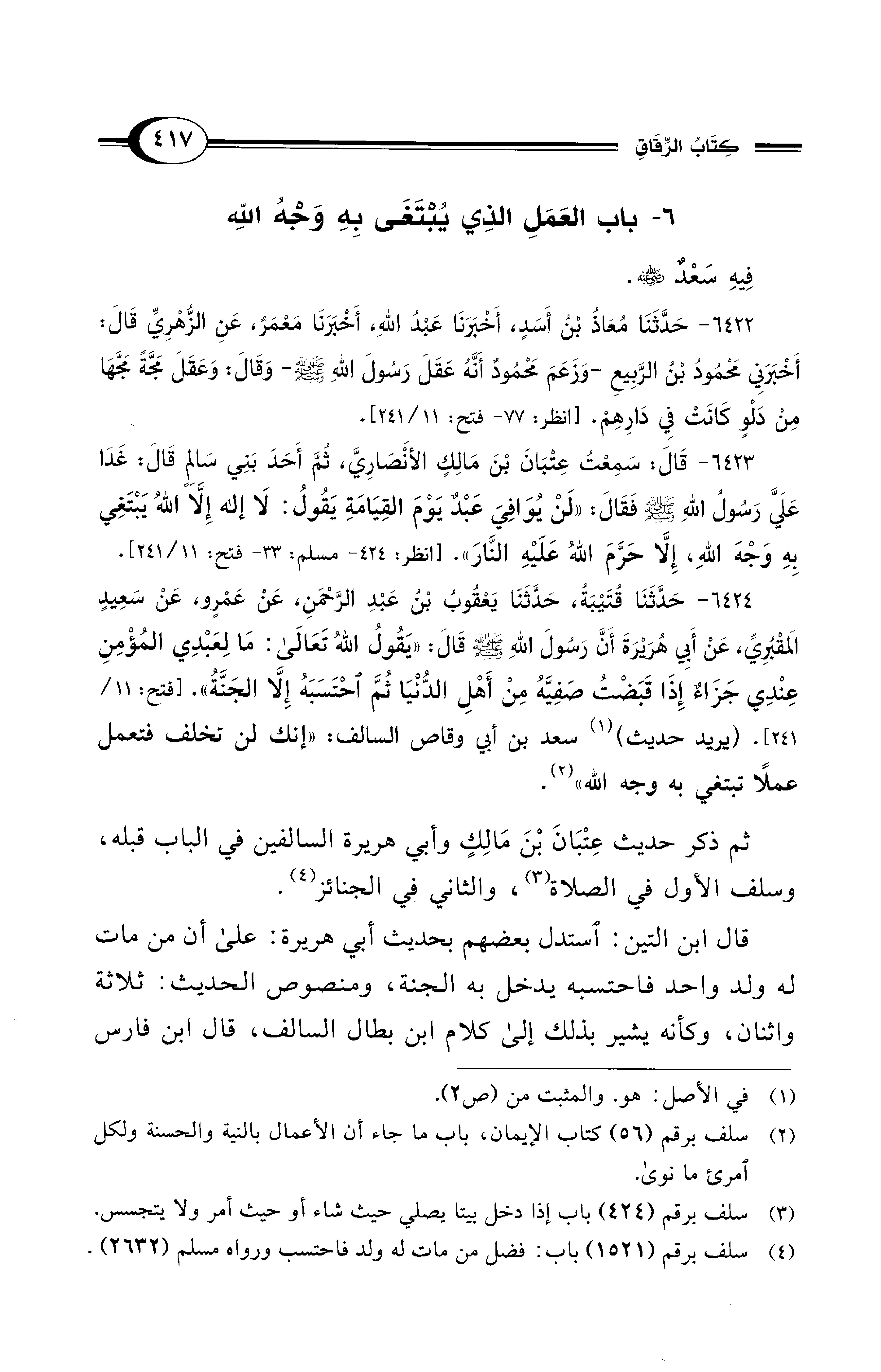 6423 - قَالَ: سَمِعْتُ عِتْبَانَ بْنَ مَالِكٍ الأَنْصَارِيَّ، ثُمَّ أَحَدَ بَنِي سَالِمٍ قَالَ: غَدَا عَلَيَّ رَسُولُ اللهِ - صلى الله عليه وسلم - فَقَالَ: «لَنْ يُوَافِيَ عَبْدٌ يَوْمَ الْقِيَامَةِ يَقُولُ: لاَ إِلَهَ إِلاَّ اللهُ يَبْتَغِى بِهِ وَجْهَ اللهِ، إِلاَّ حَرَّمَ اللهُ عَلَيْهِ النَّارَ». [انظر: 424 - مسلم: 33 - فتح: 11/ 241].