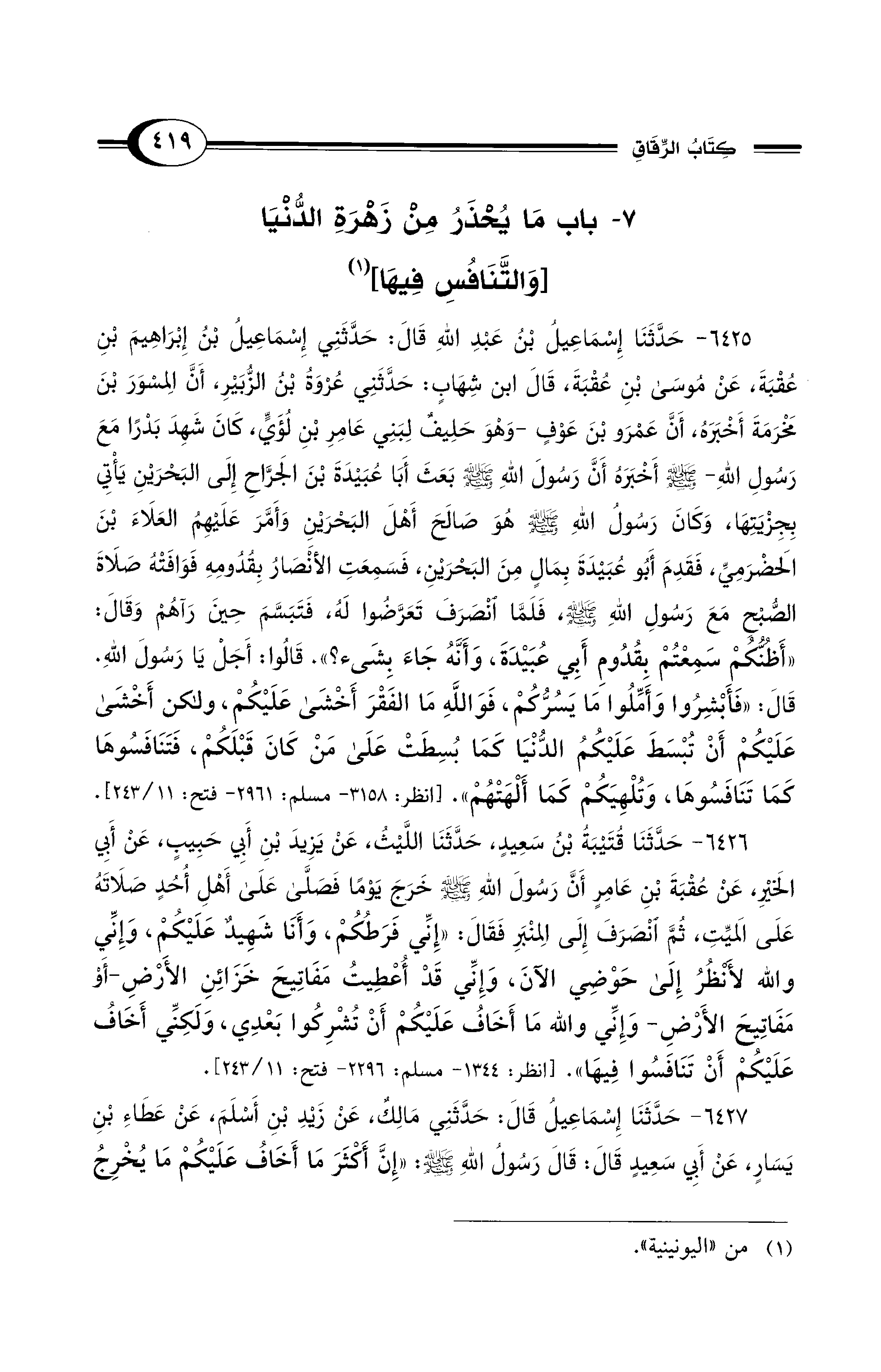 6425 - حَدَّثَنَا إِسْمَاعِيلُ بْنُ عَبْدِ اللهِ قَالَ: حَدَّثَنِي إِسْمَاعِيلُ بْنُ إِبْرَاهِيمَ بْنِ عُقْبَةَ، عَنْ مُوسَى بْنِ عُقْبَةَ، قَالَ ابْنُ شِهَابٍ: حَدَّثَنِي عُرْوَةُ بْنُ الزُّبَيْرِ، أَنَّ المِسْوَرَ بْنَ مَخْرَمَةَ أَخْبَرَهُ، أَنَّ عَمْرَو بْنَ عَوْفٍ -وَهْوَ حَلِيفٌ لِبَنِي عَامِرِ بْنِ لُؤَيٍّ، كَانَ شَهِدَ بَدْرًا مَعَ رَسُولِ اللهِ - صلى الله عليه وسلم - أَخْبَرَهُ أَنَّ رَسُولَ اللهِ - صلى الله عليه وسلم - بَعَثَ أَبَا عُبَيْدَةَ بْنَ الْجَرَّاحِ إِلَى البَحْرَيْنِ يَأْتِي بِجِزْيَتِهَا، وَكَانَ رَسُولُ اللهِ - صلى الله عليه وسلم -هُوَ صَالَحَ أَهْلَ البَحْرَيْنِ وَأَمَّرَ عَلَيْهِمُ الْعَلاَءَ بْنَ الحَضْرَمِيِّ، فَقَدِمَ أَبُو عُبَيْدَةَ بِمَالٍ مِنَ البَحْرَيْنِ، فَسَمِعَتِ الأَنْصَارُ بِقُدُومِهِ فَوَافَتْهُ صَلاَةَ الصُّبْحِ مَعَ رَسُولِ اللهِ - صلى الله عليه وسلم -، فَلَمَّا انْصَرَفَ تَعَرَّضُوا لَهُ، فَتَبَسَّمَ حِينَ رَآهُمْ وَقَالَ: «أَظُنُّكُمْ سَمِعْتُمْ بِقُدُومِ أَبِي عُبَيْدَةَ، وَأَنَّهُ جَاءَ بِشَيْءٍ؟». قَالُوا: أَجَلْ يَا رَسُولَ اللهِ. قَالَ: «فَأَبْشِرُوا وَأَمِّلُوا مَا يَسُرُّكُمْ، فَوَاللهِ مَا الفَقْرَ أَخْشَى عَلَيْكُمْ، وَلَكِنْ أَخْشَى عَلَيْكُمْ أَنْ تُبْسَطَ عَلَيْكُمُ الدُّنْيَا، كَمَا بُسِطَتْ على مَنْ كَانَ قَبْلَكُمْ، فَتَنَافَسُوهَا كَمَا تَنَافَسُوهَا، وَتُلْهِيَكُمْ كَمَا أَلْهَتْهُمْ». [انظر: 3158 - مسلم: 2961 - فتح: 11/ 243].