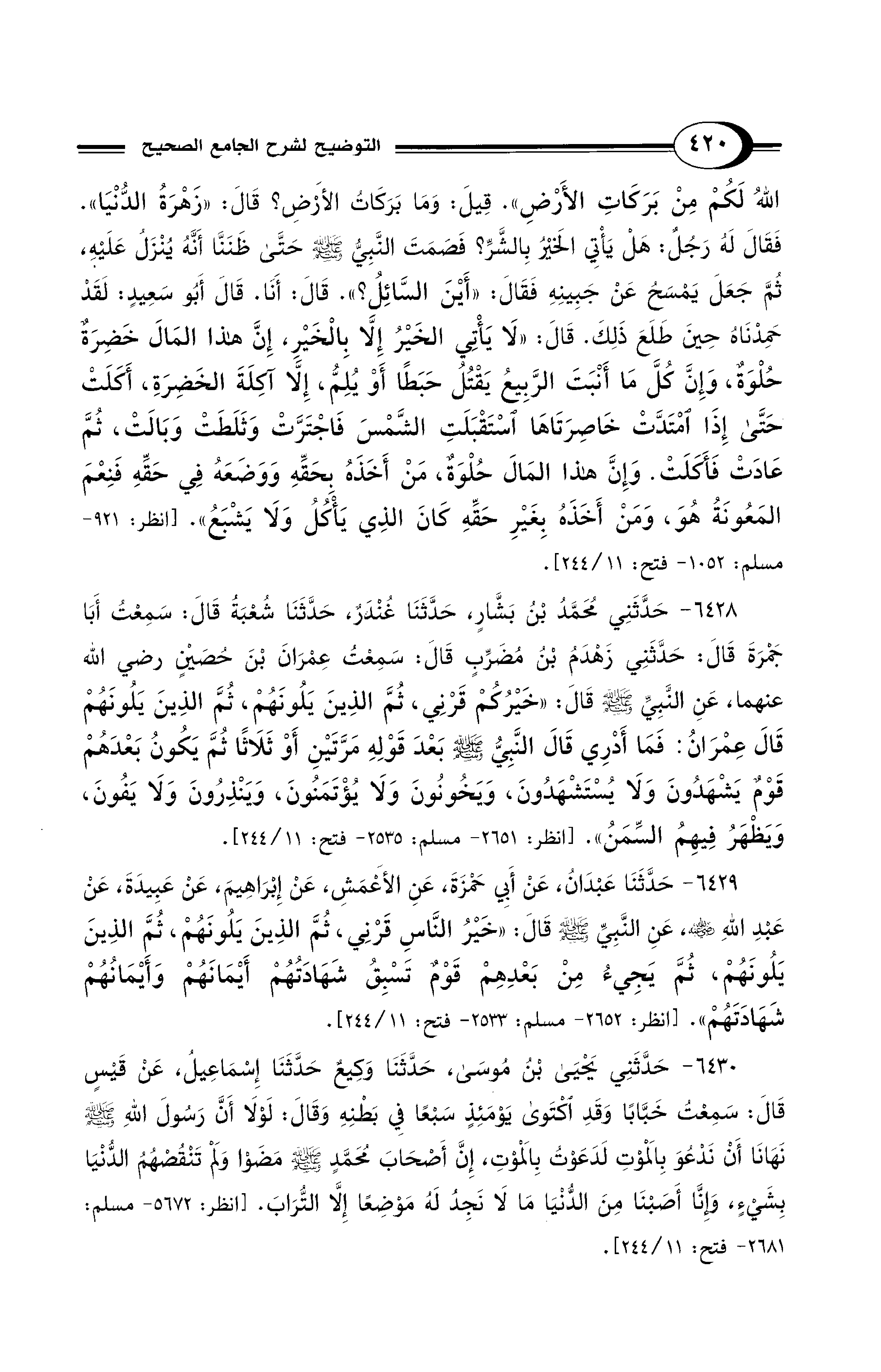 6428 - حَدَّثَنِي مُحَمَّدُ بْنُ بَشَّارٍ، حَدَّثَنَا غُنْدَرٌ، حَدَّثَنَا شُعْبَةُ قَالَ: سَمِعْتُ أَبَا جَمْرَةَ قَالَ: حَدَّثَنِي زَهْدَمُ بْنُ مُضَرِّبٍ قَالَ: سَمِعْتُ عِمْرَانَ بْنَ حُصَيْنٍ - رضي الله عنهما -، عَنِ النَّبِيِّ - صلى الله عليه وسلم - قَالَ: «خَيْرُكُمْ قَرْنِي، ثُمَّ الَّذِينَ يَلُونَهُمْ، ثُمَّ الَّذِينَ يَلُونَهُمْ قَالَ عِمْرَانُ: فَمَا أَدْرِي قَالَ النَّبِيُّ - صلى الله عليه وسلم - بَعْدَ قَوْلِهِ مَرَّتَيْنِ أَوْ ثَلاَثًا ثُمَّ يَكُونُ بَعْدَهُمْ قَوْمٌ يَشْهَدُونَ وَلاَ يُسْتَشْهَدُونَ، وَيَخُونُونَ وَلاَ يُؤْتَمَنُونَ، وَيَنْذِرُونَ وَلاَ يَفُونَ، وَيَظْهَرُ فِيهِمُ السِّمَنُ». [انظر: 2651 - مسلم: 2535 - فتح: 11/ 244].