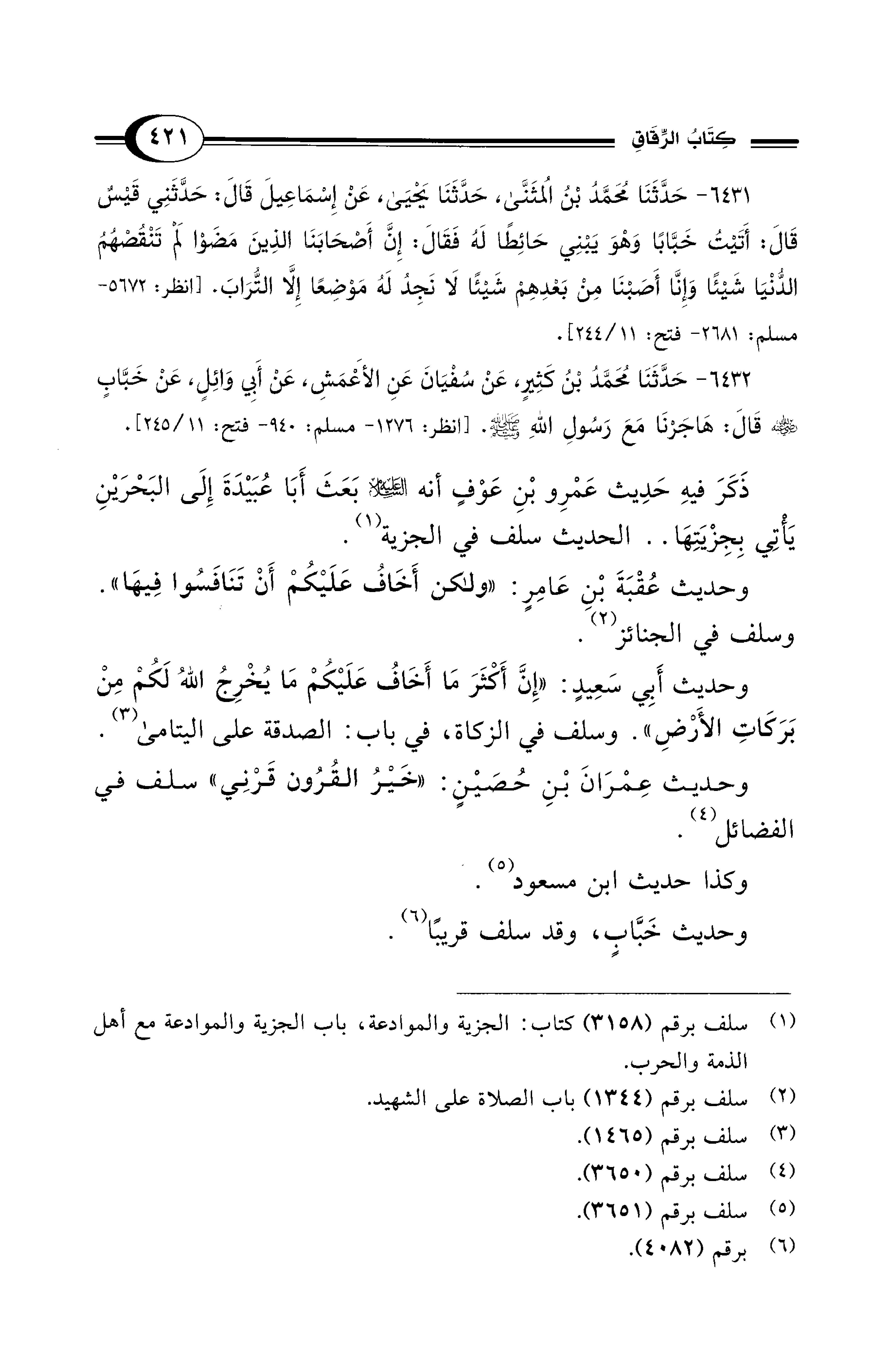 6432 - حَدَّثَنَا مُحَمَّدُ بْنُ كَثِيرٍ، عَنْ سُفْيَانَ عَنِ الأَعْمَشِ، عَنْ أَبِي وَائِلٍ، عَنْ خَبَّابٍ - رضي الله عنه - قَالَ: هَاجَرْنَا مَعَ رَسُولِ اللهِ - صلى الله عليه وسلم -. [انظر: 1276 - مسلم: 940 - فتح: 11/ 245].