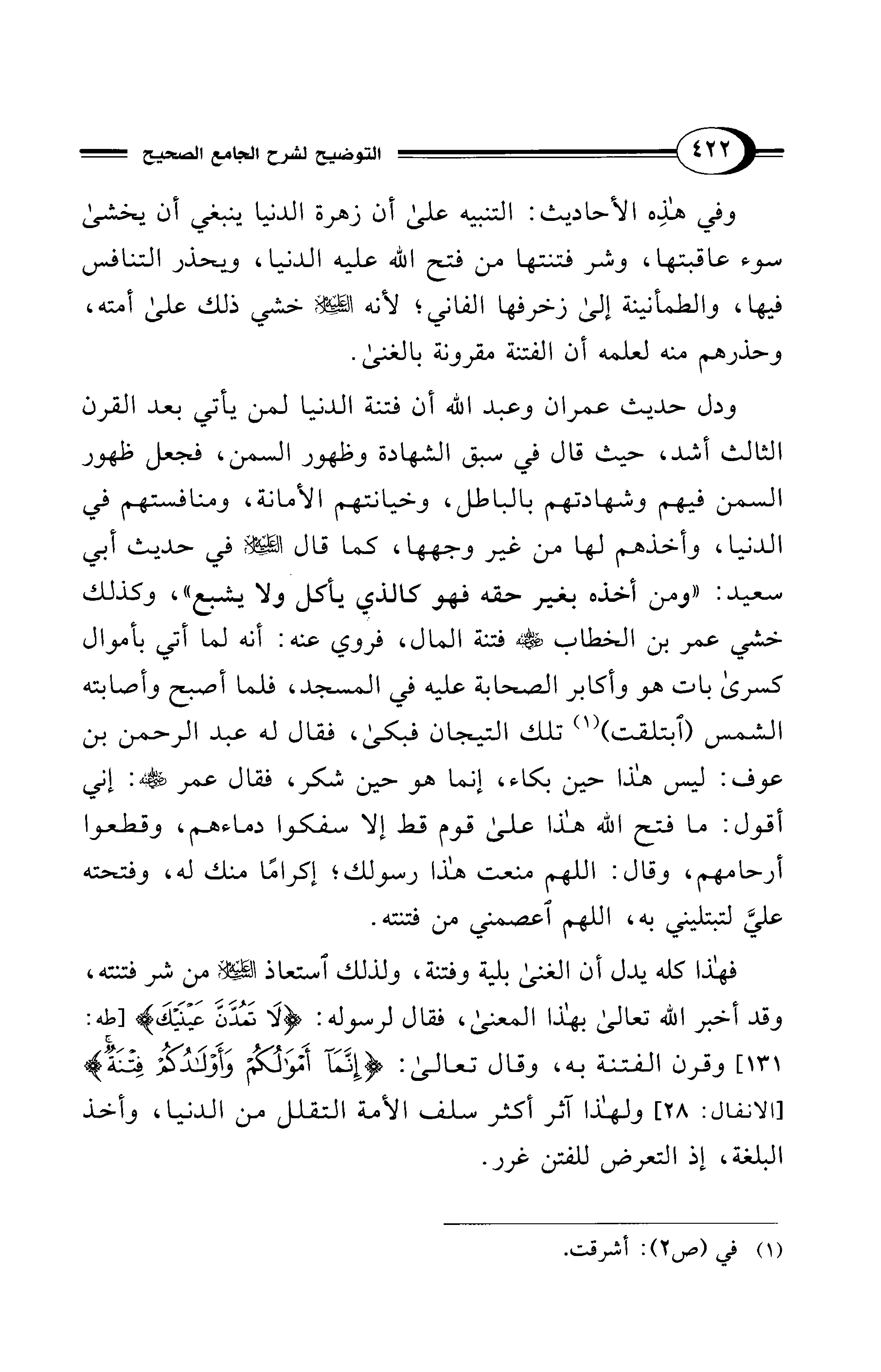 ودل حديث عمران وعبد الله أن فتنة الدنيا لمن يأتي بعد القرن الثالث أشد، حيث قال في سبق الشهادة وظهور السمن، فجعل ظهور السمن فيهم وشهادتهم بالباطل، وخيانتهم الأمانة، ومنافستهم في الدنيا، وأخذهم لها من غير وجهها، كما قال - عليه السلام - في حديث أبي سعيد: "ومن أخذه بغير حقه فهو كالذي يأكل ولا يشبع"، وكذلك خشي عمر بن الخطاب - رضي الله عنه - فتنة المال، فروي عنه: أنه لما أتي بأموال كسرى بات هو وأكابر الصحابة عليه في المسجد، فلما أصبح وأصابته الشمس (ابتلقت) (¬1) تلك التيجان فبكى، فقال له عبد الرحمن بن عوف: ليس هذا حين بكاء، إنما هو حين شكر، فقال عمر - رضي الله عنه -: إني أقول: ما فتح الله هذا على قوم قط إلا سفكوا دماءهم، وقطعوا أرحامهم، وقال: اللهم منعت هذا رسولك؛ إكرامًا منك له، وفتحته عليَّ لتبتليني به، اللهم اعصمني من فتنته.