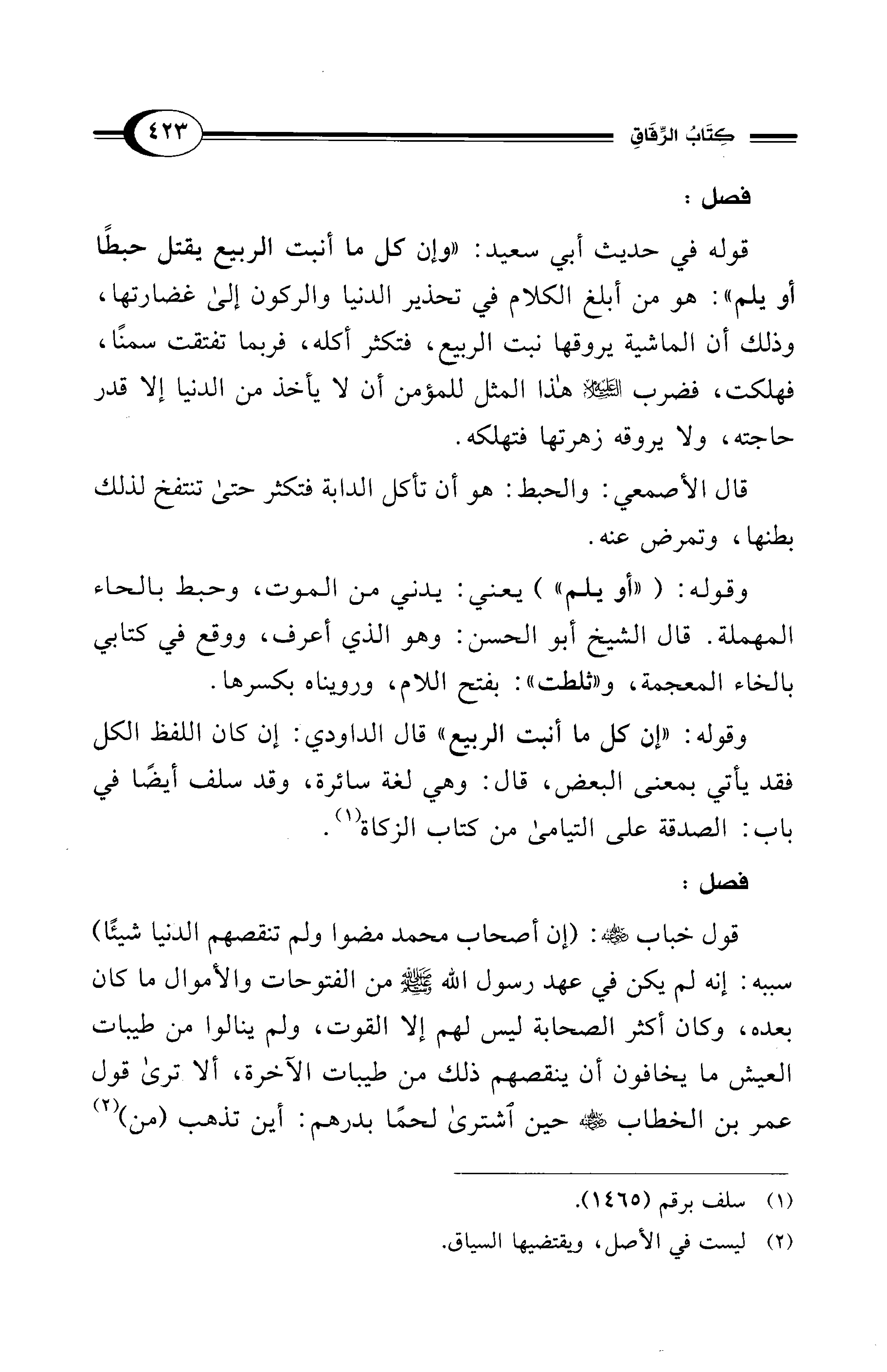 قوله في حديث أبي سعيد: "وإن كل ما أنبت الربيع يقتل حبطًا أو يلم": هو من أبلغ الكلام في تحذير الدنيا والركون إلى غضارتها، وذلك أن الماشية يروقها نبت الربيع، فتكثر أكله، فربما تفتقت سمنًا، فهلكت، فضرب - عليه السلام - هذا المثل للمؤمن أن لا يأخذ من الدنيا إلا قدر حاجته، ولا يروقه زهرتها فتهلكه.