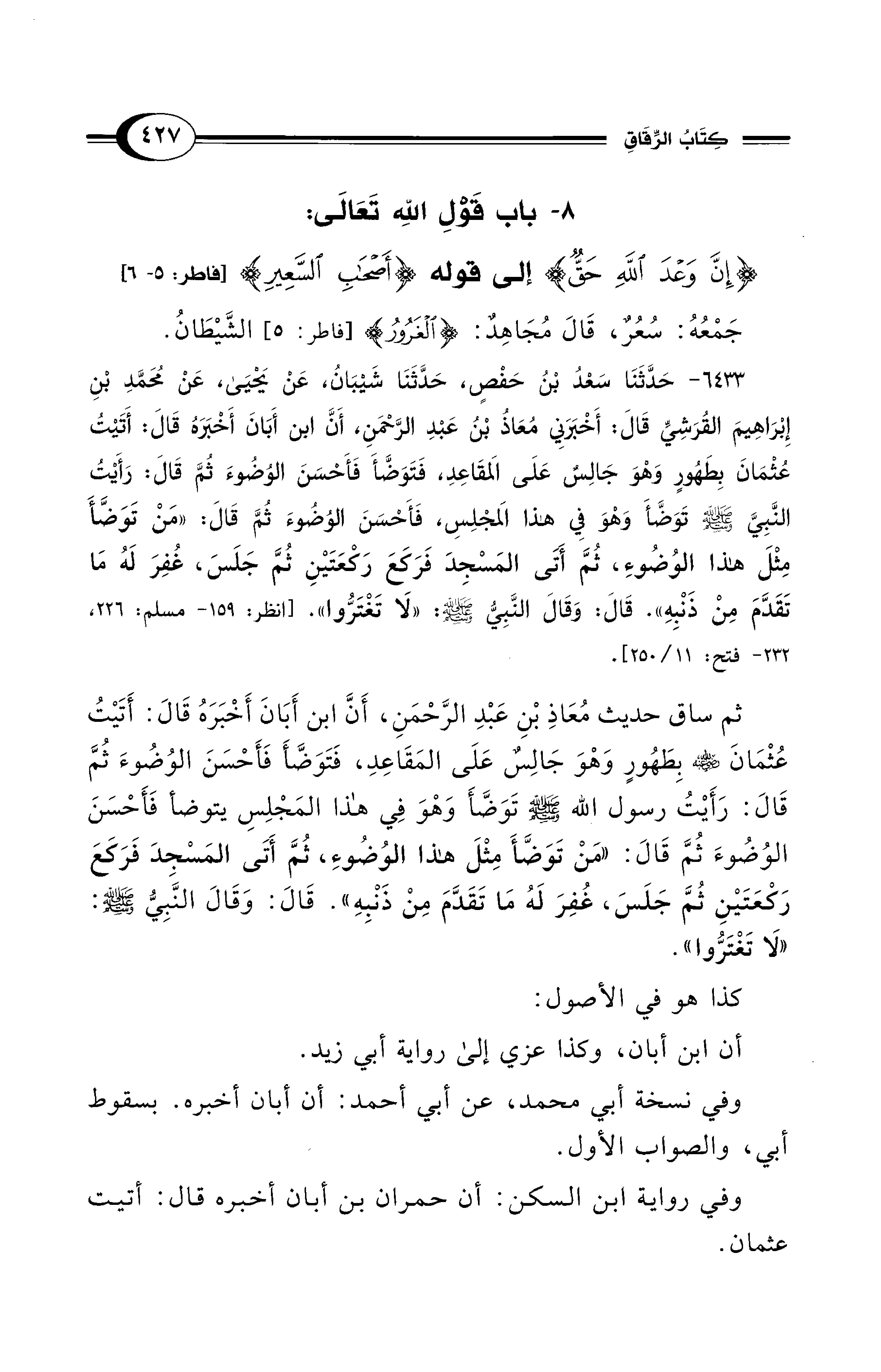 6433 - حَدَّثَنَا سَعْدُ بْنُ حَفْصٍ، حَدَّثَنَا شَيْبَانُ، عَنْ يَحْيَى، عَنْ مُحَمَّدِ بْنِ إِبْرَاهِيمَ الْقُرَشِيِّ قَالَ: أَخْبَرَنِي مُعَاذُ بْنُ عَبْدِ الرَّحْمَنِ، أَنَّ ابْنَ أَبَانَ أَخْبَرَهُ قَالَ: أَتَيْتُ عُثْمَانَ بِطَهُورٍ وَهْوَ جَالِسٌ عَلَى الْمَقَاعِدِ، فَتَوَضَّأَ فَأَحْسَنَ الْوُضُوءَ ثُمَّ قَالَ: رَأَيْتُ النَّبِيَّ - صلى الله عليه وسلم - تَوَضَّأَ وَهْوَ فِي هَذَا الْمَجْلِسِ، فَأَحْسَنَ الْوُضُوءَ ثُمَّ قَالَ: «مَنْ تَوَضَّأَ مِثْلَ هَذَا الْوُضُوءِ، ثُمَّ أَتَى الْمَسْجِدَ فَرَكَعَ رَكْعَتَيْنِ ثُمَّ جَلَسَ، غُفِرَ لَهُ مَا تَقَدَّمَ مِنْ ذَنْبِهِ». قَالَ: وَقَالَ النَّبِيُّ - صلى الله عليه وسلم -: «لاَ تَغْتَرُّوا». [انظر: 159 - مسلم: 226، 232 - فتح: 11/ 250].