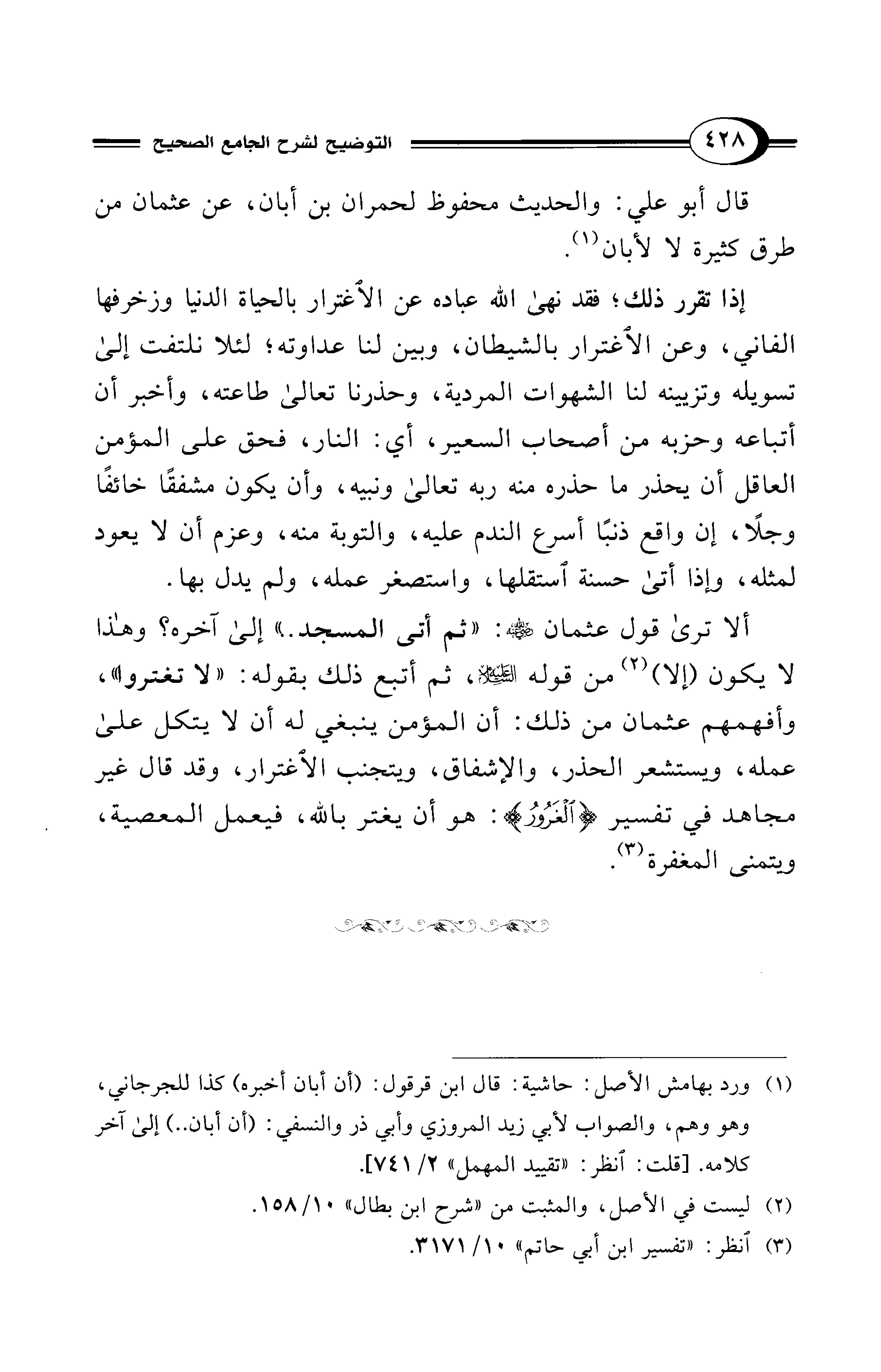ألا ترى قول عثمان - رضي الله عنه -: "ثم أتى المسجد." إلى آخره؟ وهذا لا يكون (إلا) (¬2) من قوله - عليه السلام -، ثم أتبع ذلك بقوله: "لا تغتروا"، وأفهمهم عثمان من ذلك: أن المؤمن ينبغي له أن لا يتكل على عمله، ويستشعر الحذر، والإشفاق، ويتجنب الاغترار، وقد قال غير مجاهد في تفسير {الْغَرُورُ}: هو أن يغتر بالله، فيعمل المعصية، ويتمنى المغفرة (¬3).