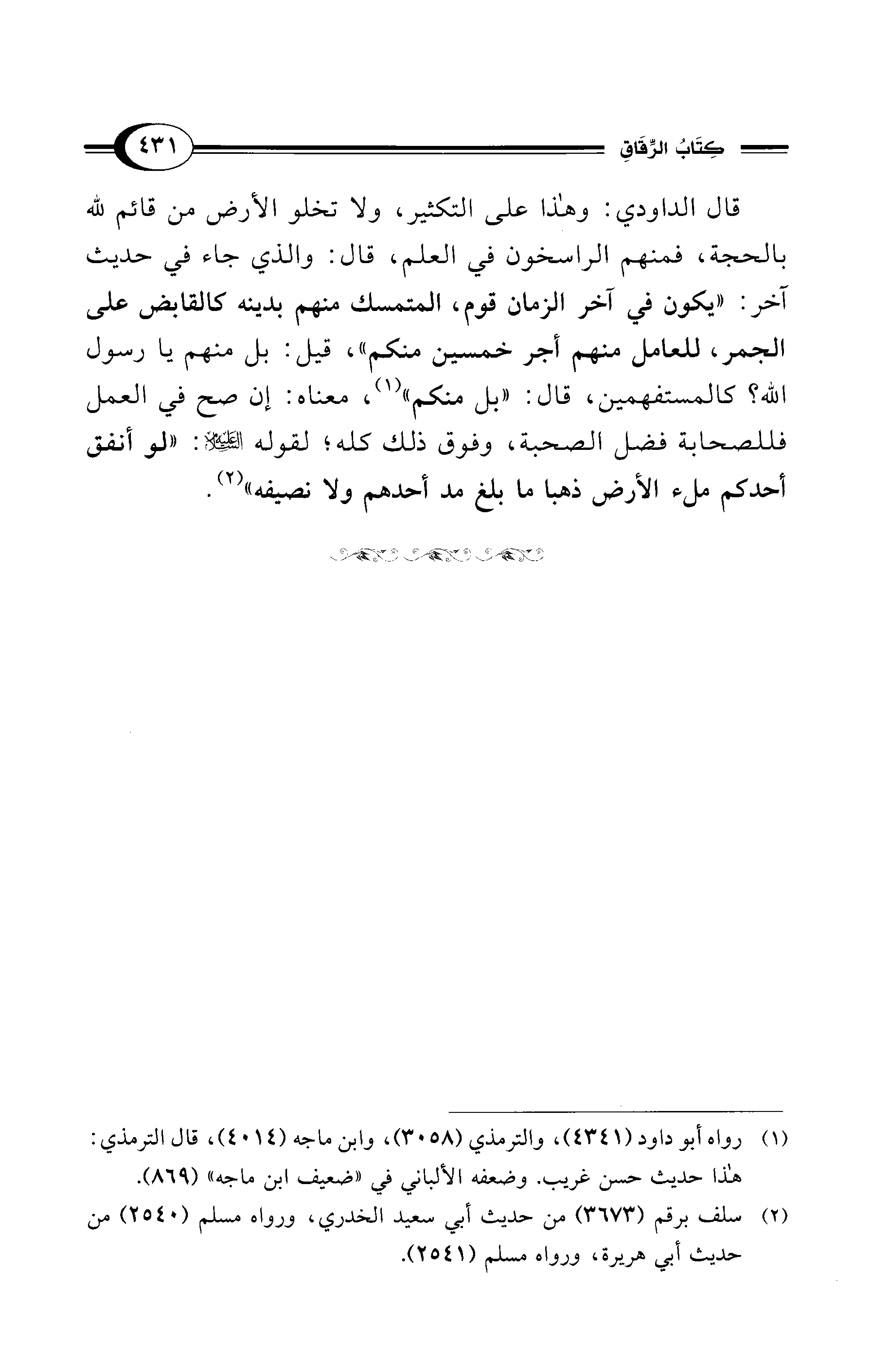 قال الداودي: وهذا على التكثير، ولا تخلو الأرض من قائم لله بالحجة، فمنهم الراسخون في العلم، قال: والذي جاء في حديث آخر: "يكون في آخر الزمان قوم، المتمسك منهم بدينه كالقابض على الجمر، للعامل منهم أجر خمسين منكم"، قيل: بل منهم يا رسول الله؟ كالمستفهمين، قال: "بل منكم" (¬1)، معناه: إن صح في العمل فللصحابة فضل الصحبة، وفوق ذلك كله؛ لقوله - عليه السلام -: "لو أنفق أحدكم ملء الأرض ذهبا ما بلغ مد أحدهم ولا نصيفه" (¬2).