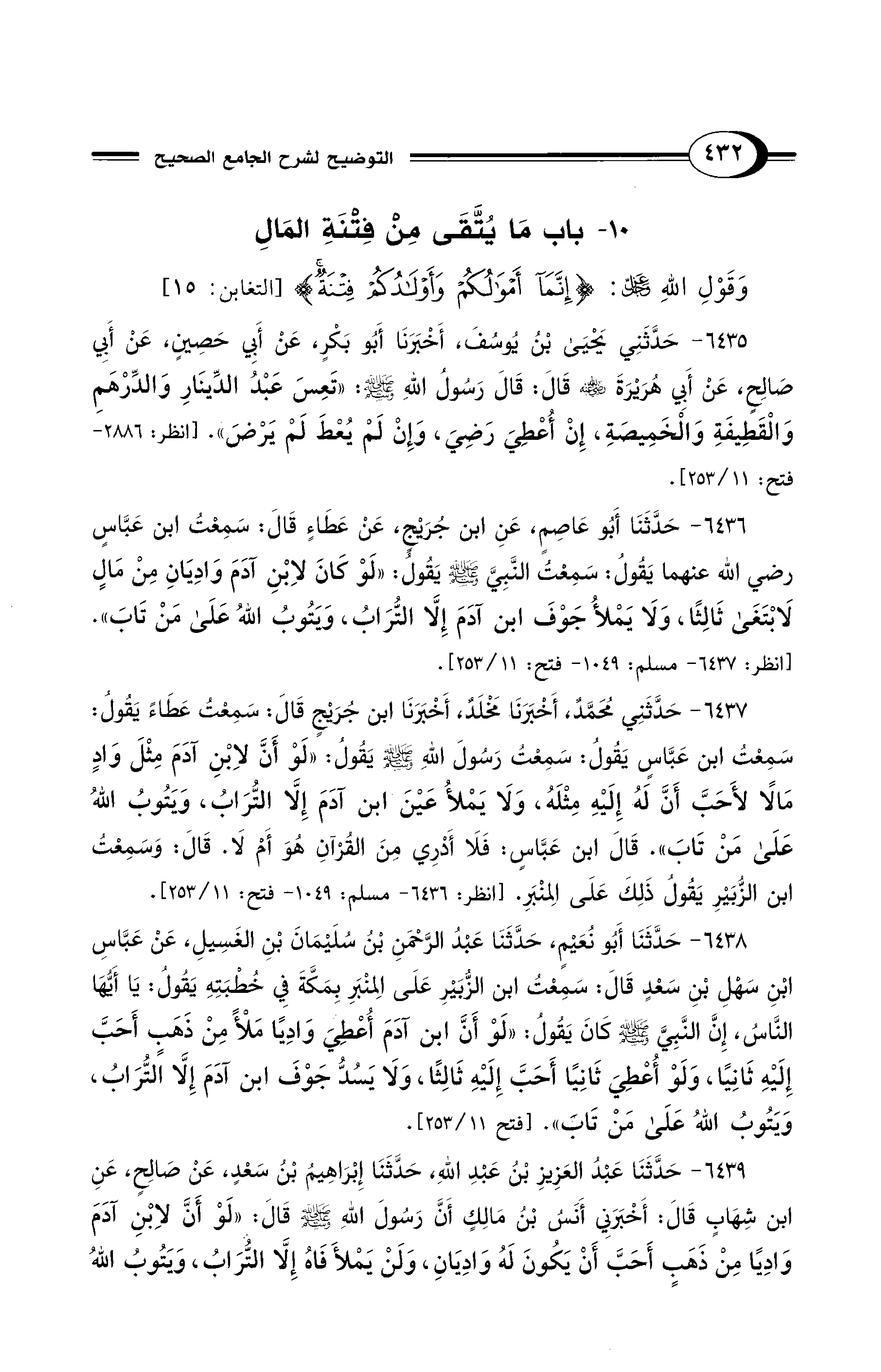 6437 - حَدَّثَنِي مُحَمَّدٌ، أَخْبَرَنَا مَخْلَدٌ، أَخْبَرَنَا ابْنُ جُرَيْجٍ قَالَ: سَمِعْتُ عَطَاءً يَقُولُ: سَمِعْتُ ابْنَ عَبَّاسٍ يَقُولُ: سَمِعْتُ رَسُولَ اللهِ - صلى الله عليه وسلم - يَقُولُ: «لَوْ أَنَّ لاِبْنِ آدَمَ مِثْلَ وَادٍ مَالاً لأَحَبَّ أَنَّ لَهُ إِلَيْهِ مِثْلَهُ، وَلاَ يَمْلأُ عَيْنَ ابْنِ آدَمَ إِلاَّ التُّرَابُ، وَيَتُوبُ اللهُ عَلَى مَنْ تَابَ». قَالَ ابْنُ عَبَّاسٍ: فَلاَ أَدْرِي مِنَ الْقُرْآنِ هُوَ أَمْ لاَ. قَالَ: وَسَمِعْتُ ابْنَ الزُّبَيْرِ يَقُولُ ذَلِكَ عَلَى المِنْبَرِ. [انظر: 6436 - مسلم: 1049 - فتح: 11/ 253].