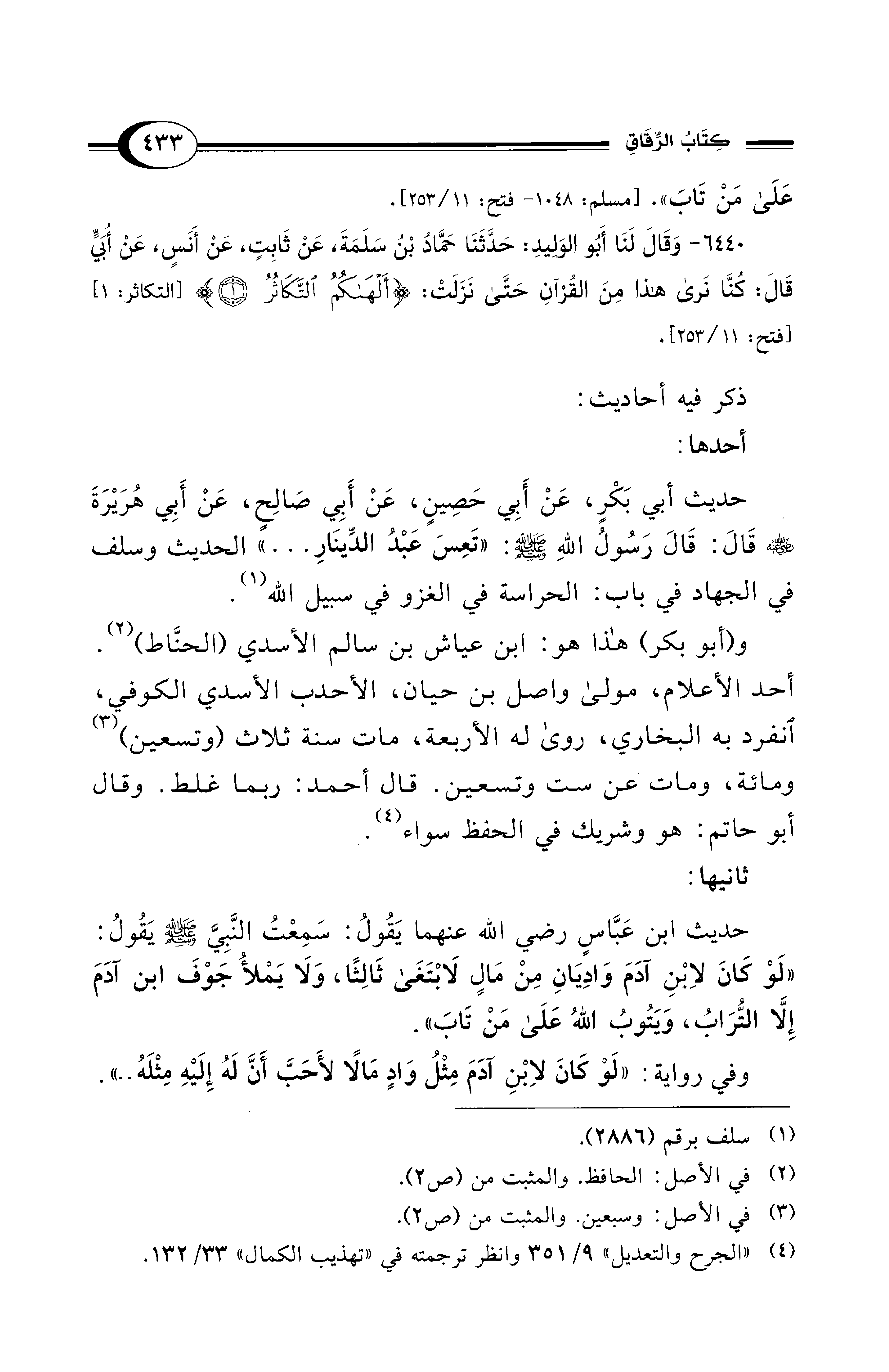 6440 - وَقَالَ لَنَا أَبُو الْوَلِيدِ: حَدَّثَنَا حَمَّادُ بْنُ سَلَمَةَ، عَنْ ثَابِتٍ، عَنْ أَنَسٍ، عَنْ أُبَيٍّ قَالَ: كُنَّا نَرَى هَذَا مِنَ الْقُرْآنِ حَتَّى نَزَلَتْ: {أَلْهَاكُمُ التَّكَاثُرُ (1)}. [التكاثر: 1] [فتح: 11/ 253].