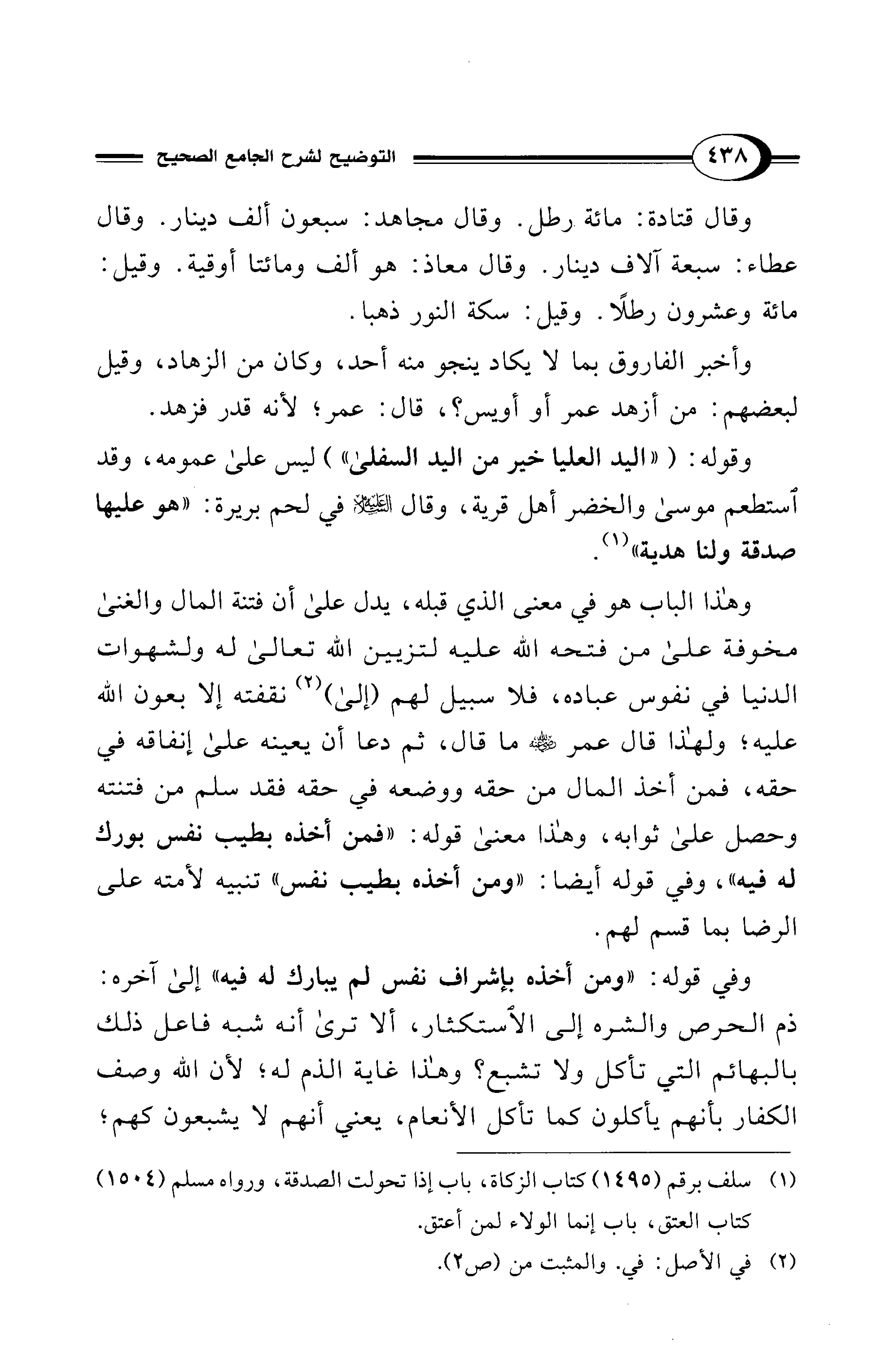 وقال قتادة: مائة رطل. وقال مجاهد: سبعون ألف دينار. وقال عطاء: سبعة آلاف دينار. وقال معاذ: هو ألف ومائتا أوقية. وقيل: مائة وعشرون رطلًا. وقيل: سكة النور ذهبا.