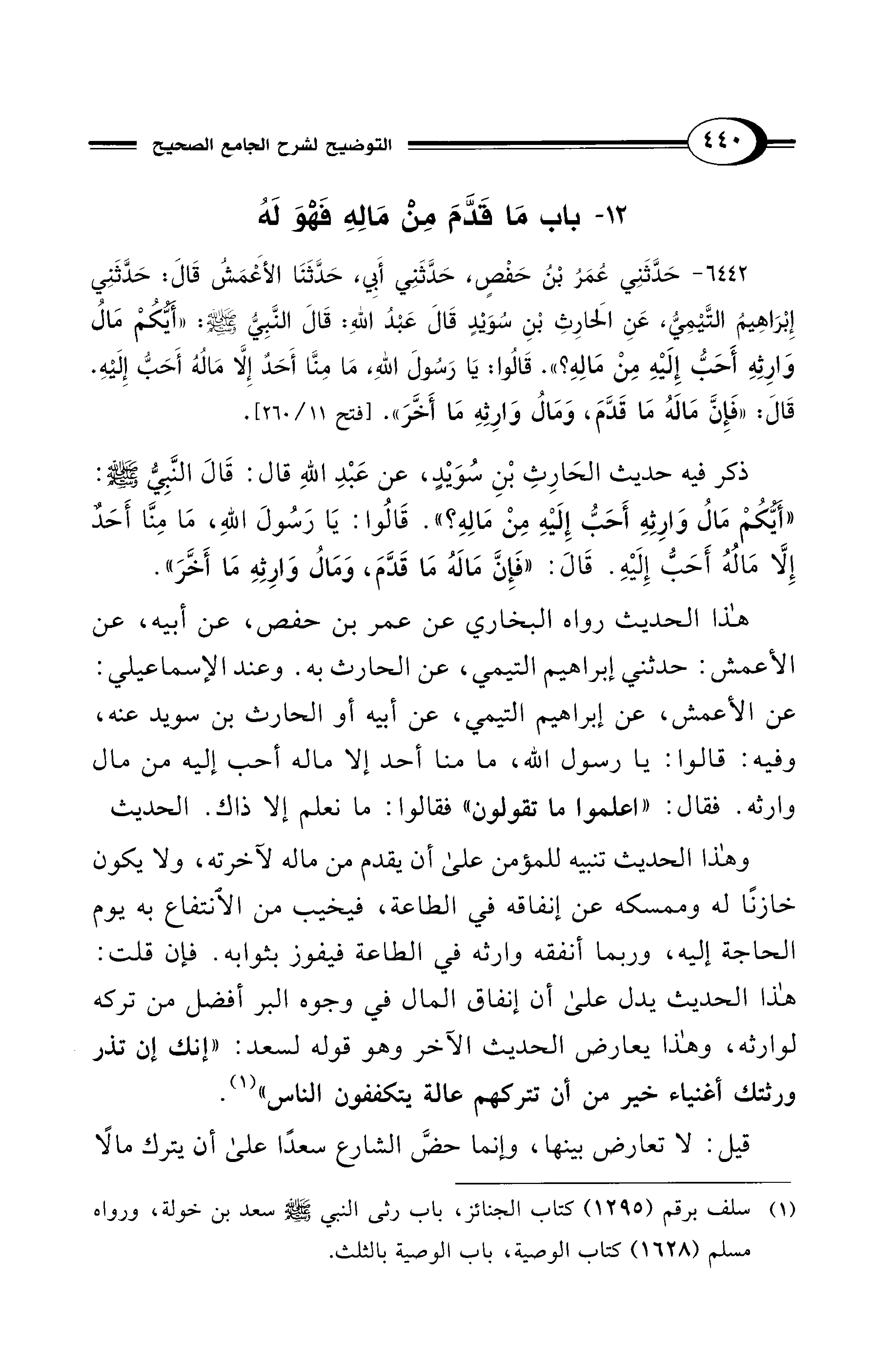 6442 - حَدَّثَنِي عُمَرُ بْنُ حَفْصٍ، حَدَّثَنِي أَبِي، حَدَّثَنَا الأَعْمَشُ قَالَ: حَدَّثَنِي إِبْرَاهِيمُ التَّيْمِيُّ، عَنِ الْحَارِثِ بْنِ سُوَيْدٍ قَالَ عَبْدُ اللهِ: قَالَ النَّبِيُّ - صلى الله عليه وسلم -: «أَيُّكُمْ مَالُ وَارِثِهِ أَحَبُّ إِلَيْهِ مِنْ مَالِهِ؟». قَالُوا: يَا رَسُولَ اللهِ، مَا مِنَّا أَحَدٌ إِلاَّ مَالُهُ أَحَبُّ إِلَيْهِ. قَالَ: «فَإِنَّ مَالَهُ مَا قَدَّمَ، وَمَالُ وَارِثِهِ مَا أَخَّرَ». [فتح 11/ 260].