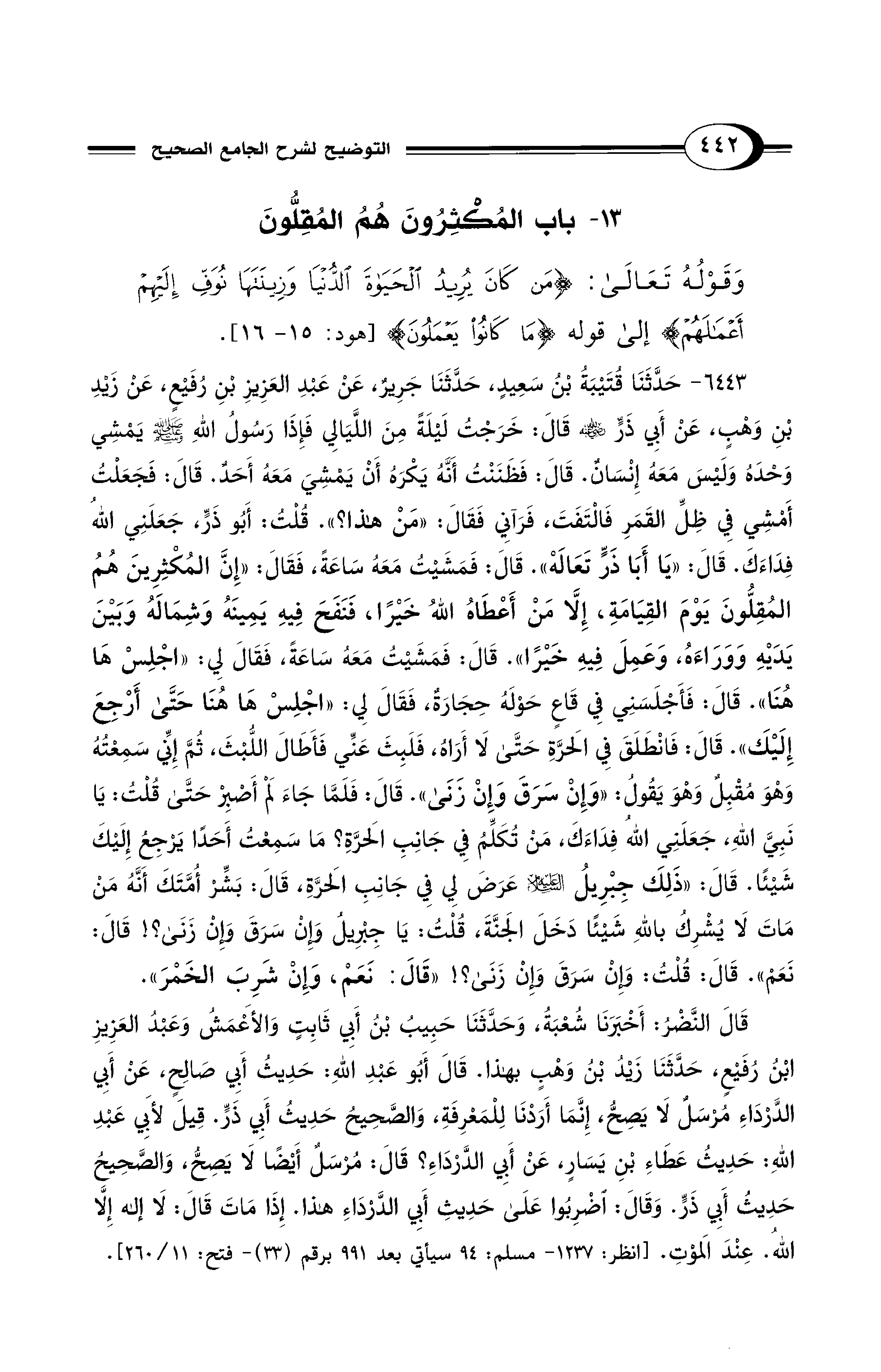 6443 - حَدَّثَنَا قُتَيْبَةُ بْنُ سَعِيدٍ، حَدَّثَنَا جَرِيرٌ، عَنْ عَبْدِ الْعَزِيزِ بْنِ رُفَيْعٍ، عَنْ زَيْدِ بْنِ وَهْبٍ، عَنْ أَبِي ذَرٍّ - رضي الله عنه - قَالَ: خَرَجْتُ لَيْلَةً مِنَ اللَّيَالِي فَإِذَا رَسُولُ اللهِ - صلى الله عليه وسلم - يَمْشِي وَحْدَهُ وَلَيْسَ مَعَهُ إِنْسَانٌ. قَالَ: فَظَنَنْتُ أَنَّهُ يَكْرَهُ أَنْ يَمْشِيَ مَعَهُ أَحَدٌ. قَالَ: فَجَعَلْتُ أَمْشِي فِي ظِلِّ الْقَمَرِ فَالْتَفَتَ، فَرَآنِي فَقَالَ: «مَنْ هَذَا؟». قُلْتُ: أَبُو ذَرٍّ، جَعَلَنِي اللهُ فِدَاءَكَ. قَالَ: «يَا أَبَا ذَرٍّ تَعَالَهْ». قَالَ: فَمَشَيْتُ مَعَهُ سَاعَةً، فَقَالَ: «إِنَّ المُكْثِرِينَ هُمُ المُقِلُّونَ يَوْمَ الْقِيَامَةِ، إِلاَّ مَنْ أَعْطَاهُ اللهُ خَيْرًا، فَنَفَحَ فِيهِ يَمِينَهُ وَشِمَالَهُ وَبَيْنَ يَدَيْهِ وَوَرَاءَهُ، وَعَمِلَ فِيهِ خَيْرًا». قَالَ: فَمَشَيْتُ مَعَهُ سَاعَةً، فَقَالَ لِي: «اجْلِسْ هَا هُنَا». قَالَ: فَأَجْلَسَنِي فِي قَاعٍ حَوْلَهُ حِجَارَةٌ، فَقَالَ لِي: «اجْلِسْ هَا هُنَا حَتَّى أَرْجِعَ إِلَيْكَ». قَالَ: فَانْطَلَقَ فِي الْحَرَّةِ حَتَّى لاَ أَرَاهُ، فَلَبِثَ عَنِّي فَأَطَالَ اللُّبْثَ، ثُمَّ إِنِّي سَمِعْتُهُ وَهْوَ مُقْبِلٌ وَهْوَ يَقُول: «وَإِنْ سَرَقَ وَإِنْ زَنَى». قَالَ: فَلَمَّا جَاءَ لَمْ أَصْبِرْ حَتَّى قُلْتُ: يَا نَبِيَّ اللهِ، جَعَلَنِي اللهُ فِدَاءَكَ، مَنْ تُكَلِّمُ فِي جَانِبِ الحَرَّةِ؟ مَا سَمِعْتُ أَحَدًا يَرْجِعُ إِلَيْكَ شَيْئًا. قَالَ: «ذَلِكَ جِبْرِيلُ - عَلَيْهِ السَّلاَمُ - عَرَضَ لِي فِي جَانِبِ الحَرَّةِ، قَالَ: بَشِّرْ أُمَّتَكَ أَنَّهُ مَنْ مَاتَ لاَ يُشْرِكُ بِاللهِ شَيْئًا دَخَلَ الْجَنَّةَ، قُلْتُ: يَا جِبْرِيلُ وَإِنْ سَرَقَ وَإِنْ زَنَى؟! قَالَ: نَعَمْ. قَالَ: قُلْتُ: وَإِنْ سَرَقَ وَإِنْ زَنَى؟! "قَالَ: نَعَمْ، وَإِنْ شَرِبَ الْخَمْرَ».