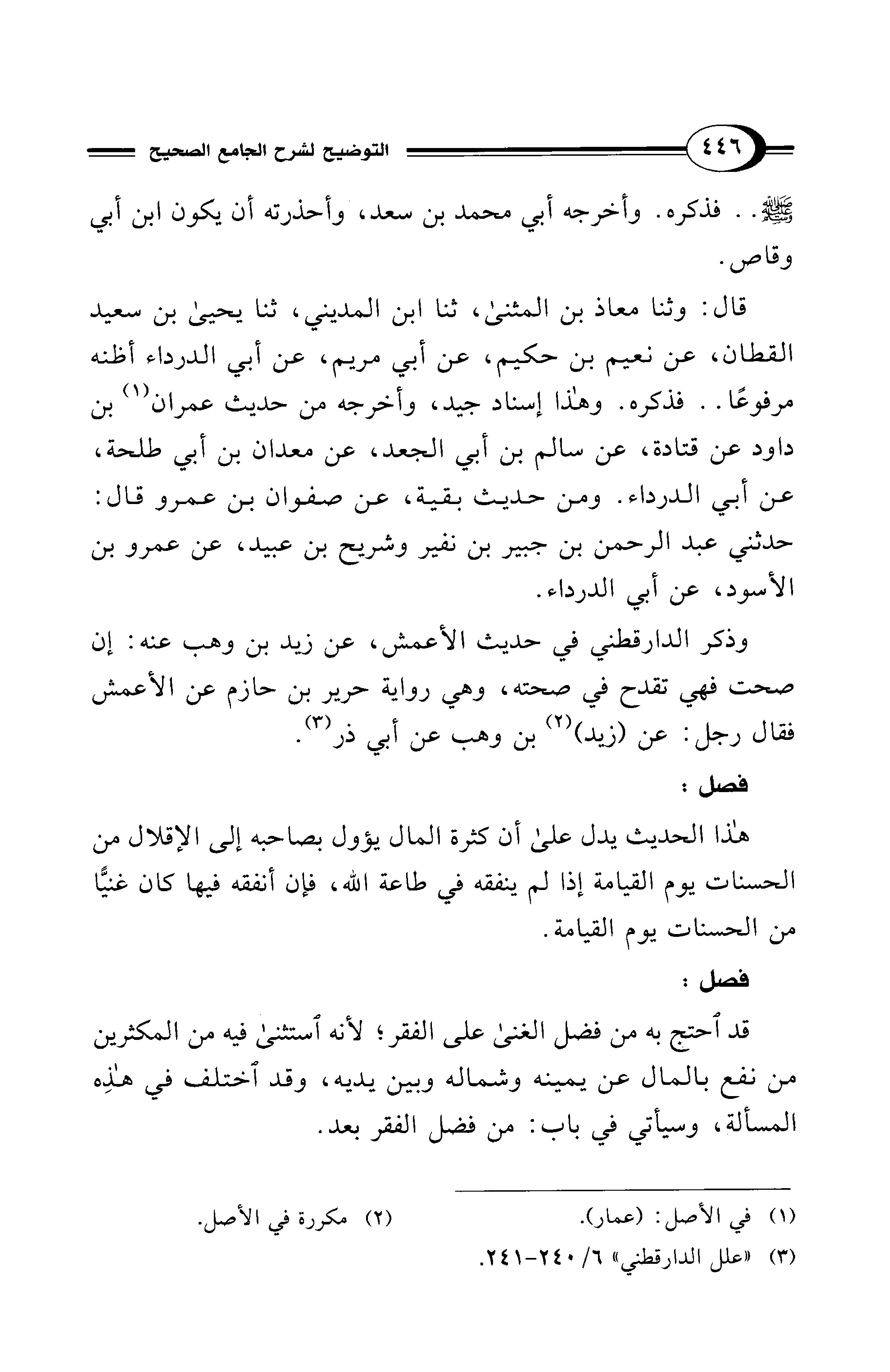 قال: وثنا معاذ بن المثنى، ثنا ابن المديني، ثنا يحيى بن سعيد القطان، عن نعيم بن حكيم، عن أبي مريم، عن أبي الدرداء أظنه مرفوعًا .. فذكره. وهذا إسناد جيد، وأخرجه من حديث عمران (¬1) بن داود عن قتادة، عن سالم بن أبي الجعد، عن معدان بن أبي طلحة، عن أبي الدرداء. ومن حديث بقية، عن صفوان بن عمرو قال: حدثني عبد الرحمن بن جبير بن نفير وشريح بن عبيد، عن عمرو بن الأسود، عن أبي الدرداء.