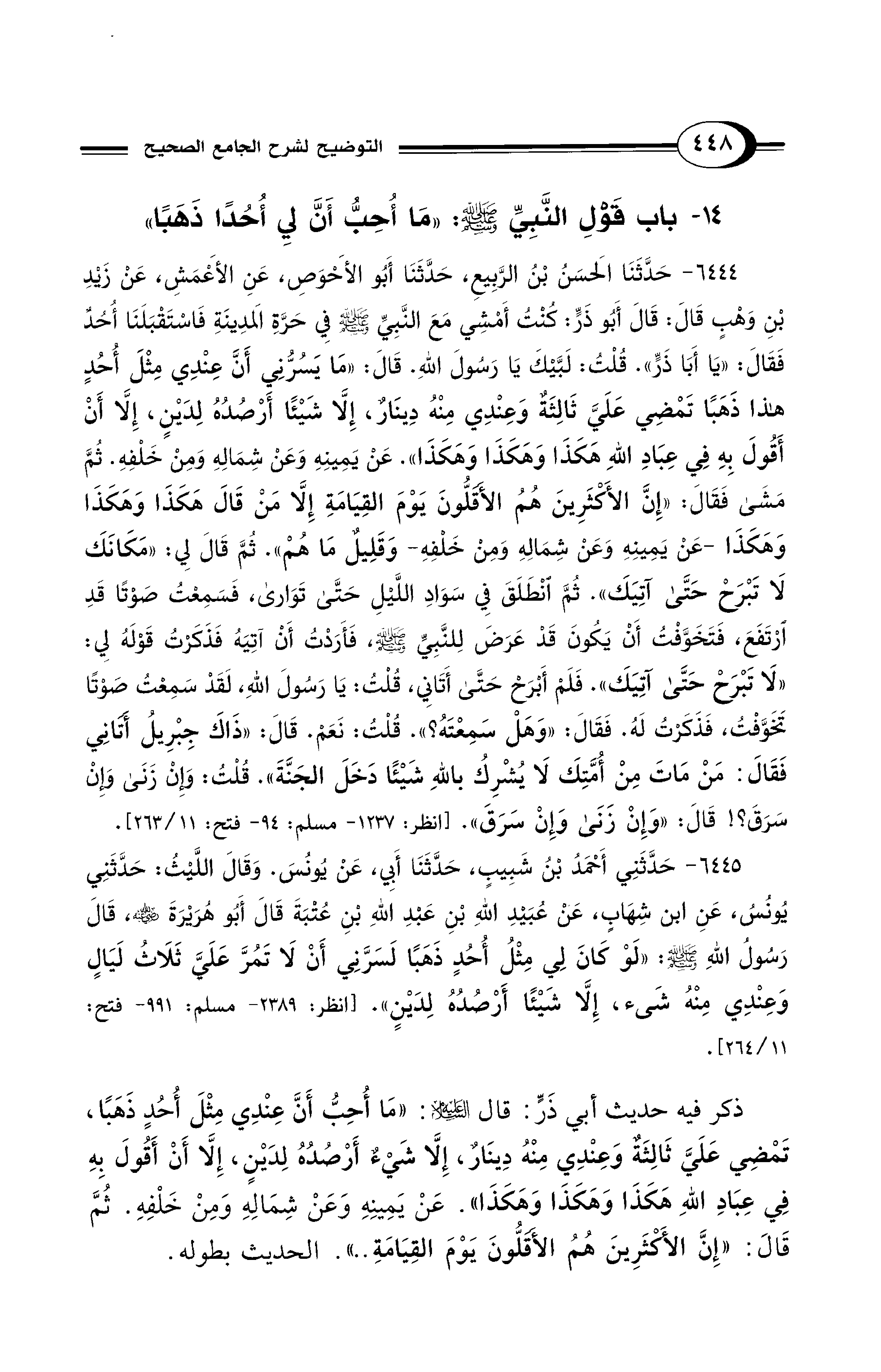 ذكر فيه حديث أبي ذَرٍّ: قال - عليه السلام -: "مَا أُحِبُّ أَنَّ عِنْدِي مِثْلَ أُحُدٍ ذَهَبًا، تَمْضِي عَلَيَّ ثَالِثَةٌ وَعِنْدِي مِنْهُ دِينَارٌ، إِلَّا شَيْءٌ أَرْصُدُهُ لِدَيْنٍ، إِلَّا أَنْ أَقُولَ بِهِ فِي عِبَادِ اللهِ هَكَذَا وَهَكَذَا وَهَكَذَا". عَنْ يَمِينِهِ وَعَنْ شِمَالِهِ وَمِنْ خَلْفِهِ. ثُمَّ قَالَ: "إِنَّ الأَكْثَرِينَ هُمُ الأَقَلُّونَ يَوْمَ القِيَامَةِ .. ". الحديث بطوله.