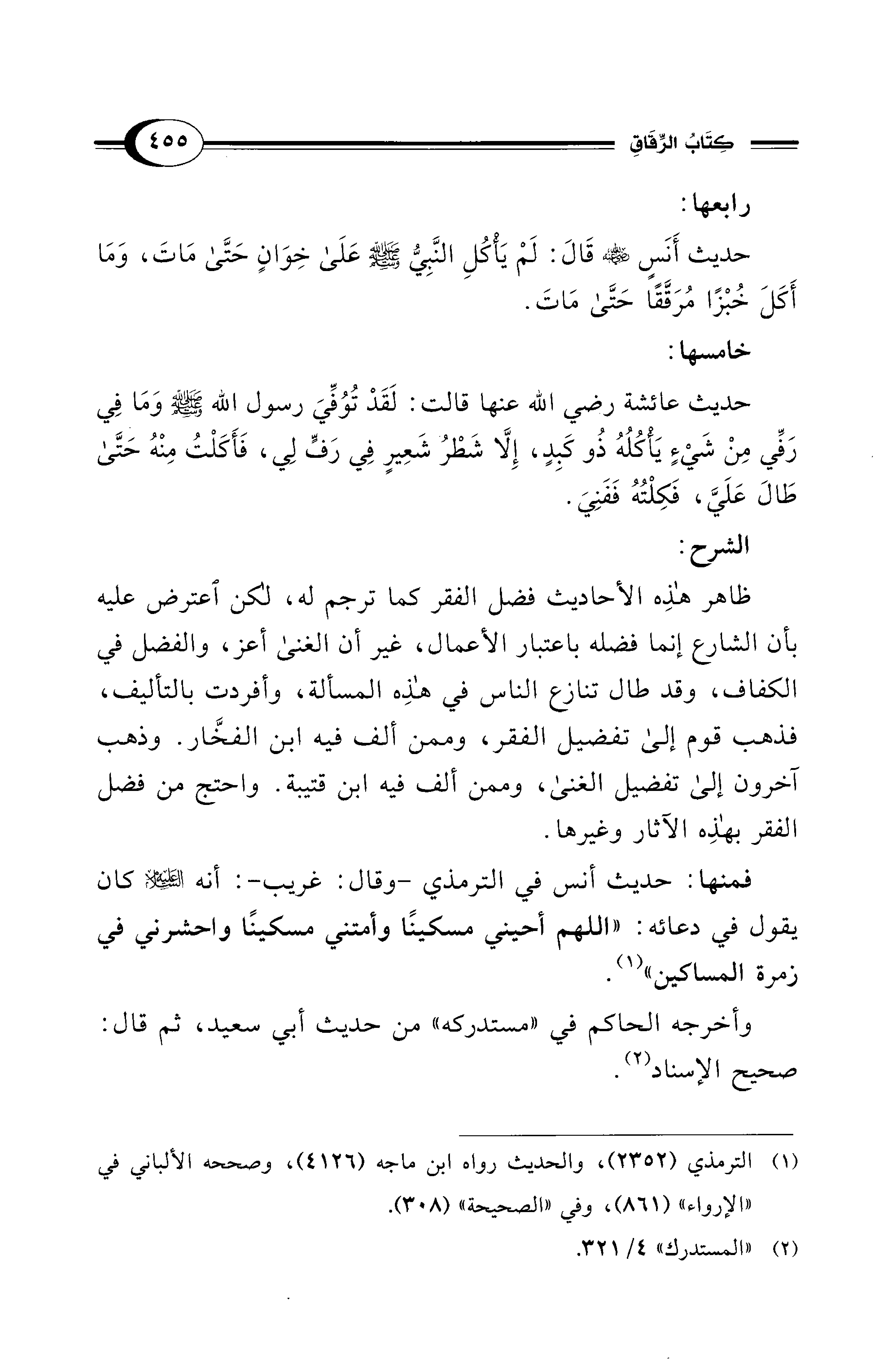 ظاهر هذِه الأحاديث فضل الفقر كما ترجم له، لكن اعترض عليه بأن الشارع إنما فضله باعتبار الأعمال، غير أن الغنى أعز، والفضل في الكفاف، وقد طال تنازع الناس في هذِه المسألة، وأفردت بالتأليف، فذهب قوم إلى تفضيل الفقر، وممن ألف فيه ابن الفخَّار. وذهب آخرون إلى تفضيل الغنى، وممن ألف فيه ابن قتيبة. واحتج من فضل الفقر بهذِه الآثار وغيرها.