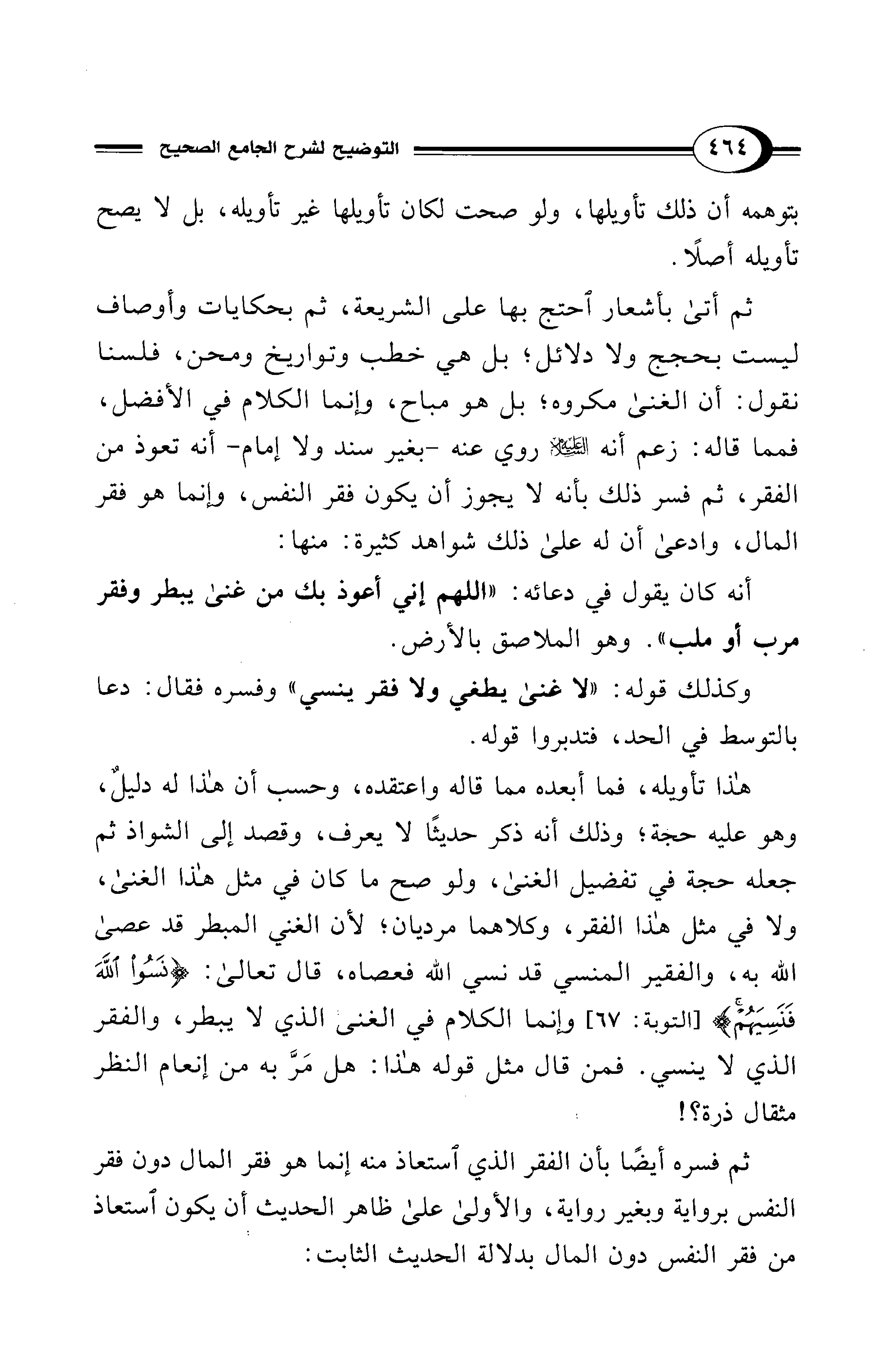 هذا تأويله، فما أبعده مما قاله واعتقده، وحسب أن هذا له دليلٌ، وهو عليه حجة؛ وذلك أنه ذكر حديثًا لا يعرف، وقصد إلى الشواذ ثم جعله حجة في تفضيل الغنى، ولو صح ما كان في مثل هذا الغنى، ولا في مثل هذا الفقر، وكلاهما مرديان؛ لأن الغني المبطر قد عصى الله به، والفقير المنسي قد نسي الله فعصاه، قال تعالى: {نَسُوا اللهَ فَنَسِيَهُمْ} [التوبة: 67] وإنما الكلام في الغنى الذي لا يبطر، والفقر الذي لا ينسي. فمن قال مثل قوله هذا: هل مَرَّ به من إنعام النظر مثقال ذرة؟!: