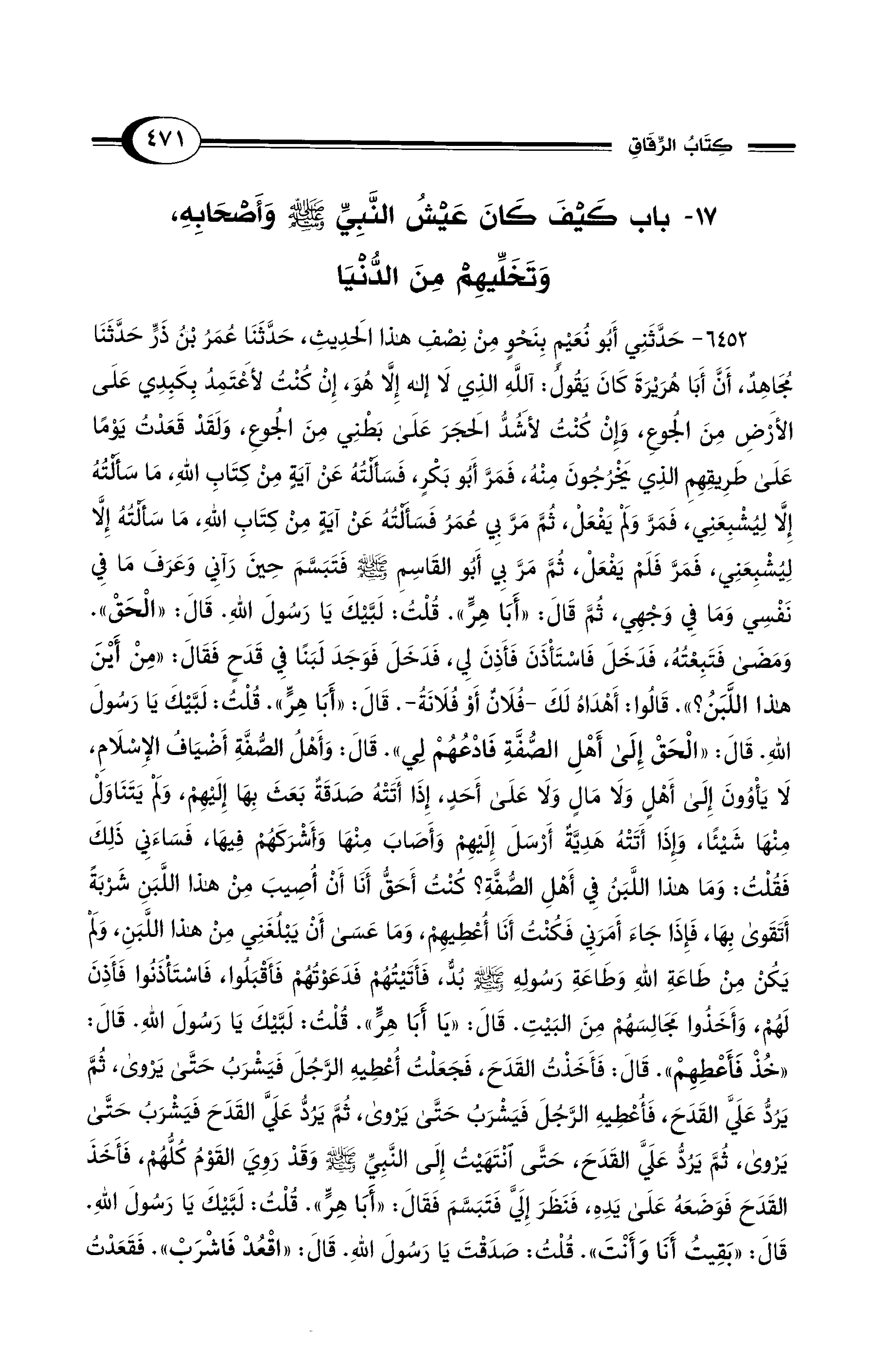6452 - حَدَّثَنِي أَبُو نُعَيْمٍ بِنَحْوٍ مِنْ نِصْفِ هَذَا الْحَدِيثِ، حَدَّثَنَا عُمَرُ بْنُ ذَرٍّ حَدَّثَنَا مُجَاهِدٌ، أَنَّ أَبَا هُرَيْرَةَ كَانَ يَقُولُ: آللَّهِ الَّذِي لاَ إِلَهَ إِلاَّ هُوَ، إِنْ كُنْتُ لأَعْتَمِدُ بِكَبِدِي عَلَى الأَرْضِ مِنَ الْجُوعِ، وَإِنْ كُنْتُ لأَشُدُّ الْحَجَرَ عَلَى بَطْنِي مِنَ الْجُوعِ، وَلَقَدْ قَعَدْتُ يَوْمًا على طَرِيقِهِمُ الَّذِي يَخْرُجُونَ مِنْهُ، فَمَرَّ أَبُو بَكْرٍ، فَسَأَلْتُهُ عَنْ آيَةٍ مِنْ كِتَابِ اللهِ، مَا سَأَلْتُهُ إِلاَّ لِيُشْبِعَنِي، فَمَرَّ وَلَمْ يَفْعَلْ، ثُمَّ مَرَّ بِي عُمَرُ فَسَأَلْتُهُ عَنْ آيَةٍ مِنْ كِتَابِ اللهِ، مَا سَأَلْتُهُ إِلاَّ لِيُشْبِعَنِي، فَمَرَّ فَلَمْ يَفْعَلْ، ثُمَّ مَرَّ بِي أَبُو الْقَاسِمِ - صلى الله عليه وسلم - فَتَبَسَّمَ حِينَ رَآنِي وَعَرَفَ مَا فِي نَفْسِي وَمَا فِي وَجْهِي، ثُمَّ قَالَ: «أَبَا هِرٍّ». قُلْتُ: لَبَّيْكَ يَا رَسُولَ اللهِ. قَالَ: «الْحَقْ». وَمَضَى فَتَبِعْتُهُ، فَدَخَلَ فَاسْتَأْذَنَ فَأَذِنَ لِي، فَدَخَلَ فَوَجَدَ لَبَنًا فِي قَدَحٍ فَقَالَ: «مِنْ أَيْنَ هَذَا اللَّبَنُ؟». قَالُوا: أَهْدَاهُ لَكَ -فُلاَنٌ أَوْ فُلاَنَةُ-. قَالَ: «أَبَا هِرٍّ». قُلْتُ: لَبَّيْكَ يَا رَسُولَ اللهِ. قَالَ: «الْحَقْ إِلَى أَهْلِ الصُّفَّةِ فَادْعُهُمْ لِي». قَالَ: وَأَهْلُ الصُّفَّةِ أَضْيَافُ الإِسْلاَمِ، لاَ يَأْوُونَ إِلَى أَهْلٍ وَلاَ مَالٍ وَلاَ عَلَى أَحَدٍ، إِذَا أَتَتْهُ صَدَقَةٌ بَعَثَ بِهَا إِلَيْهِمْ، وَلَمْ يَتَنَاوَلْ مِنْهَا شَيْئًا، وَإِذَا أَتَتْهُ هَدِيَّةٌ أَرْسَلَ إِلَيْهِمْ وَأَصَابَ مِنْهَا وَأَشْرَكَهُمْ فِيهَا، فَسَاءَنِي ذَلِكَ فَقُلْتُ: وَمَا هَذَا اللَّبَنُ فِي أَهْلِ الصُّفَّةِ؟ كُنْتُ أَحَقُّ أَنَا أَنْ أُصِيبَ مِنْ هَذَا اللَّبَنِ شَرْبَةً أَتَقَوَّى بِهَا، فَإِذَا جَاءَ أَمَرَنِي فَكُنْتُ أَنَا أُعْطِيهِمْ، وَمَا عَسَى أَنْ يَبْلُغَنِي مِنْ هَذَا اللَّبَنِ، وَلَمْ يَكُنْ مِنْ طَاعَةِ اللهِ وَطَاعَةِ رَسُولِهِ - صلى الله عليه وسلم - بُدٌّ، فَأَتَيْتُهُمْ فَدَعَوْتُهُمْ فَأَقْبَلُوا، فَاسْتَأْذَنُوا فَأَذِنَ لَهُمْ، وَأَخَذُوا مَجَالِسَهُمْ مِنَ الْبَيْتِ. قَالَ: «يَا أَبَا هِرٍّ». قُلْتُ: لَبَّيْكَ يَا رَسُولَ اللهِ. قَالَ: «خُذْ فَأَعْطِهِمْ». قَالَ: فَأَخَذْتُ الْقَدَحَ، فَجَعَلْتُ أُعْطِيهِ الرَّجُلَ فَيَشْرَبُ حَتَّى يَرْوَى، ثُمَّ يَرُدُّ عَلَيَّ الْقَدَحَ، فَأُعْطِيهِ الرَّجُلَ فَيَشْرَبُ حَتَّى يَرْوَى، ثُمَّ يَرُدُّ عَلَيَّ الْقَدَحَ فَيَشْرَبُ حَتَّى يَرْوَى، ثُمَّ يَرُدُّ عَلَيَّ الْقَدَحَ، حَتَّى انْتَهَيْتُ إِلَى النَّبِيِّ - صلى الله عليه وسلم - وَقَدْ رَوِىَ الْقَوْمُ كُلُّهُمْ، فَأَخَذَ الْقَدَحَ فَوَضَعَهُ عَلَى يَدِهِ، فَنَظَرَ إِلَيَّ فَتَبَسَّمَ فَقَالَ: «أَبَا هِرٍّ». قُلْتُ: لَبَّيْكَ يَا رَسُولَ اللهِ. قَالَ: «بَقِيتُ أَنَا وَأَنْتَ». قُلْتُ: صَدَقْتَ يَا رَسُولَ اللهِ. قَالَ: «اقْعُدْ فَاشْرَبْ». فَقَعَدْتُ